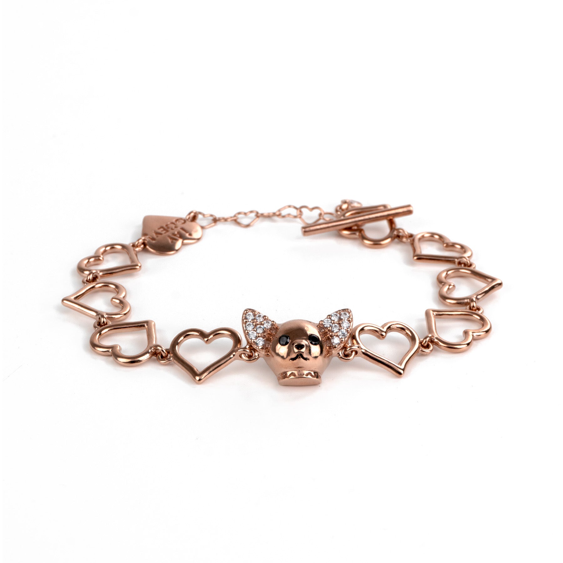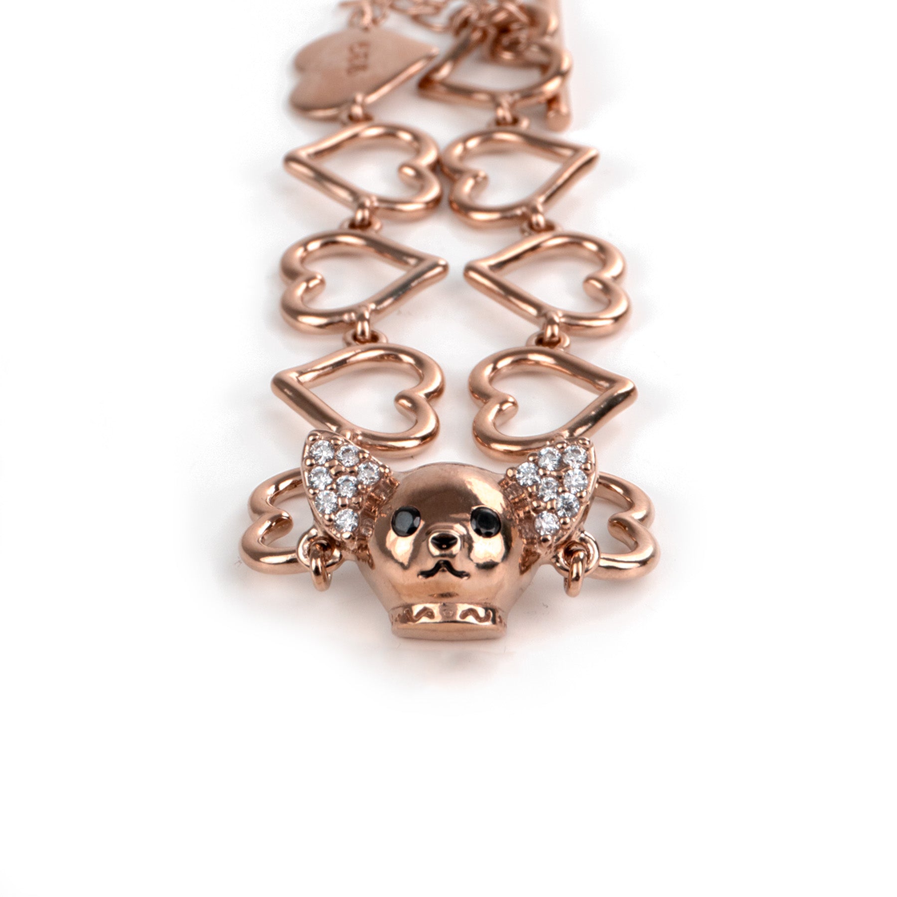 Hermosa pulsera de plata con dije en forma de perrito chihuahua con baño de oro rosa. Cuenta con un mecanismo para ajustarla a la muñeca.