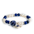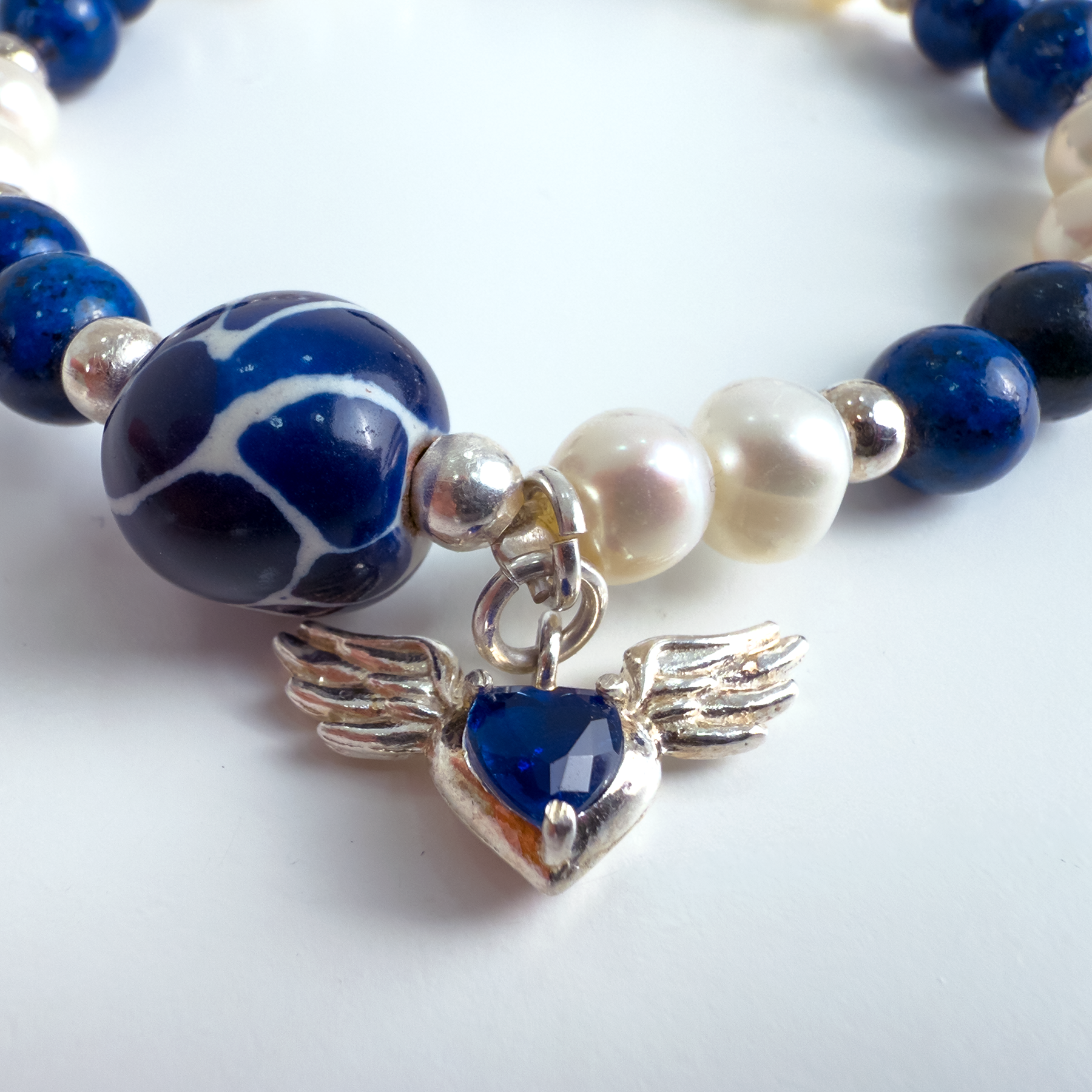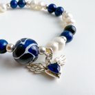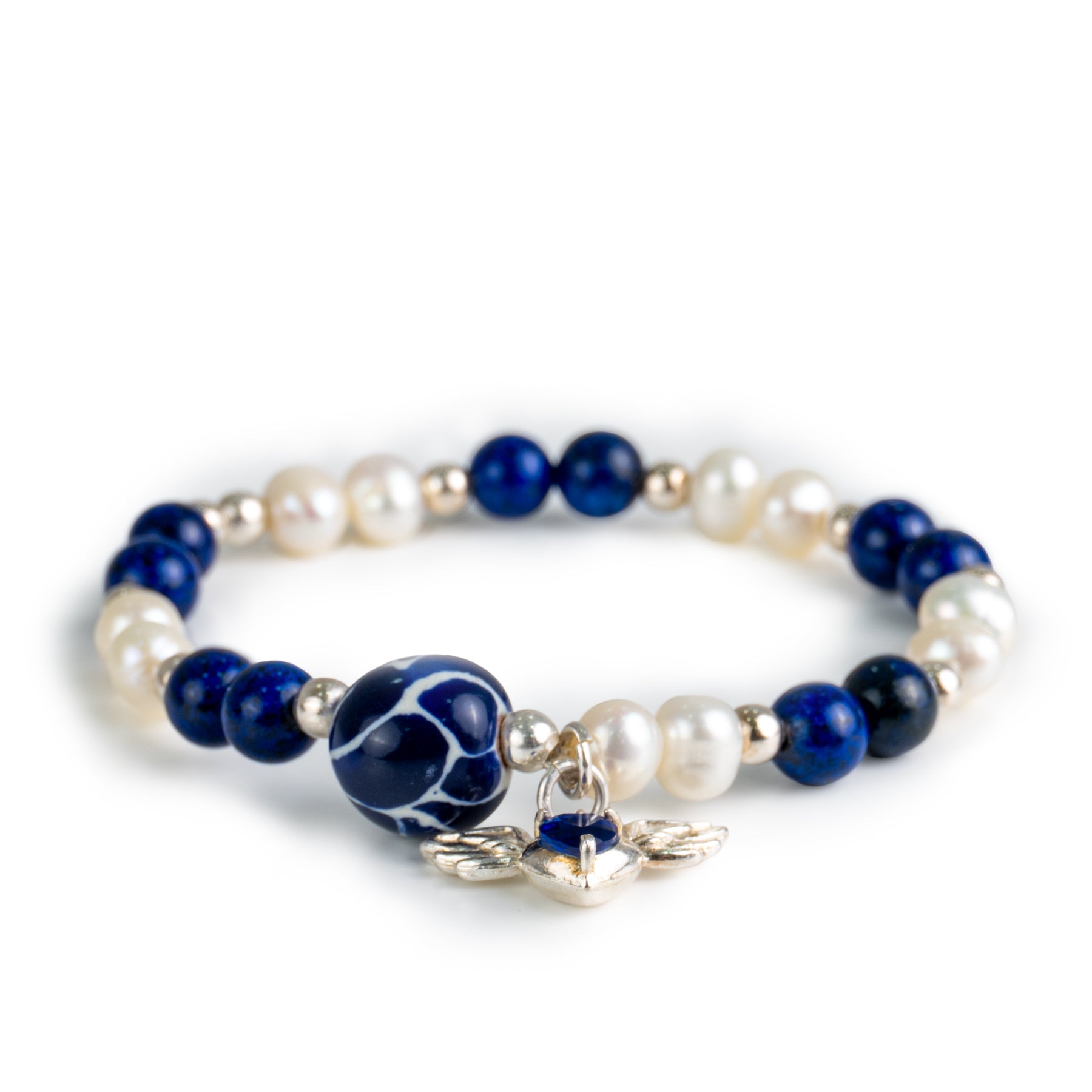 Pulsera elástica con cuentas de lapislázuli de color azul profundo y perlas naturales blancas. Incorpora una cuenta central de cerámica vidriada azul con vetas blancas y un dije colgante de plata con forma de corazón alado.