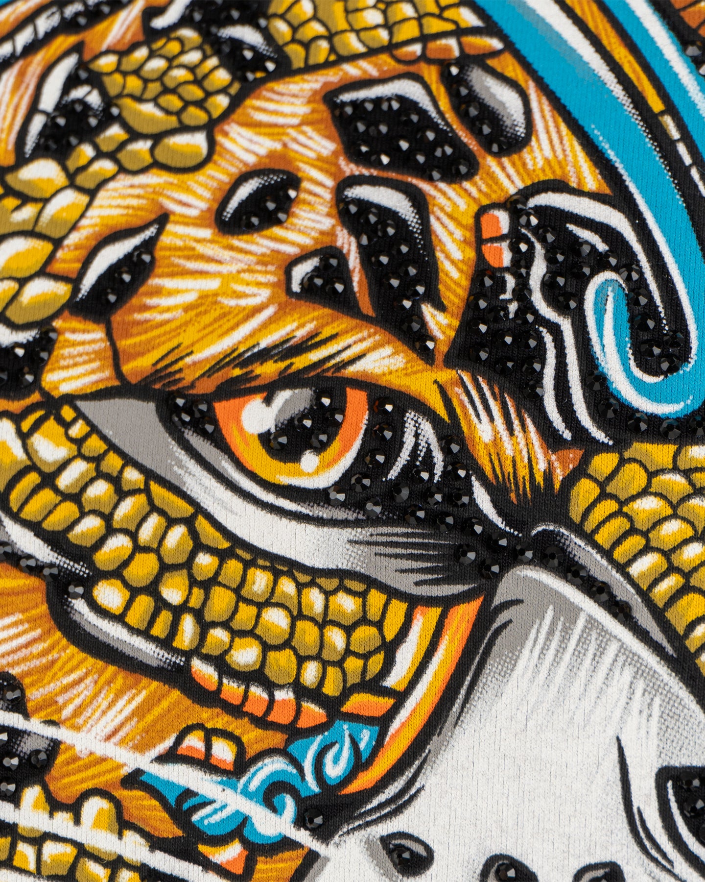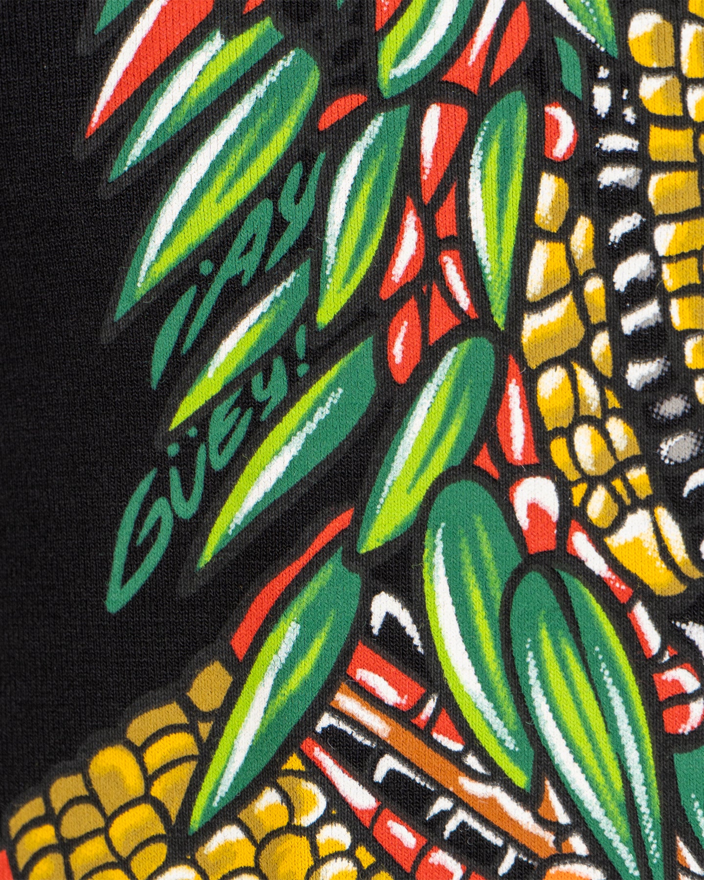 Esta prenda está inspirada en la majestuosidad del jaguar, símbolo sagrado de poder, fuerza y misticismo en las culturas prehispánicas de Mesoamérica. El diseño combina elementos visuales que evocan el arte de los mosaicos indígenas, integrando detalles que representan el maíz, hojas y flores, los cuales reflejan la profunda conexión entre el jaguar y la naturaleza, así como su rol como guardián de la selva y protector espiritual.