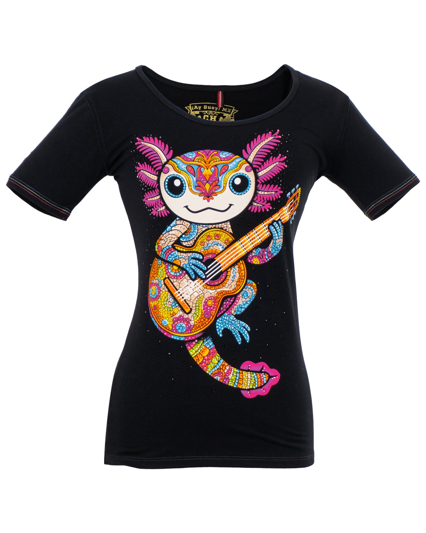 Luce la magia de México con tu playera Tololoche. Un diseño único inspirado en el ajolote y el arte del vitral, que celebra nuestra identidad mexicana a través de símbolos culturales y la esencia vibrante de nuestra música.
