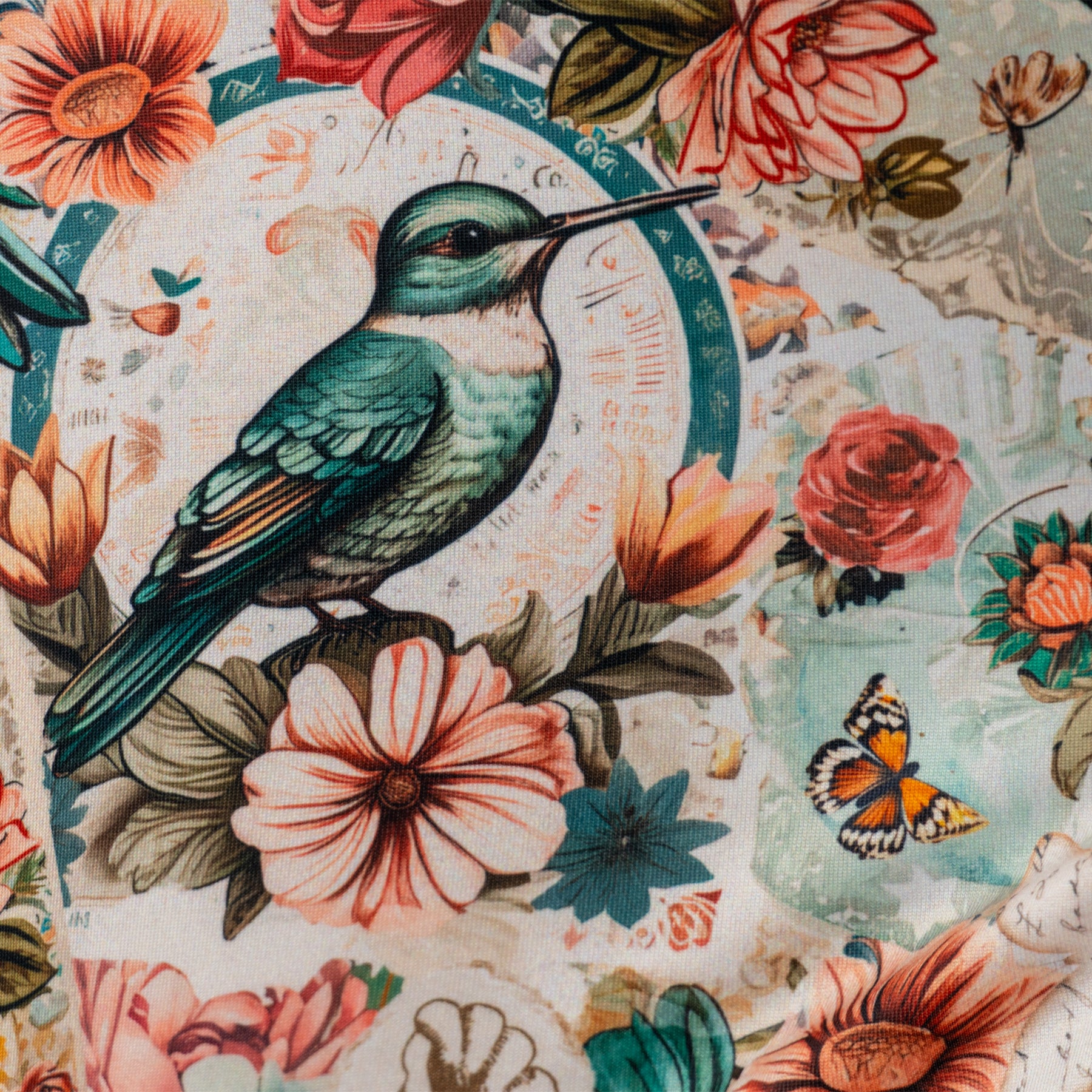 Vestido de dama con manga corta. sublimado. El dibujo transmite una sensación de armonía entre la belleza y la naturaleza, capturando la belleza y la conexión profunda de la dama con su entorno.