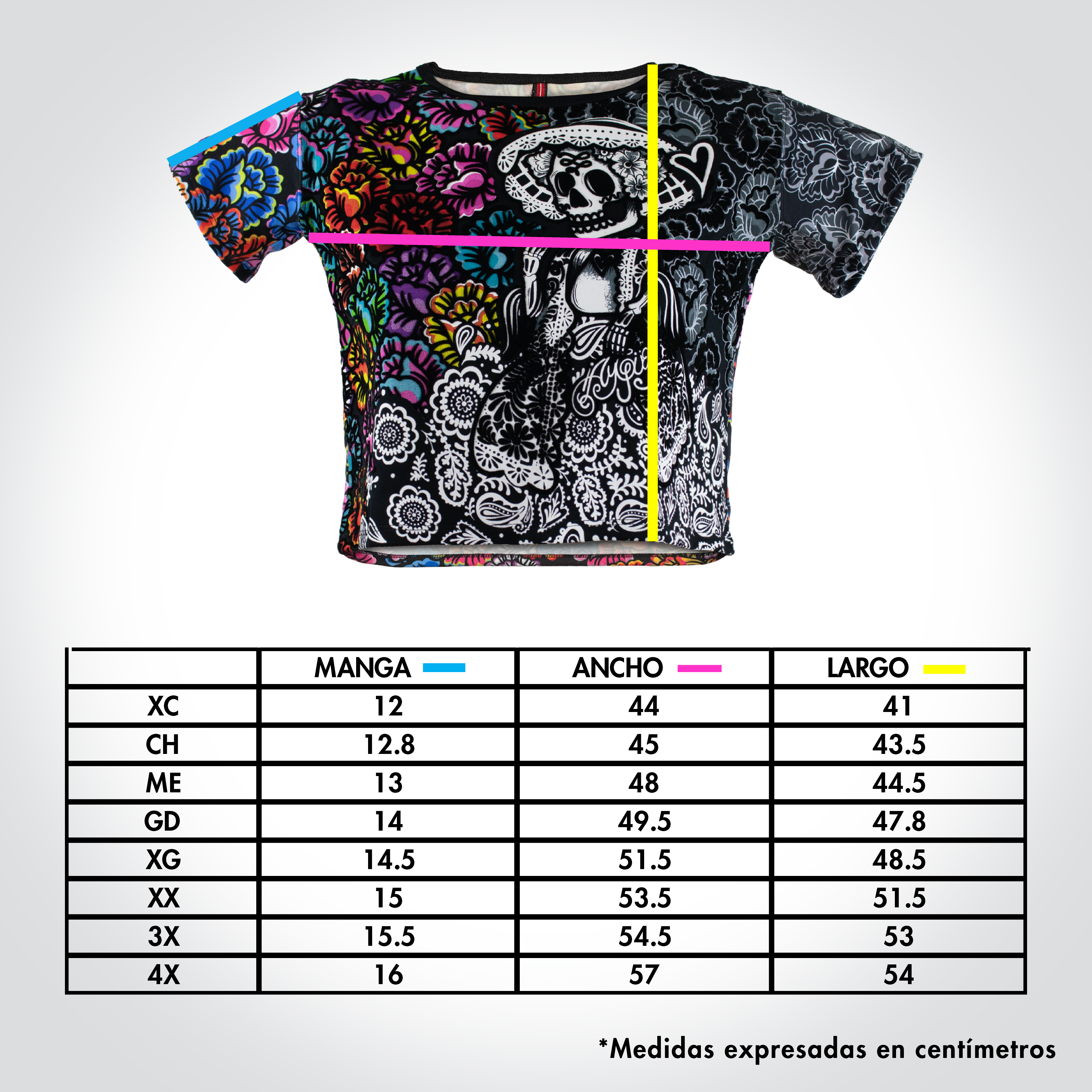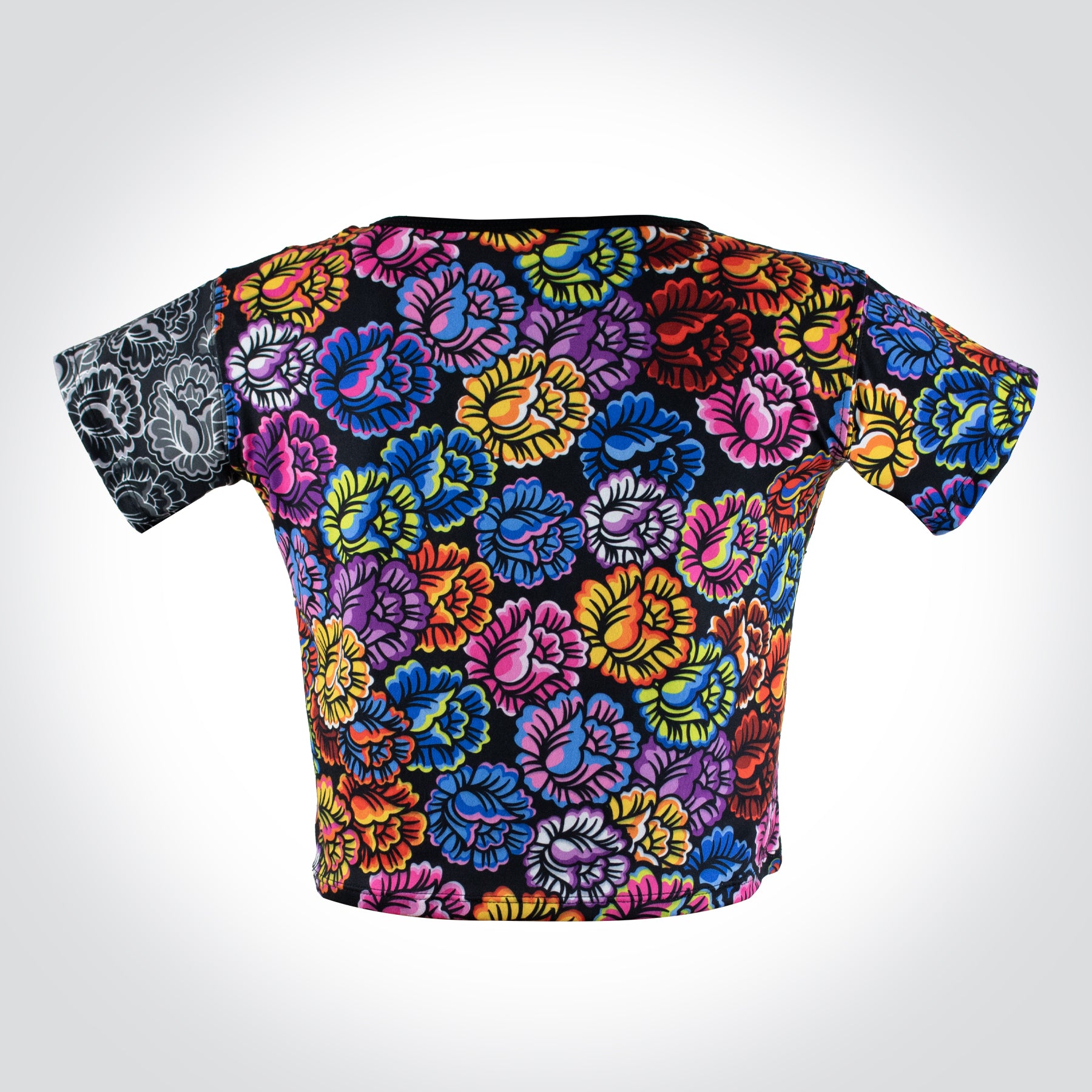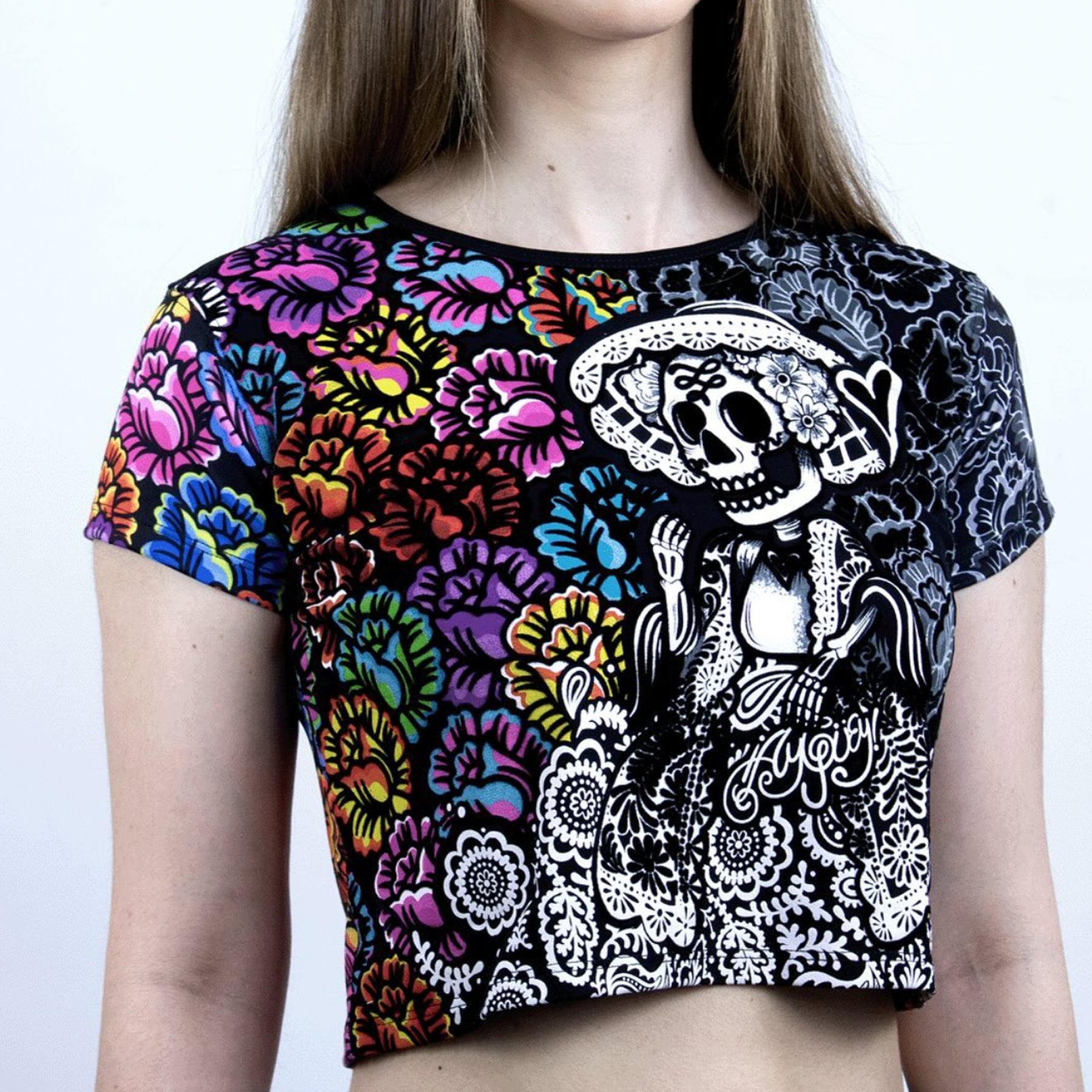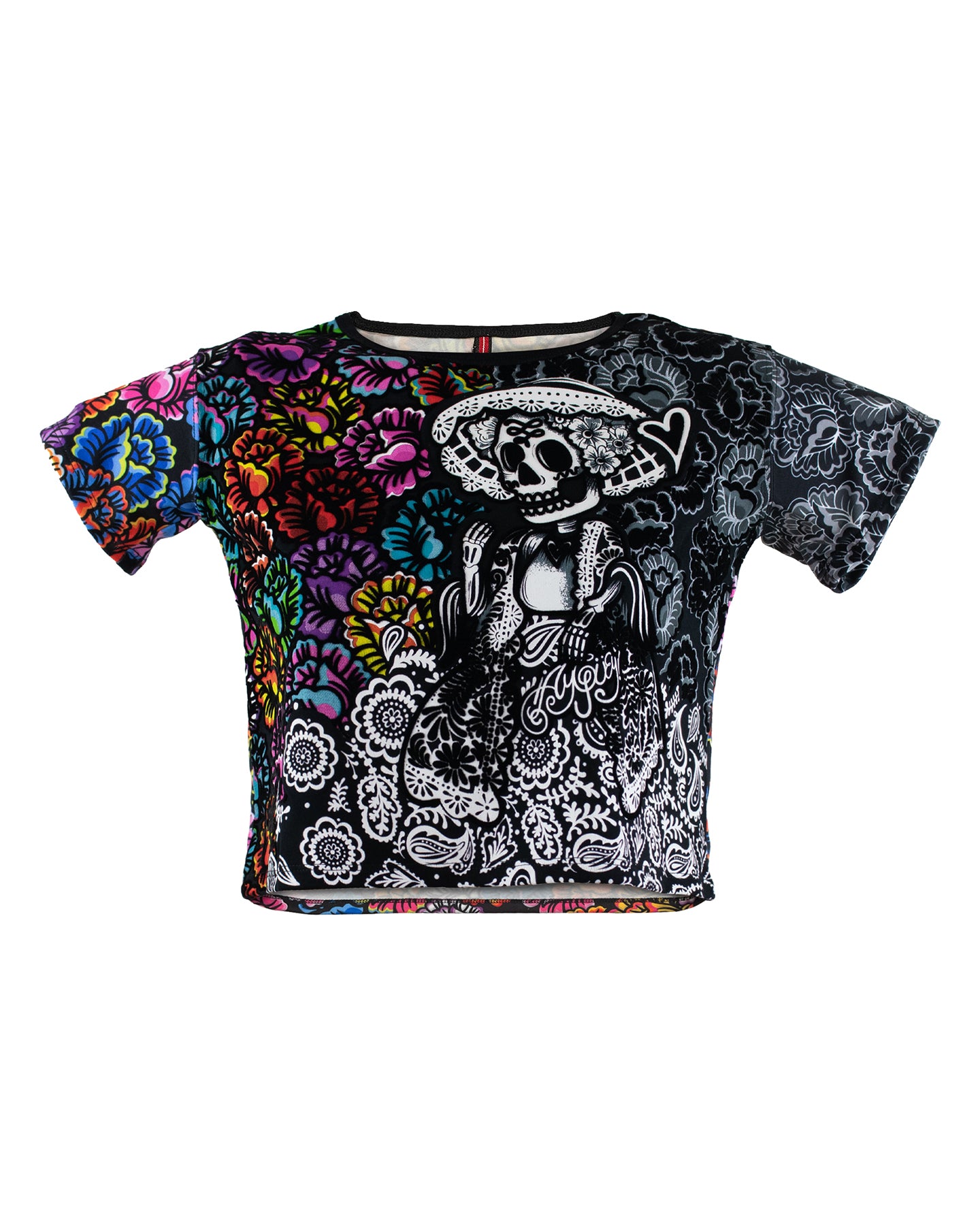 Croptop de manga corta, de puños y cuello en color negro. Diseño frontal elaborado con estampado en serigrafía y aplicación de flock. Espalda y mangas sublimadas. Este diseño busco reimaginar a la catrina de Guadalupe Posadas combinándolo con la flor de tehuana en estilo cómic.