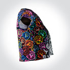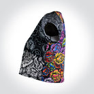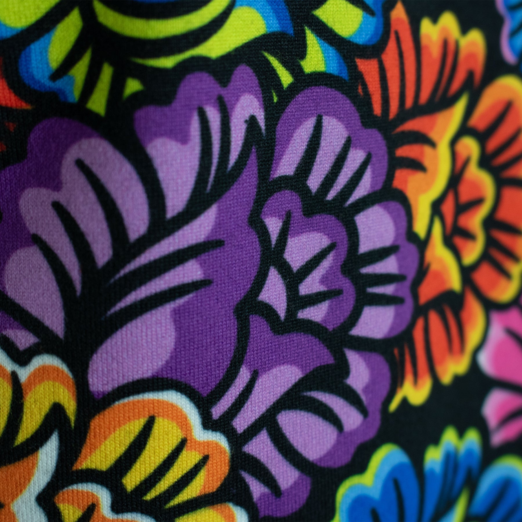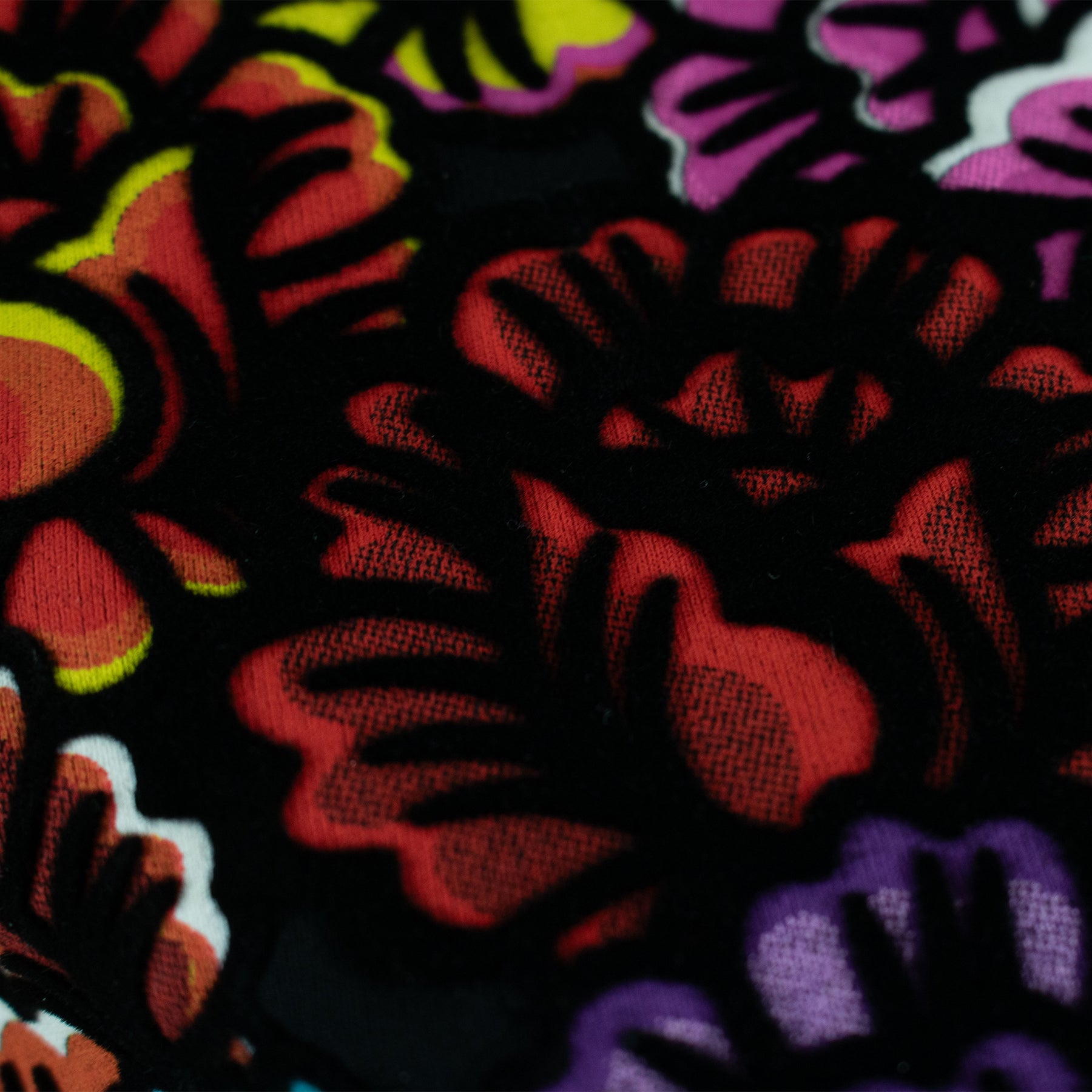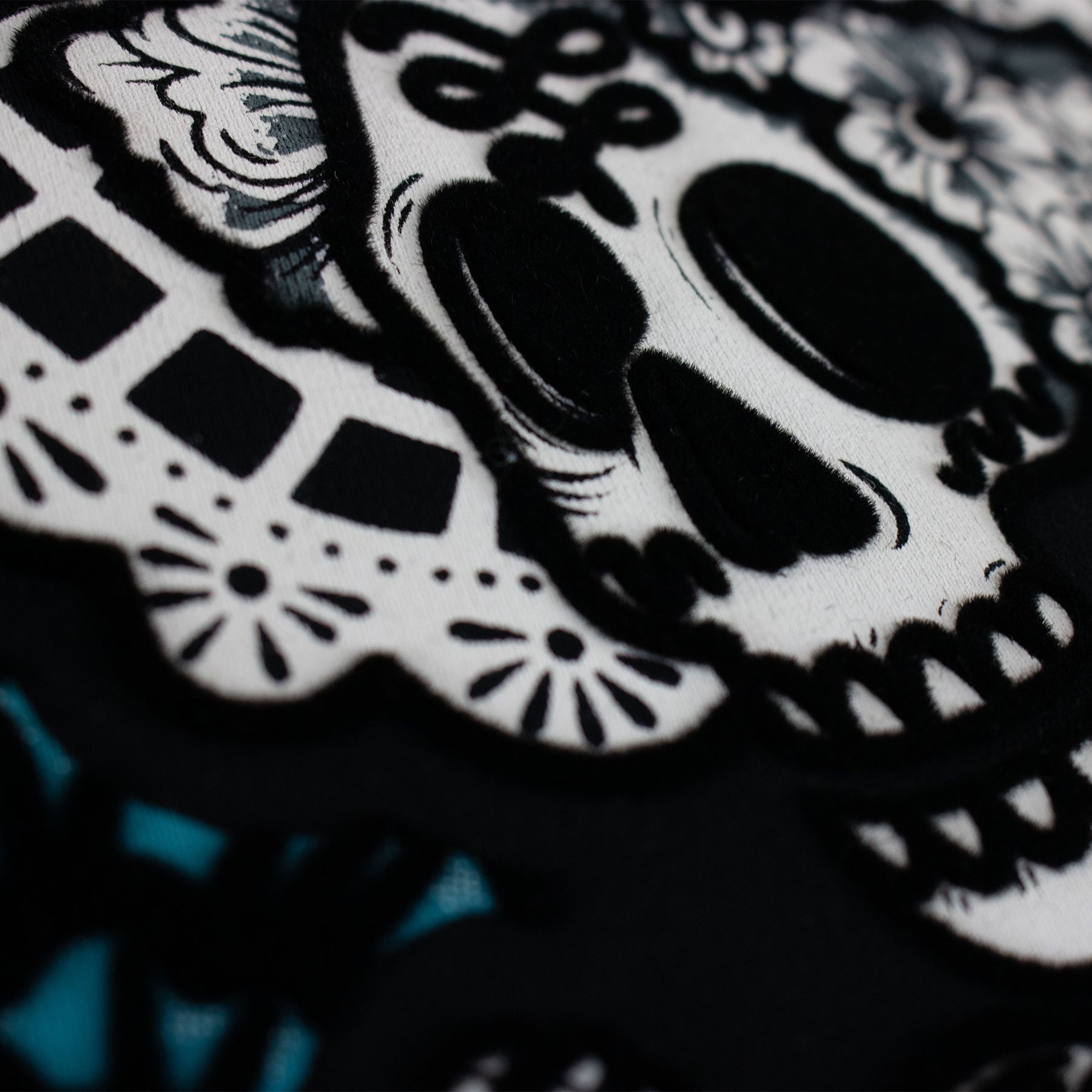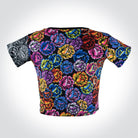 Croptop de manga corta, de puños y cuello en color negro. Diseño frontal elaborado con estampado en serigrafía y aplicación de flock. Espalda y mangas sublimadas. Este diseño busco reimaginar a la catrina de Guadalupe Posadas combinándolo con la flor de tehuana en estilo cómic.