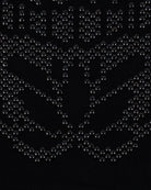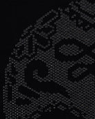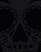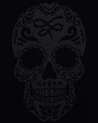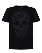 Playera de corte estándar presenta un gráfico frontal de calavera tonal, acentuado por una textura de micro-puntos plateados que definen patrones geométricos y ornamentales. El diseño monocromático resalta por su contraste sutil de brillos sobre el fondo mate, ofreciendo una estética urbana sobria y versátil.