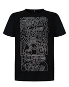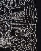 Esta playera negra para hombre presenta una deidad prehispánica delineada con pedrería plateada que aporta brillo y relieve al diseño. La gráfica integra el gesto contemporáneo de aprobación con iconografía clásica, logrando una prenda visualmente llamativa y de alta durabilidad.