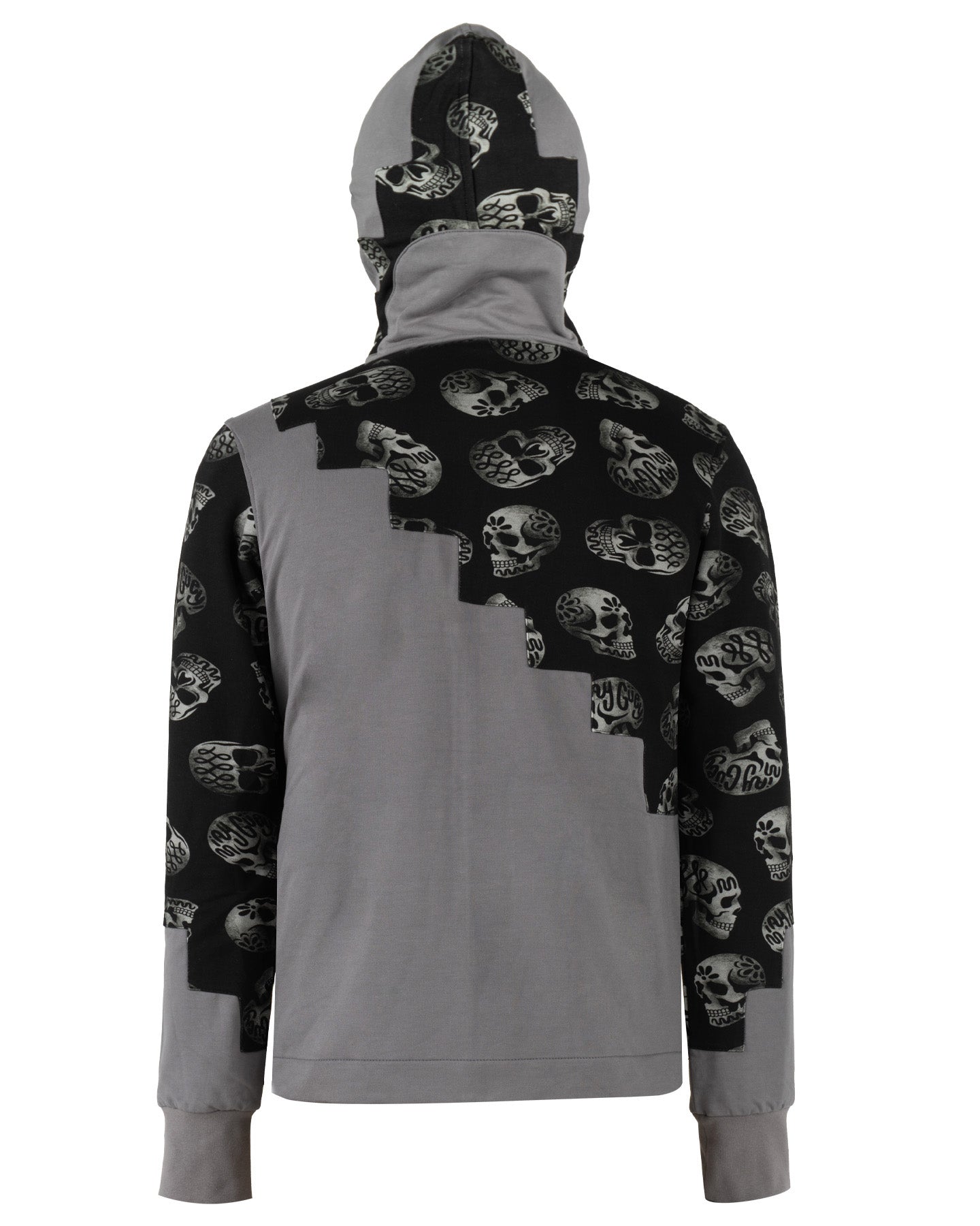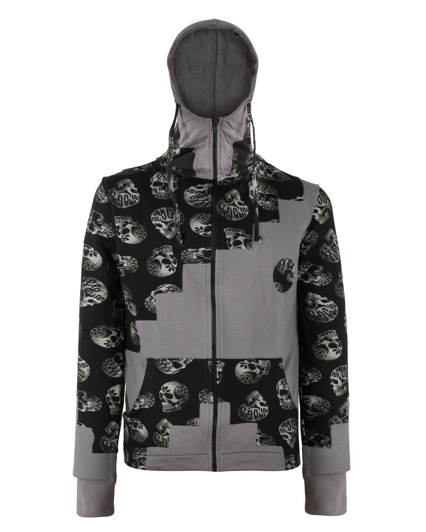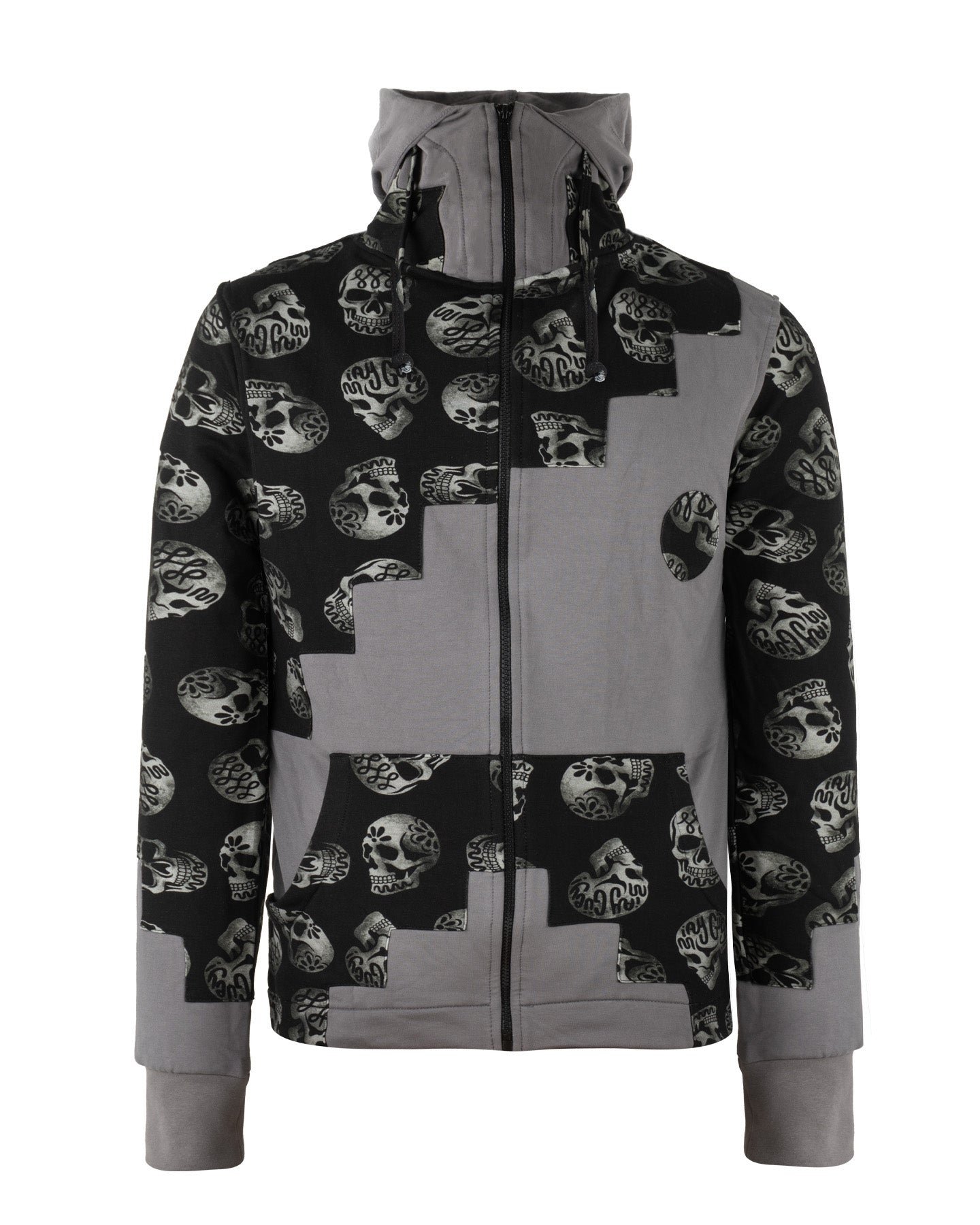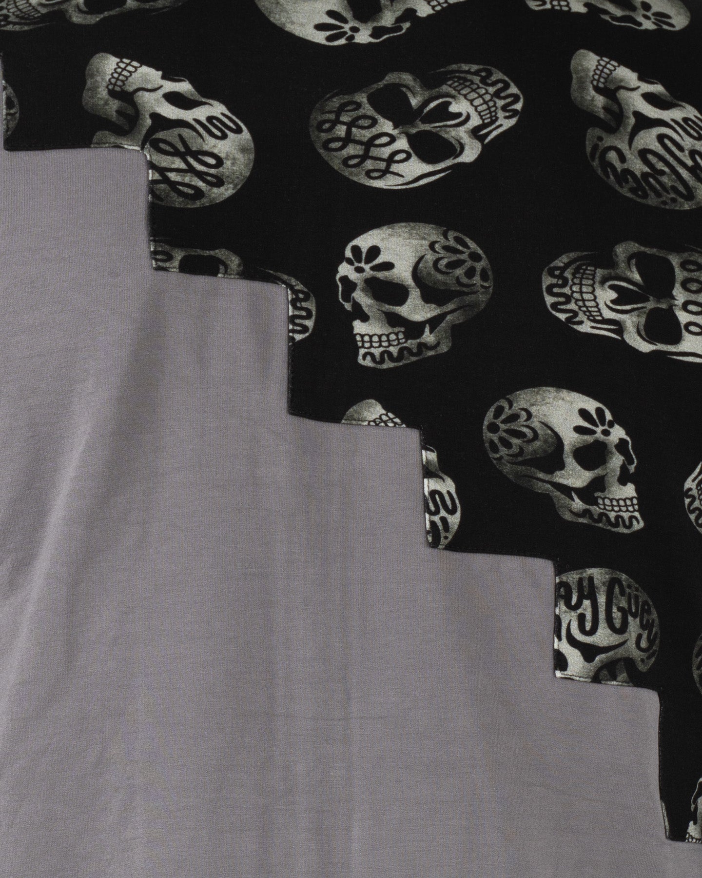 Pieza de diseño vanguardista que rompe con lo convencional. Su nombre hace honor a la construcción asimétrica en bloques, donde un diseño de patrón de calaveras en tonos blanco y negro se fusiona con paneles lisos en un elegante color gris medio. El resultado es un efecto visual que simula escalones o un patrón de tablero de ajedrez irregular, aportando una estética urbana y desafiante.