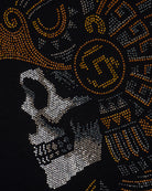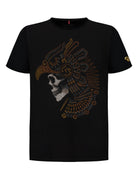 Rinde homenaje a la herencia guerrera prehispánica con una ejecución moderna de alta gama. El diseño presenta el perfil de un guerrero águila, símbolo de fuerza y visión, plasmado meticulosamente con pedrería de precisión sobre una base negra sólida.