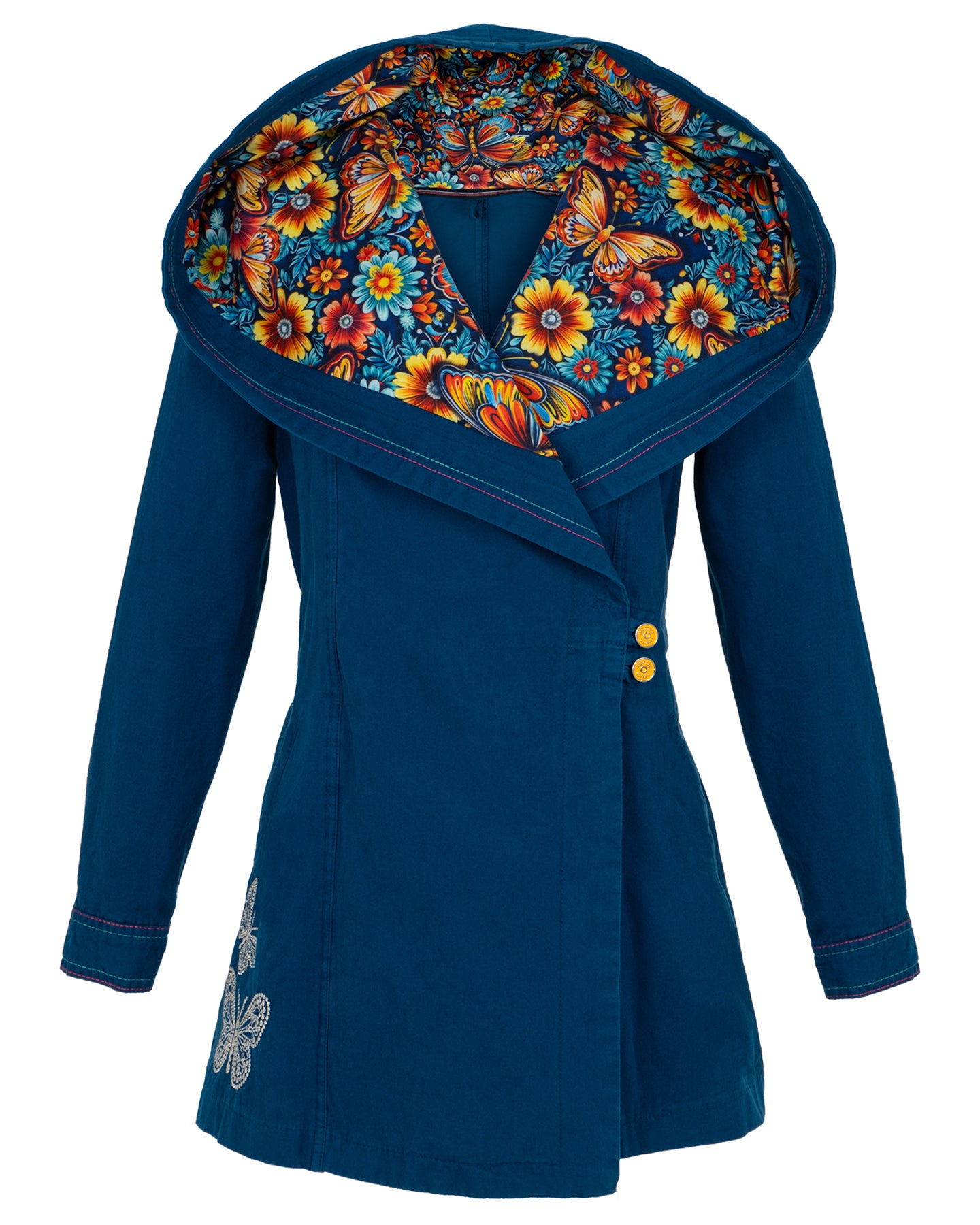 Gabardina para mujer modelo LOLA con cierre cruzado y gorro sublimado - MARIPOSINA