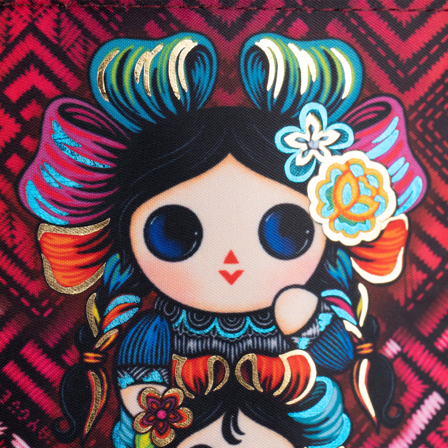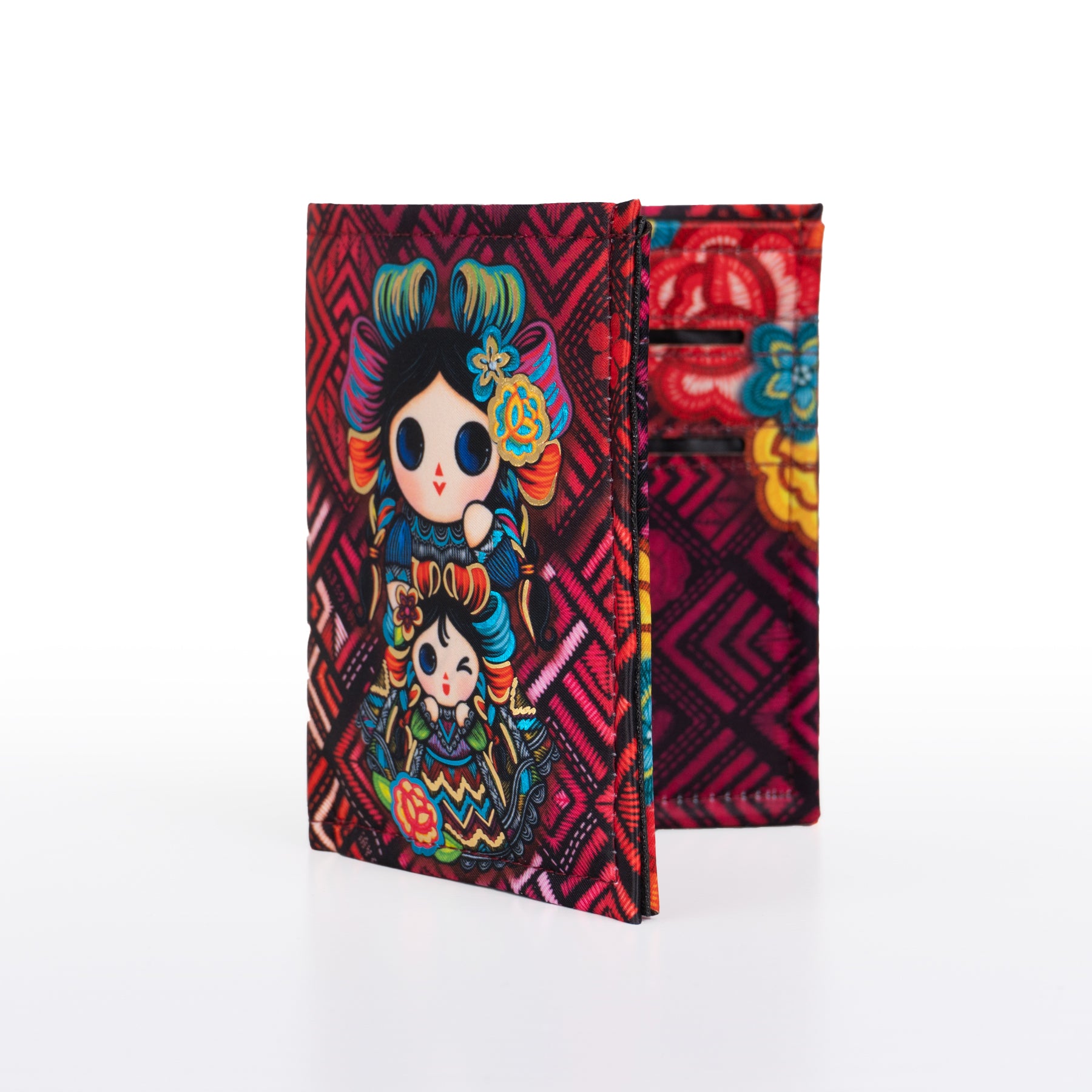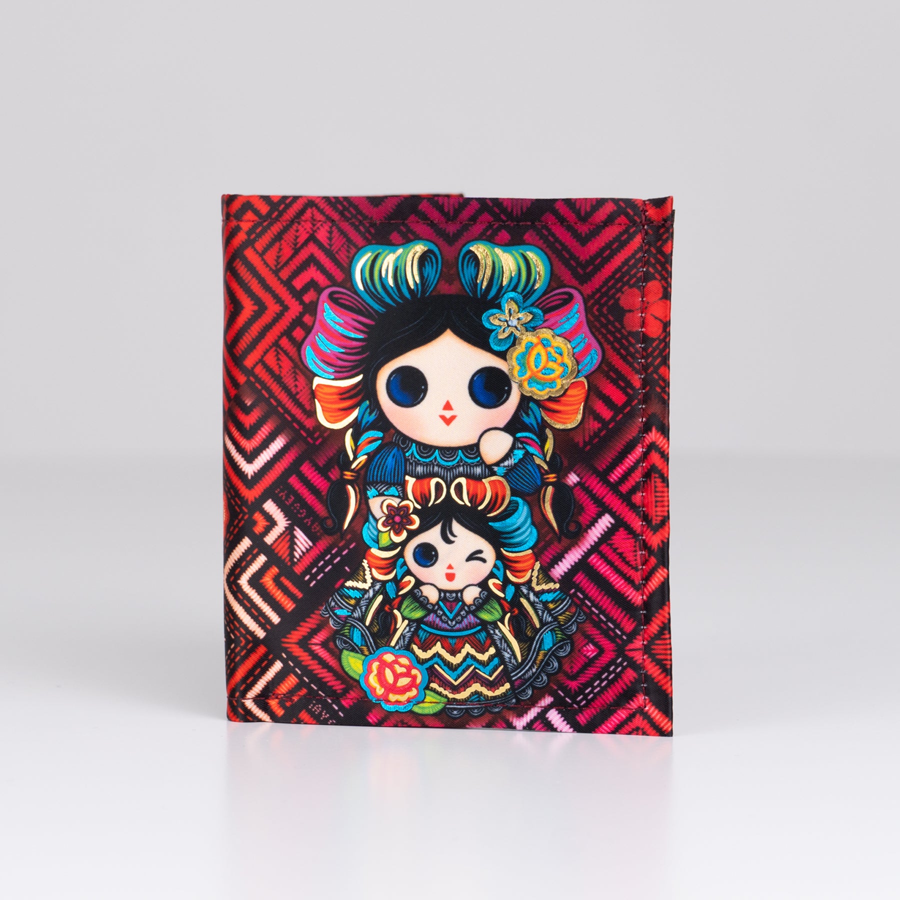 Billetera en tonos rojos y foil metalizado que tiene como protagonista a nuestra muñeca Petrita y una pequeña acompañante.