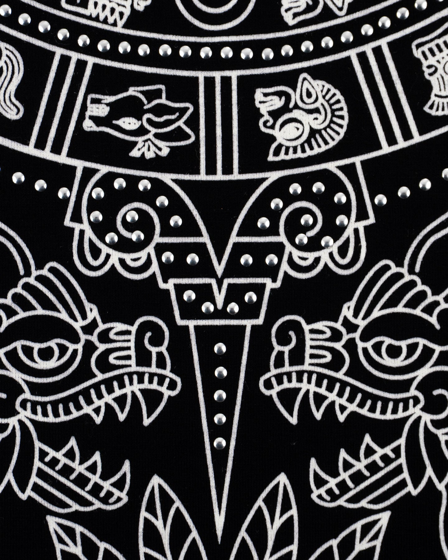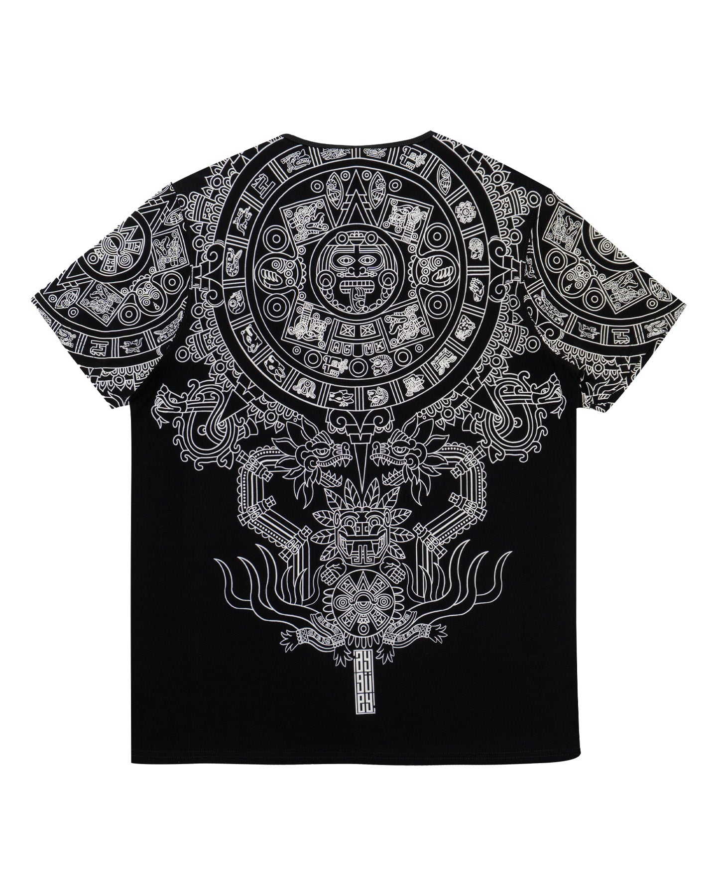 Fuerza cósmica y la sabiduría ancestral "Corazón de Sol". Inspirada en la imponente Piedra del Sol (Calendario Azteca), esta prenda es un homenaje al concepto fundamental de la cultura mexica: el eterno ciclo de la vida y la muerte.