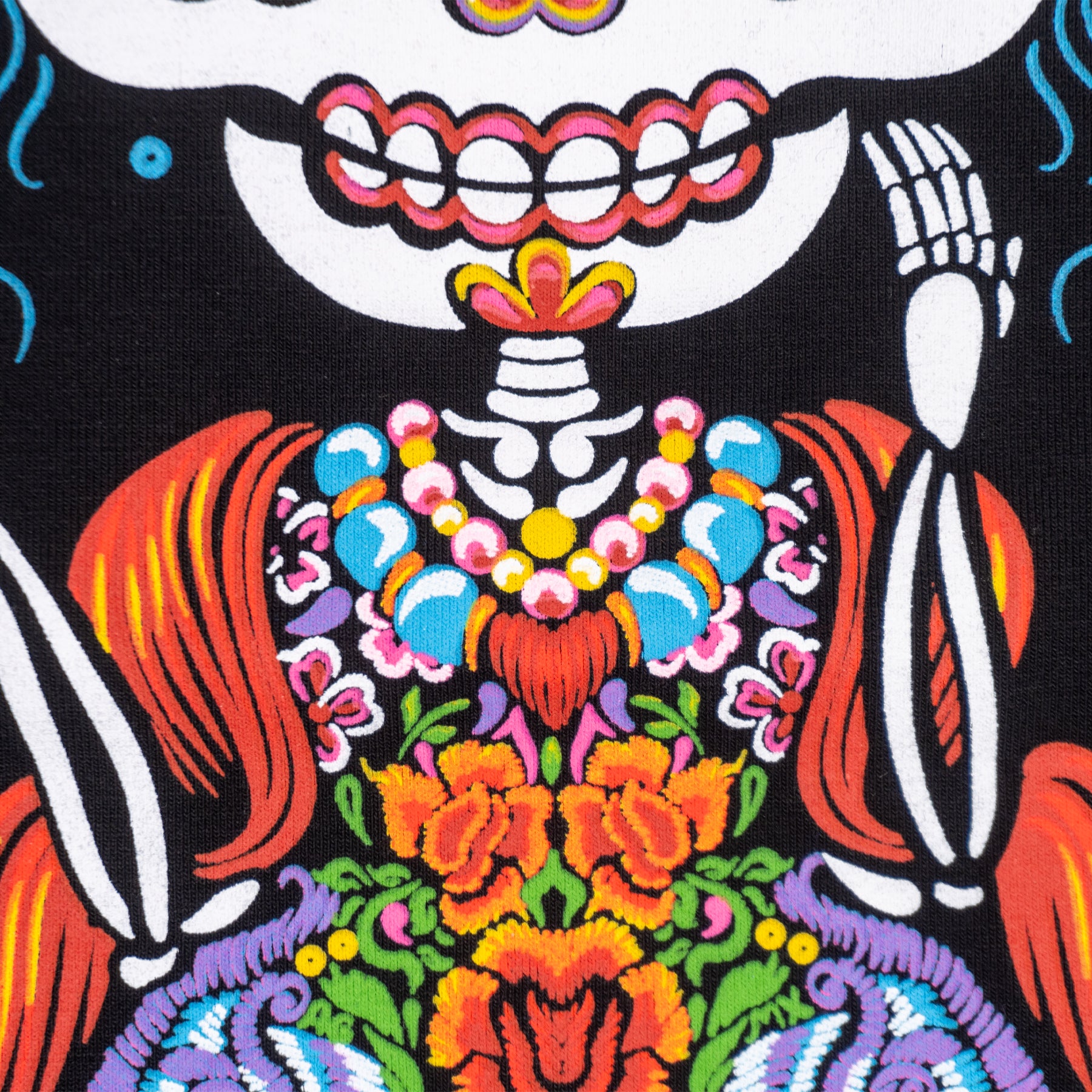 Su sonrisa llena de misterio, su vestido inspirado en las tehuanas, es un tributo a toda su tradición. Esta catrina no solo honra el Día de Muertos; baila con él, recordándonos que la vida y la muerte son parte del mismo camino lleno de color y fiesta.