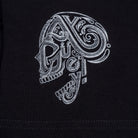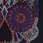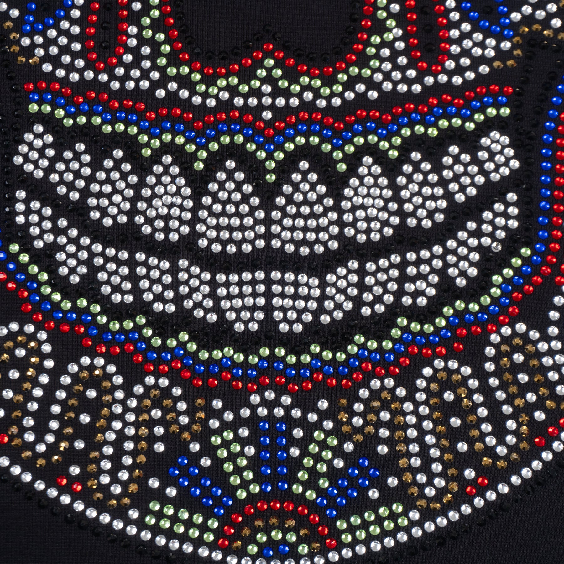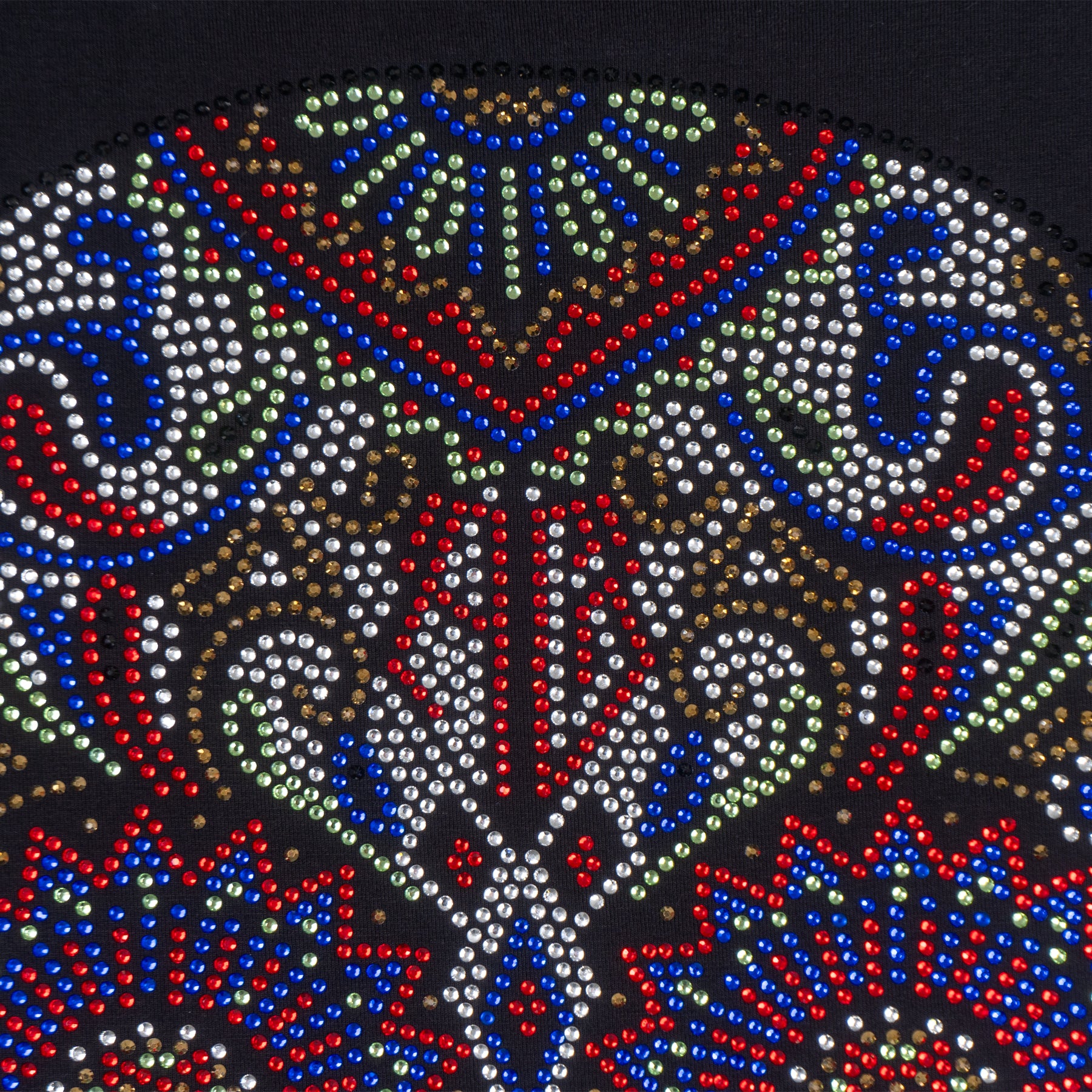 Se utilizó la técnica de pedrería, pegando cada una de estas piedras, dándole vida a esta poderosa calavera. De manera artesanal se juntaron 6 colores en una sola plantilla y se aplicaron por medio de calor. Este diseño tiene 5,919 piezas en tonos rojos, azules, verdes y plateados.