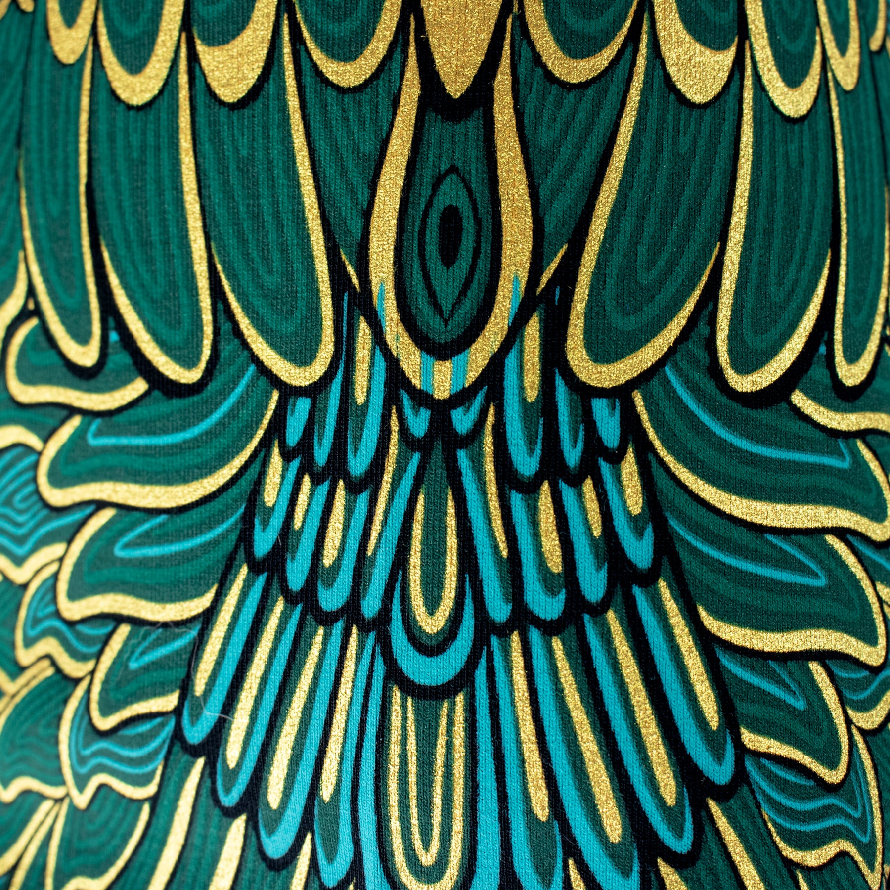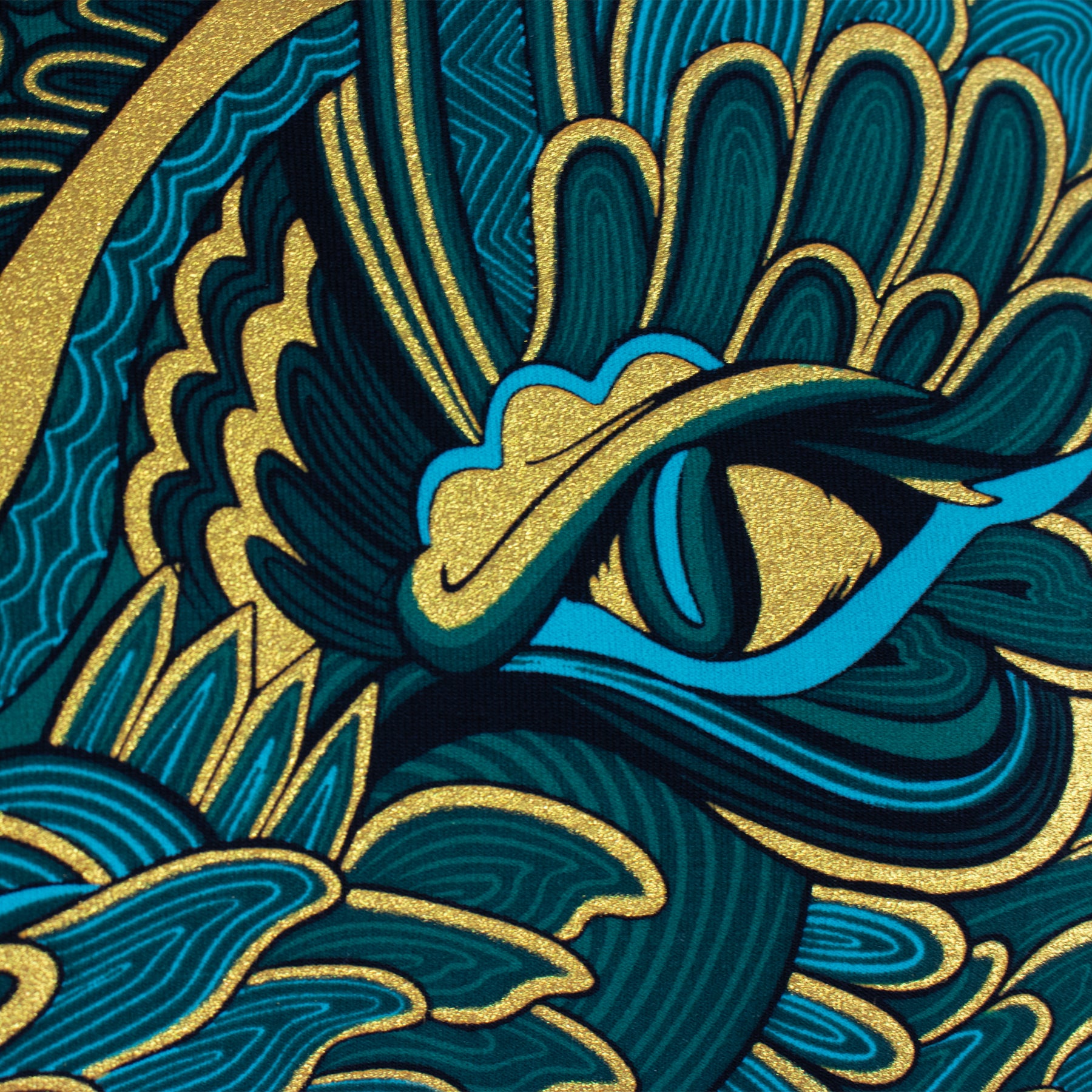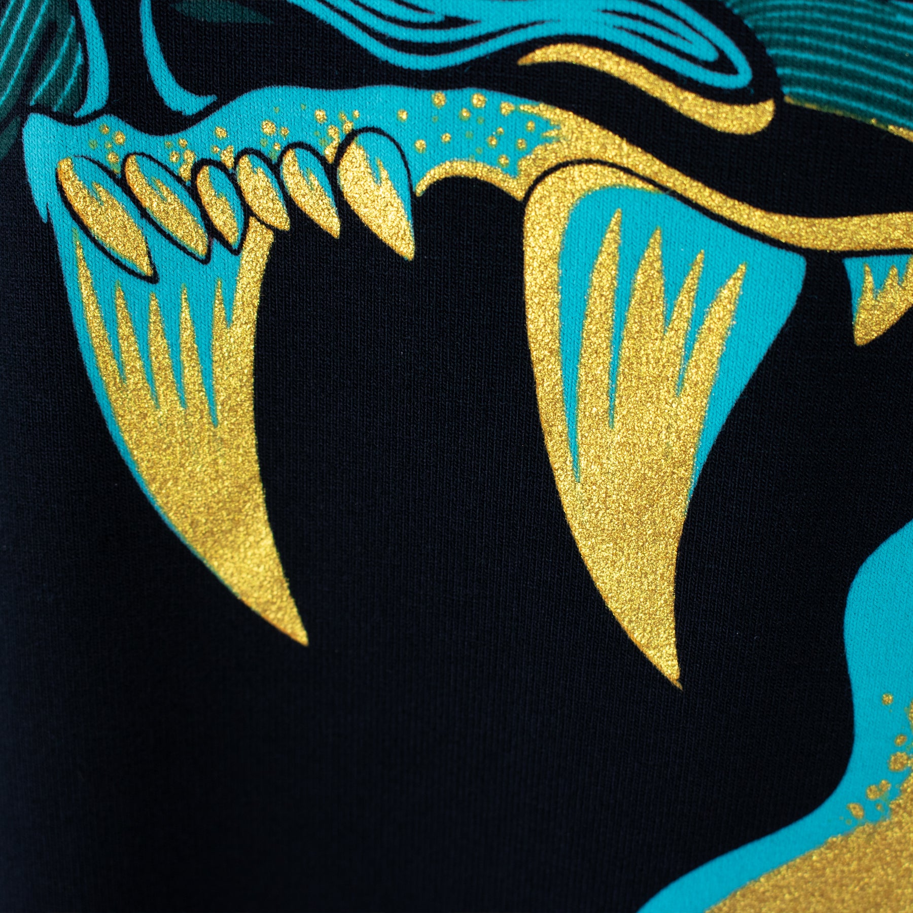Cuenta con manga estampada y aplicaciones en tinta shimmer que dan brillo a ciertas zonas del diseño.