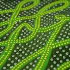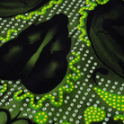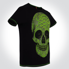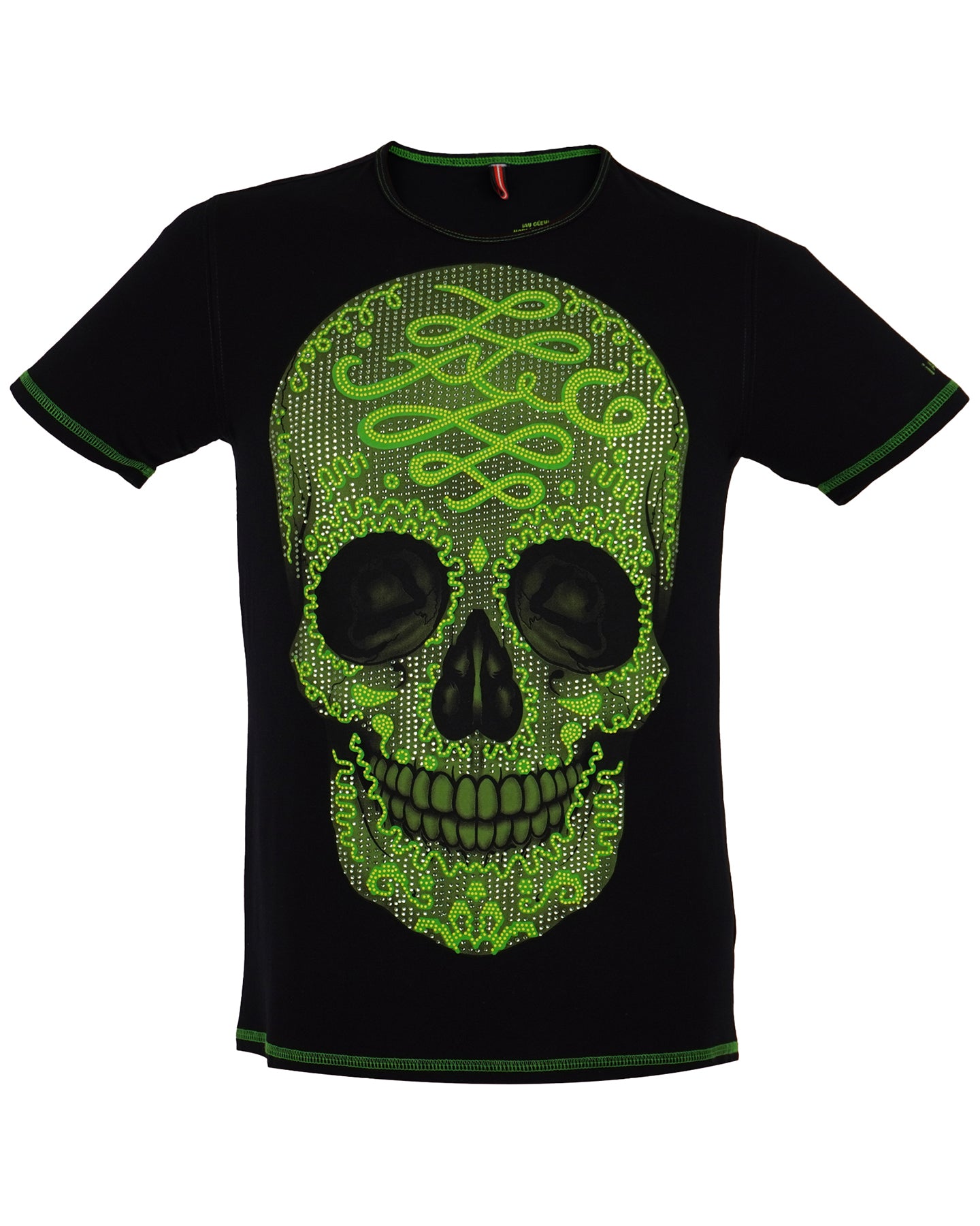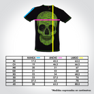 Playera negra de manga corta y cuello redondo. Inspirada en las calaveras de azúcar, adornada con motivos alusivos al día de muertos, la mezcla de materiales le aporta un contraste entre lo convencional y lo atrevido.
