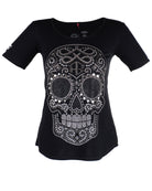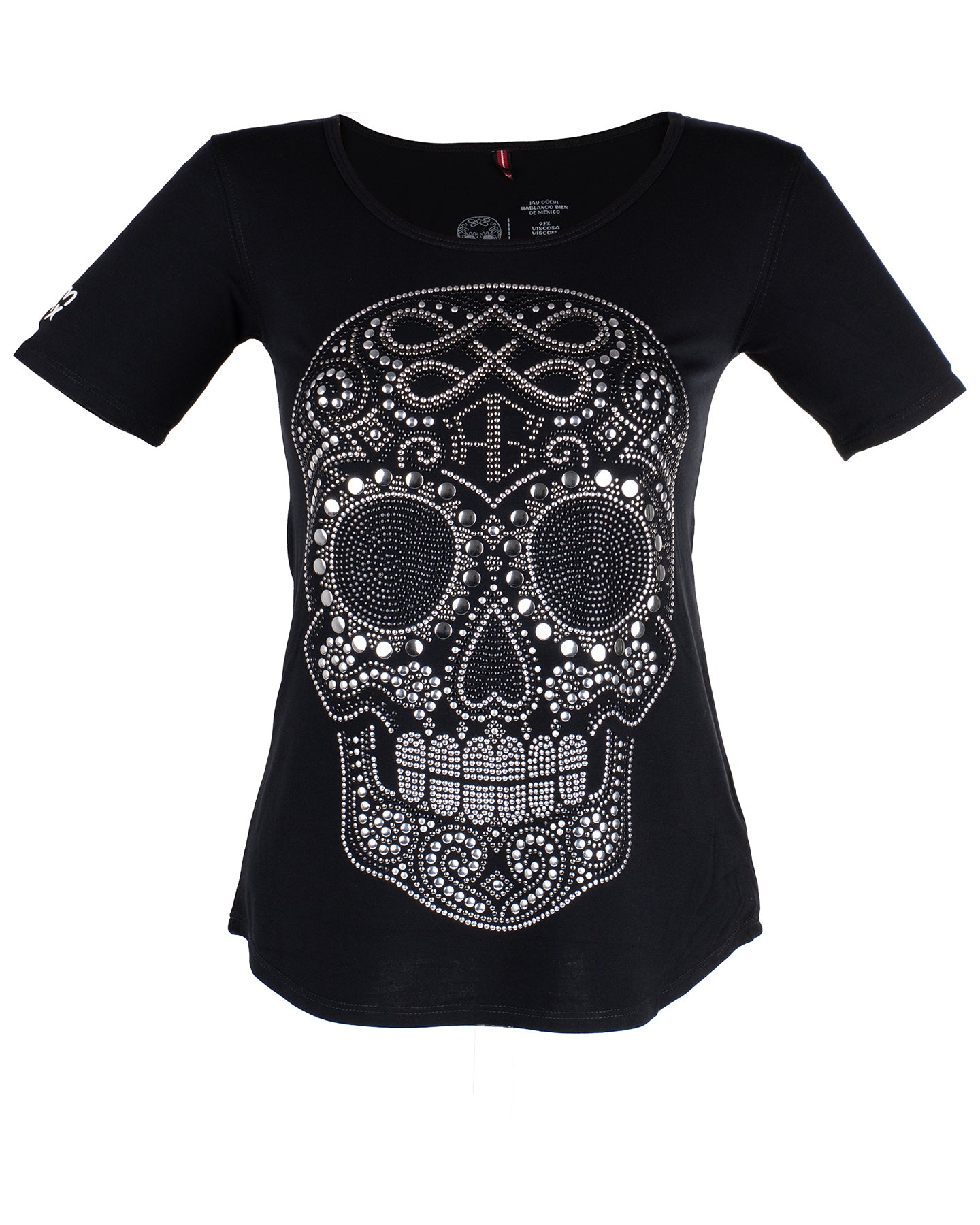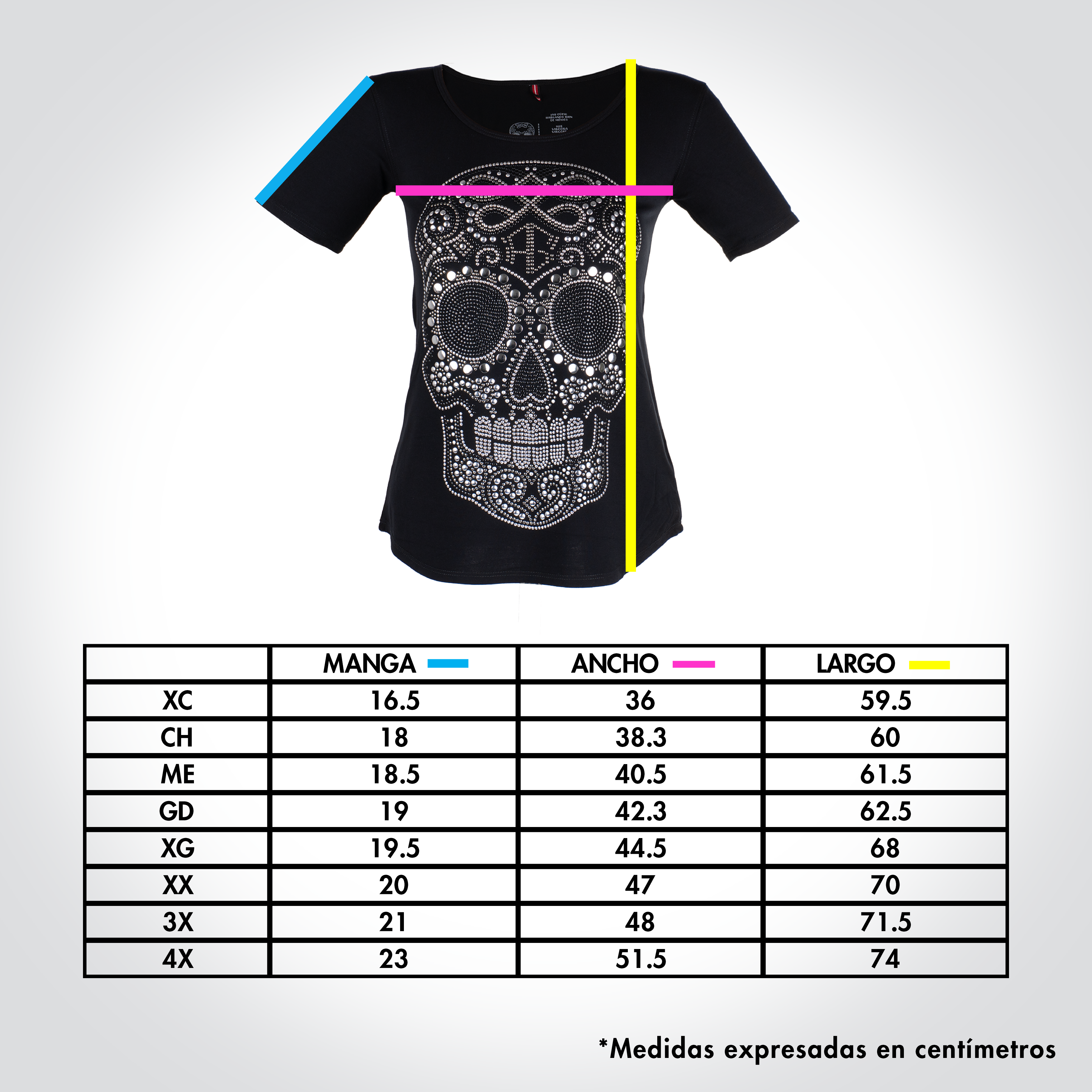 ¡Celebra la vida con Charrina! Esta playera cuenta con una inspiradora calaverita de azúcar y detalles estoperol que forman la figura. Disponible también para caballero ¡No te quedes sin la tuya para las fiestas tradicionales mexicanas!