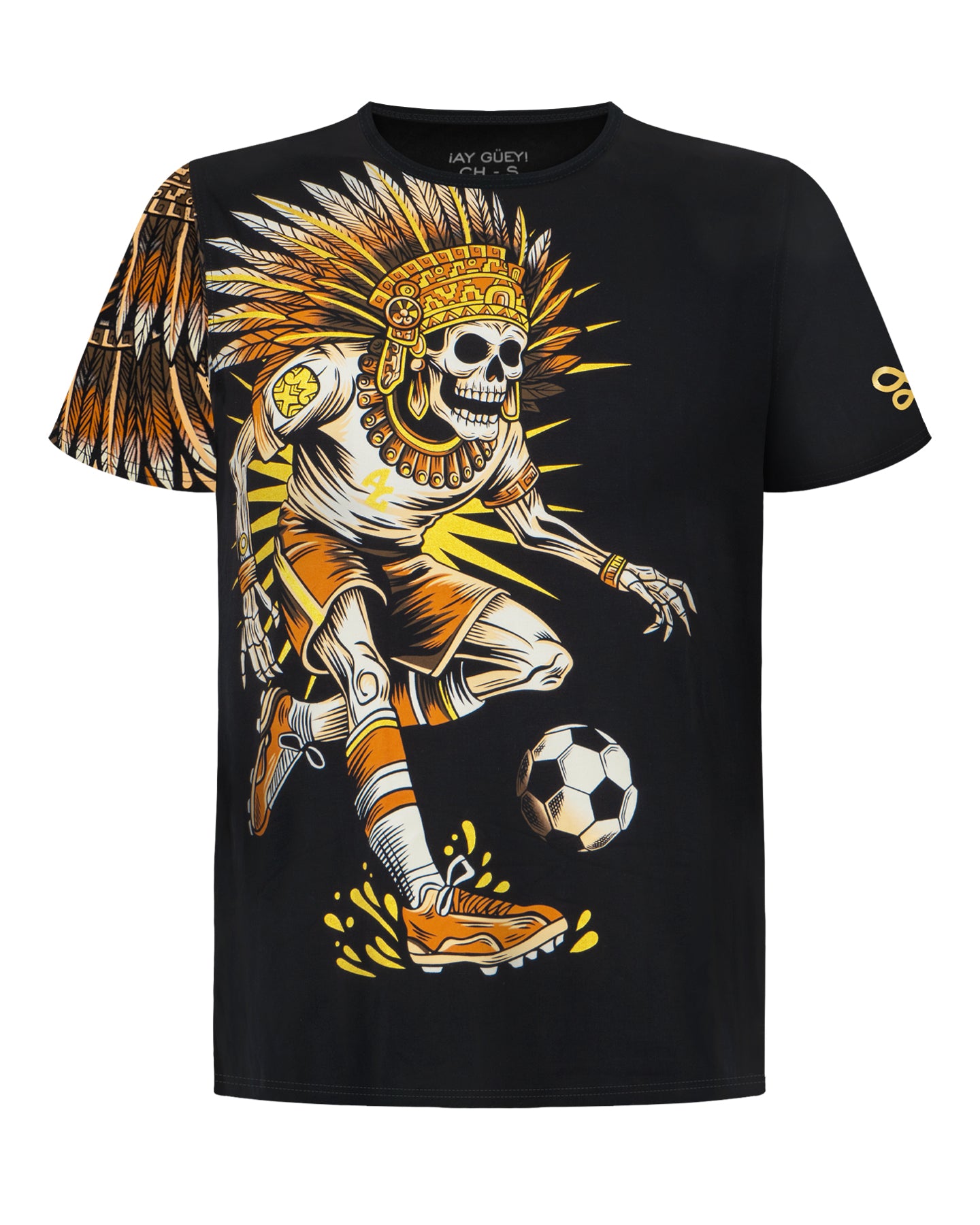 Esta prenda encarna el vuelo majestuoso del águila sobre la cancha, donde la mística ancestral de un penacho dorado guía cada zancada hacia la portería. El esqueleto guerrero, ataviado con la opulencia de un emperador, desafía la gravedad y el tiempo para demostrar que el talento nacional es una herencia que nunca muere.