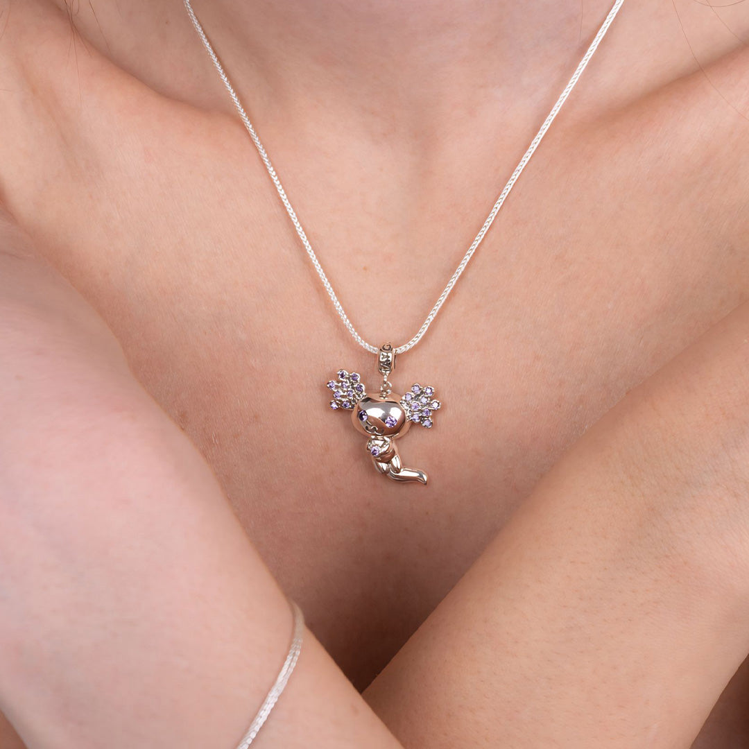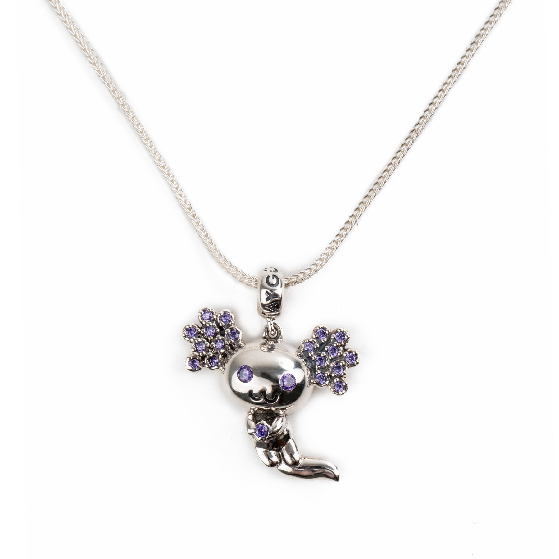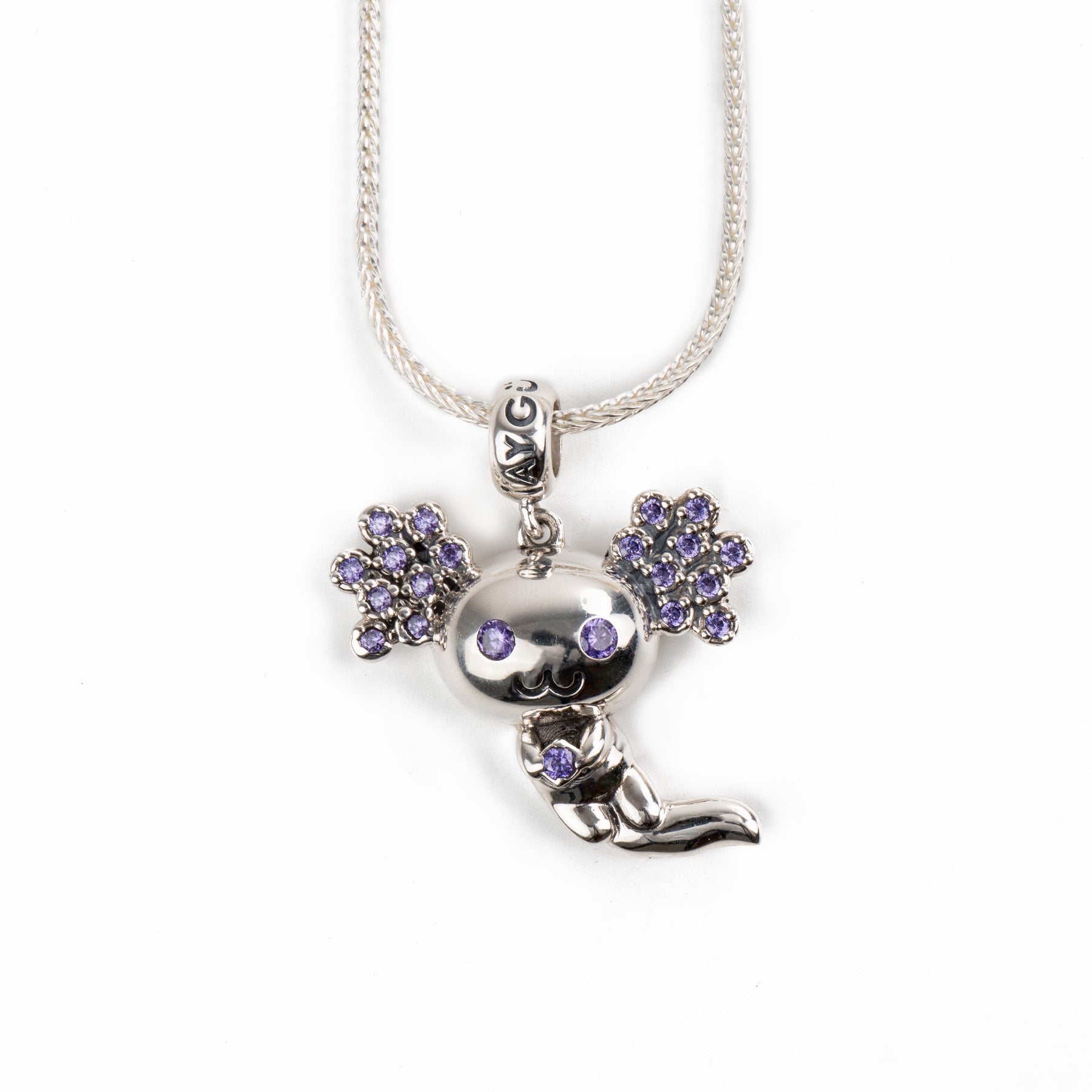 Con incrustaciones de brillantes en tonalidad violeta, hecho de plata ley 925, esta pieza es una combinación perfecta de elegancia y durabilidad. El cierre asegura que se mantenga seguro en tu cuello todo el día.
