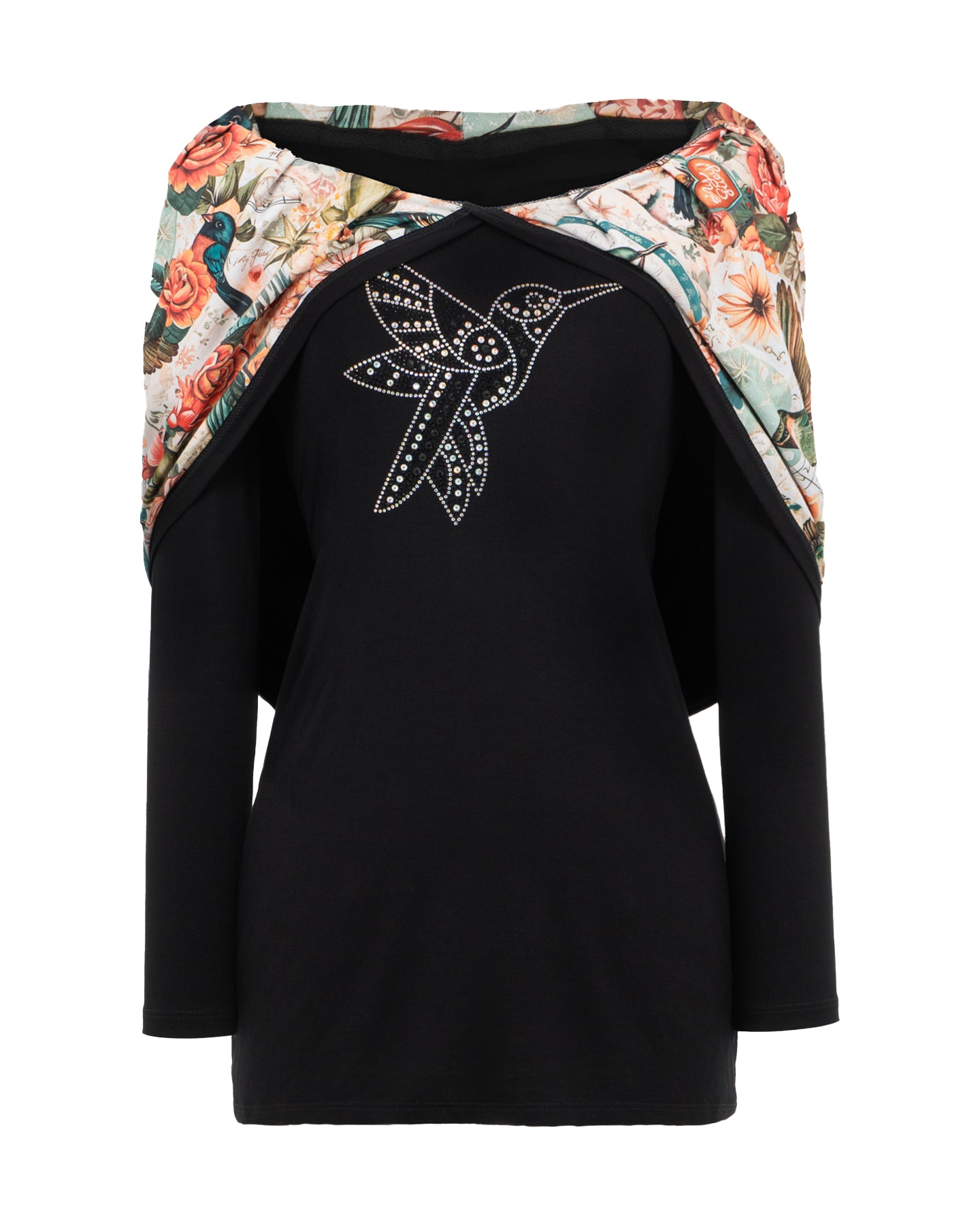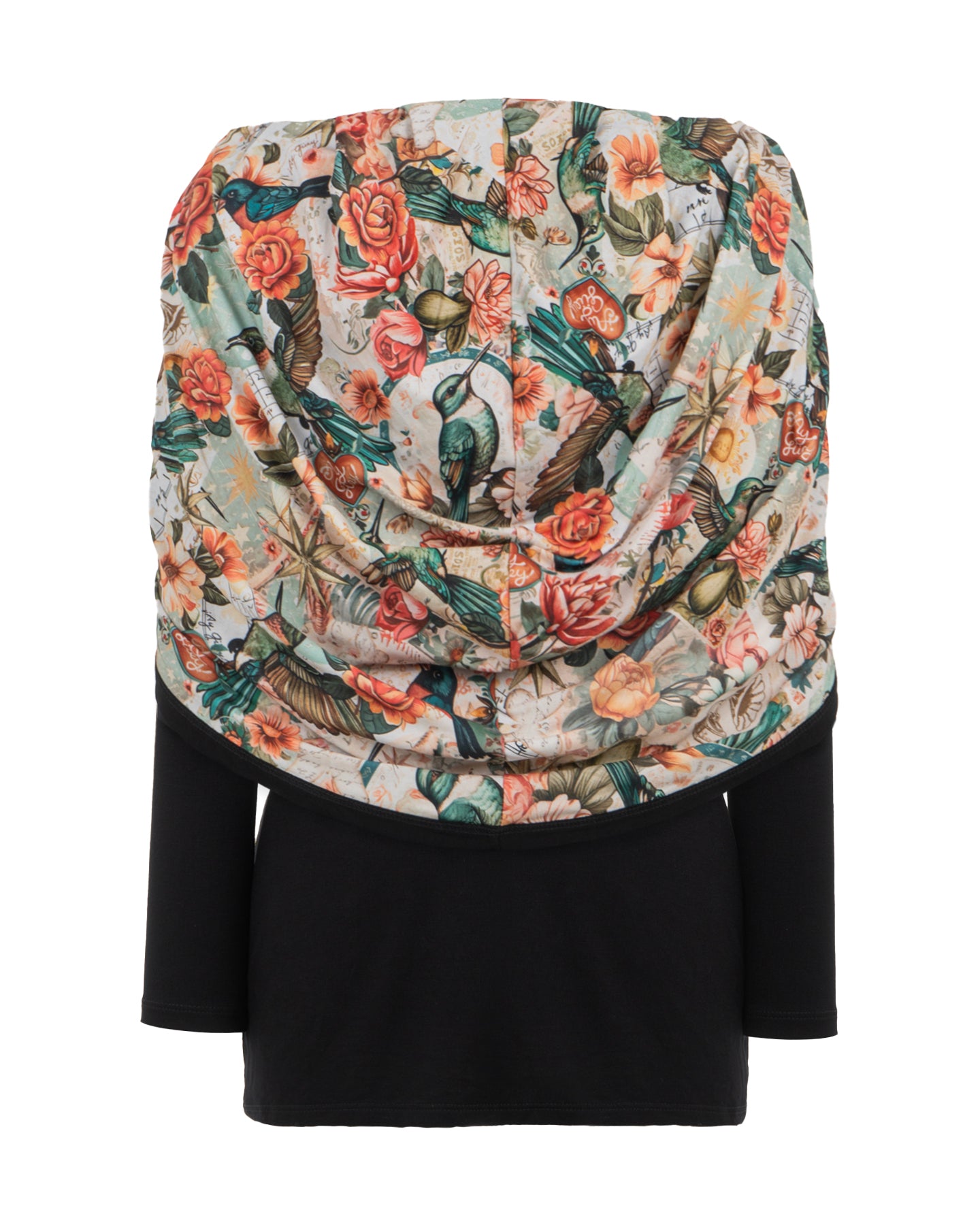 Esta pieza captura la danza eterna del colibrí, el mensajero del alma que emerge entre un jardín de flores vibrantes y destellos tornasol. Con un diseño de hombros descubiertos que evoca feminidad y libertad, la prenda transforma la delicadeza del ave en un símbolo de elegancia contemporánea y misticismo.