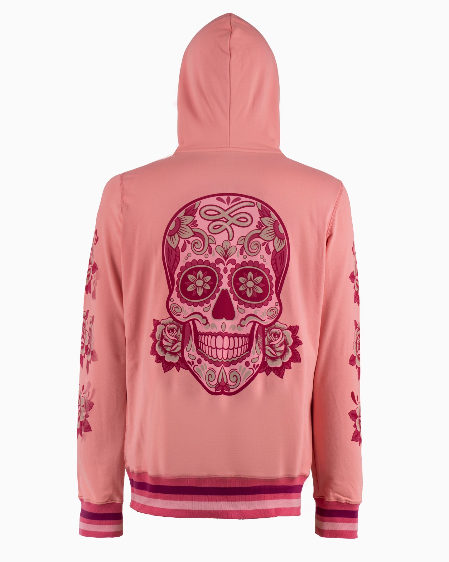 Diseño Central: Espectacular Calavera de Azúcar en la espalda, detallada con intrincados grabados de flores simbólicas que celebran la vida y la memoria.