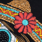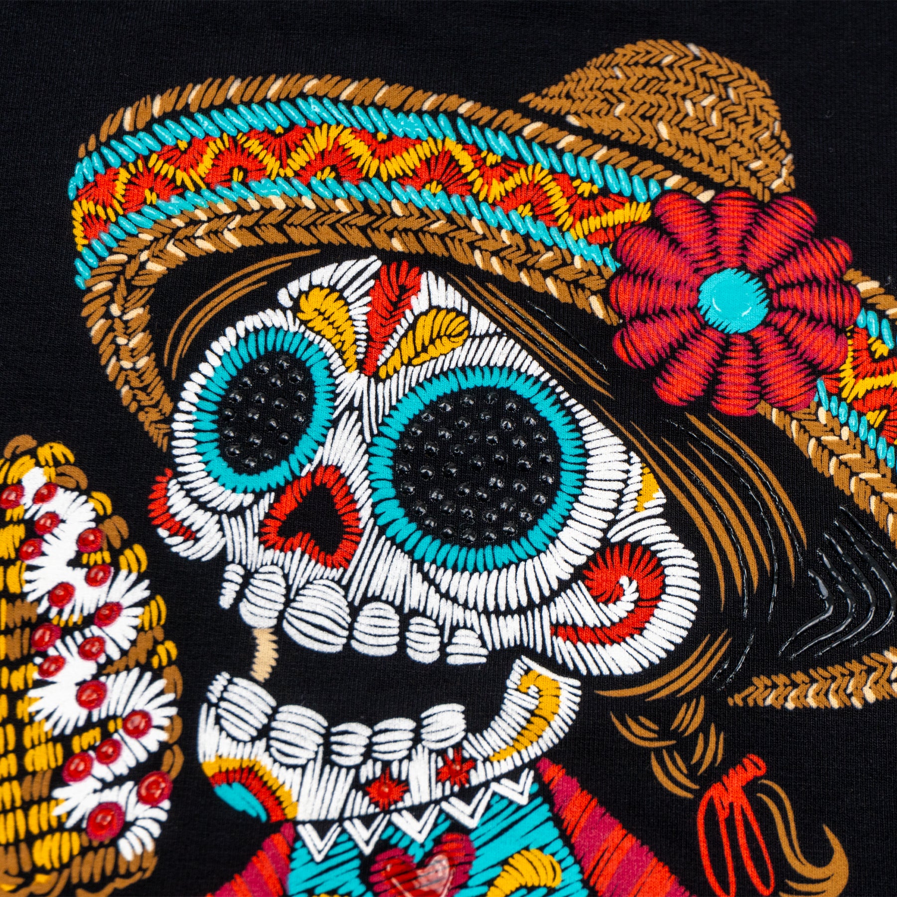Luce con orgullo a esta calaverita de azúcar bien mexicana, con su joronguito pa'l frío y un elote en la mano, ¡pa' que no falte el sustento! Porque aquí, hasta la huesuda le entra al elote, ¡somos hijos del maíz!