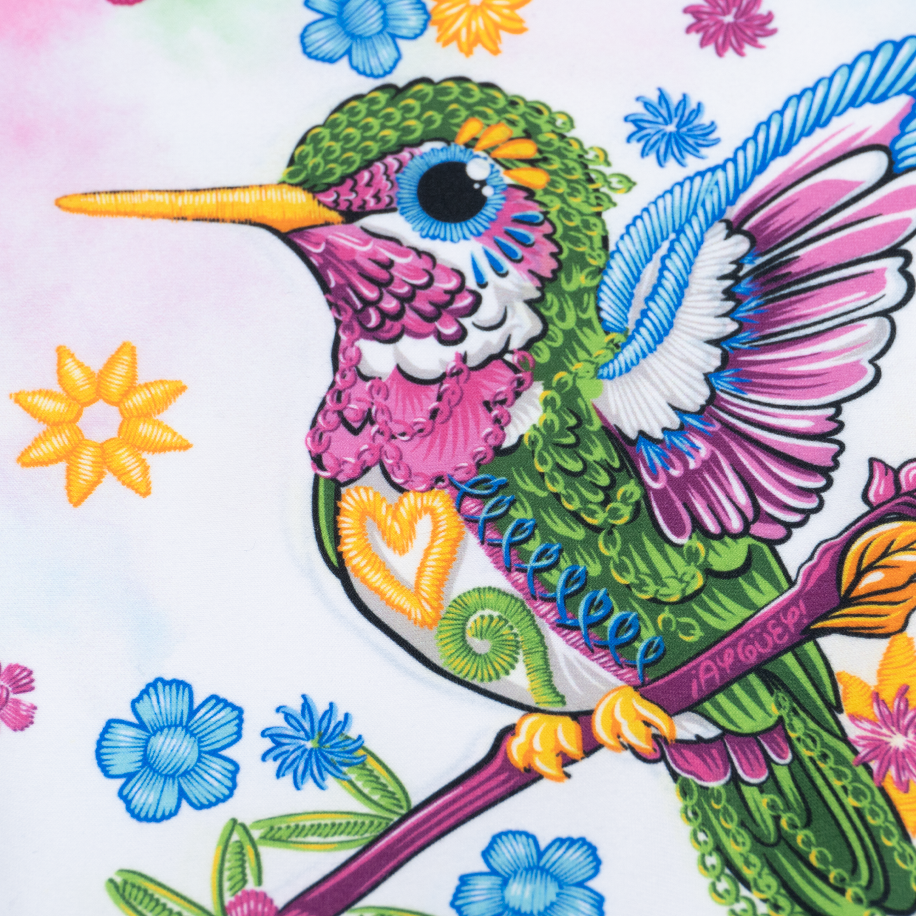 Vestido de niña color blanco. Diseño inspirado en colibrí, el mensajero de buenos deseos, y en las flores de los bordados tradicionales.
