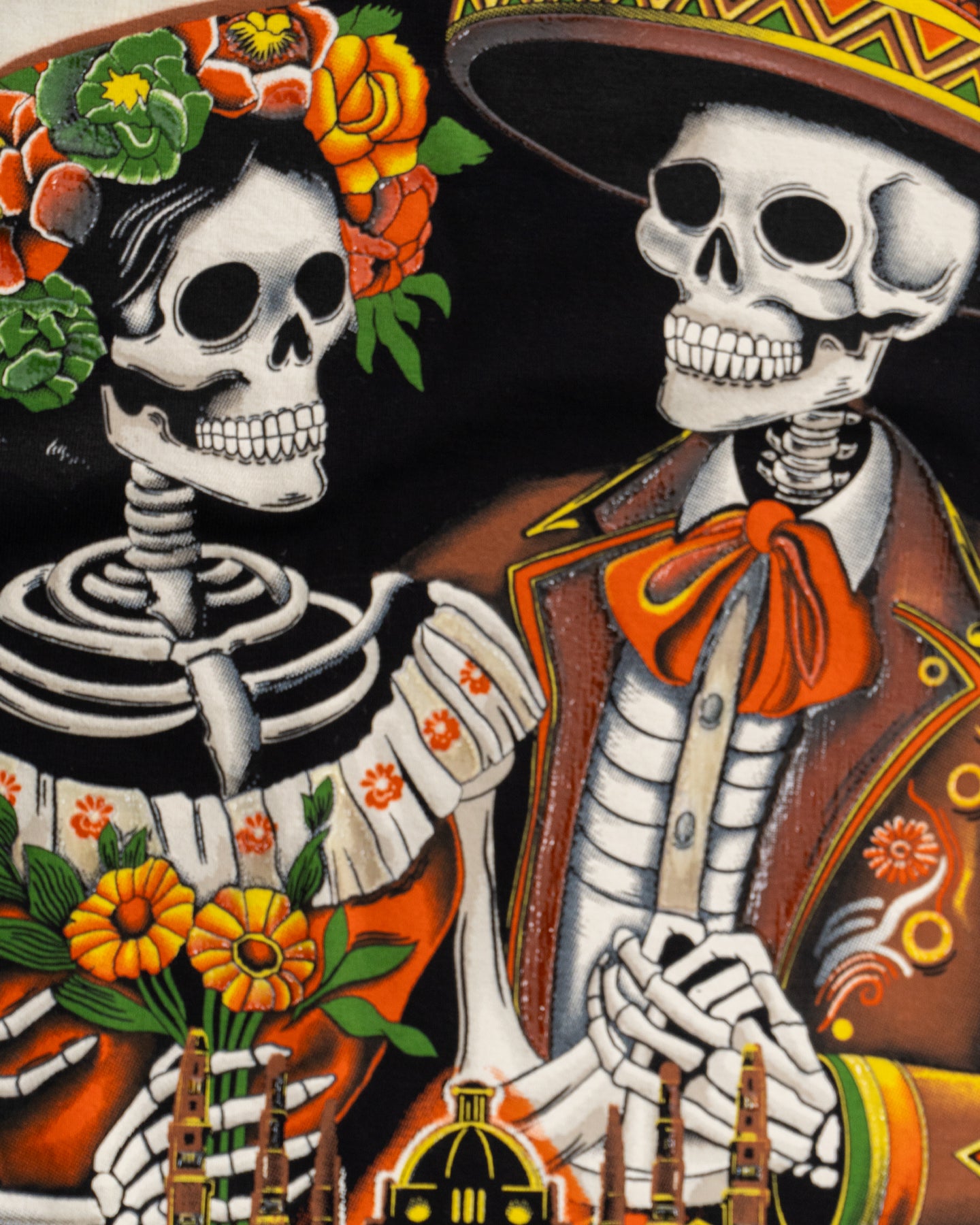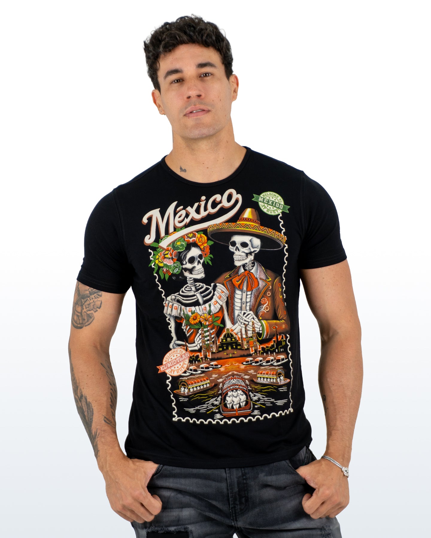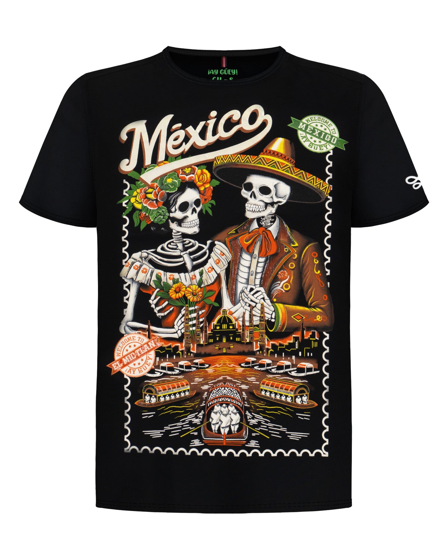 La playera "Mictlán" presenta una impresionante ilustración de dos esqueletos elegantemente ataviados: un mariachi y una catrina. El entorno festivo evoca los canales de Xochimilco al anochecer, con cada detalle cuidadosamente elaborado para reflejar la riqueza cultural de México.