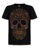 El poder del maíz y la belleza de la calavera se unen en esta playera. Piedras doradas resplandecientes forman una calavera que representa la grandeza de México y la fuerza de nuestras raíces. El maíz, fuente de vida, se convierte en un símbolo de poder y prosperidad. ¡Viste con orgullo este diseño único!
