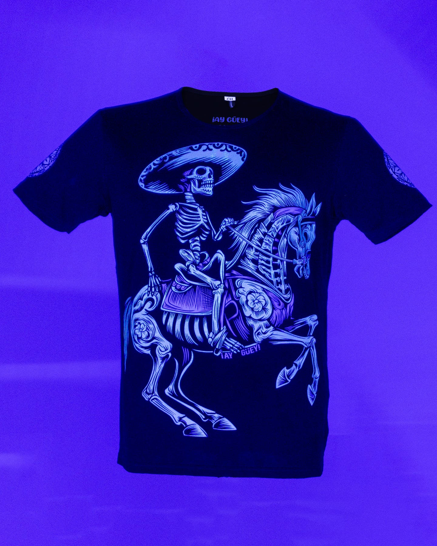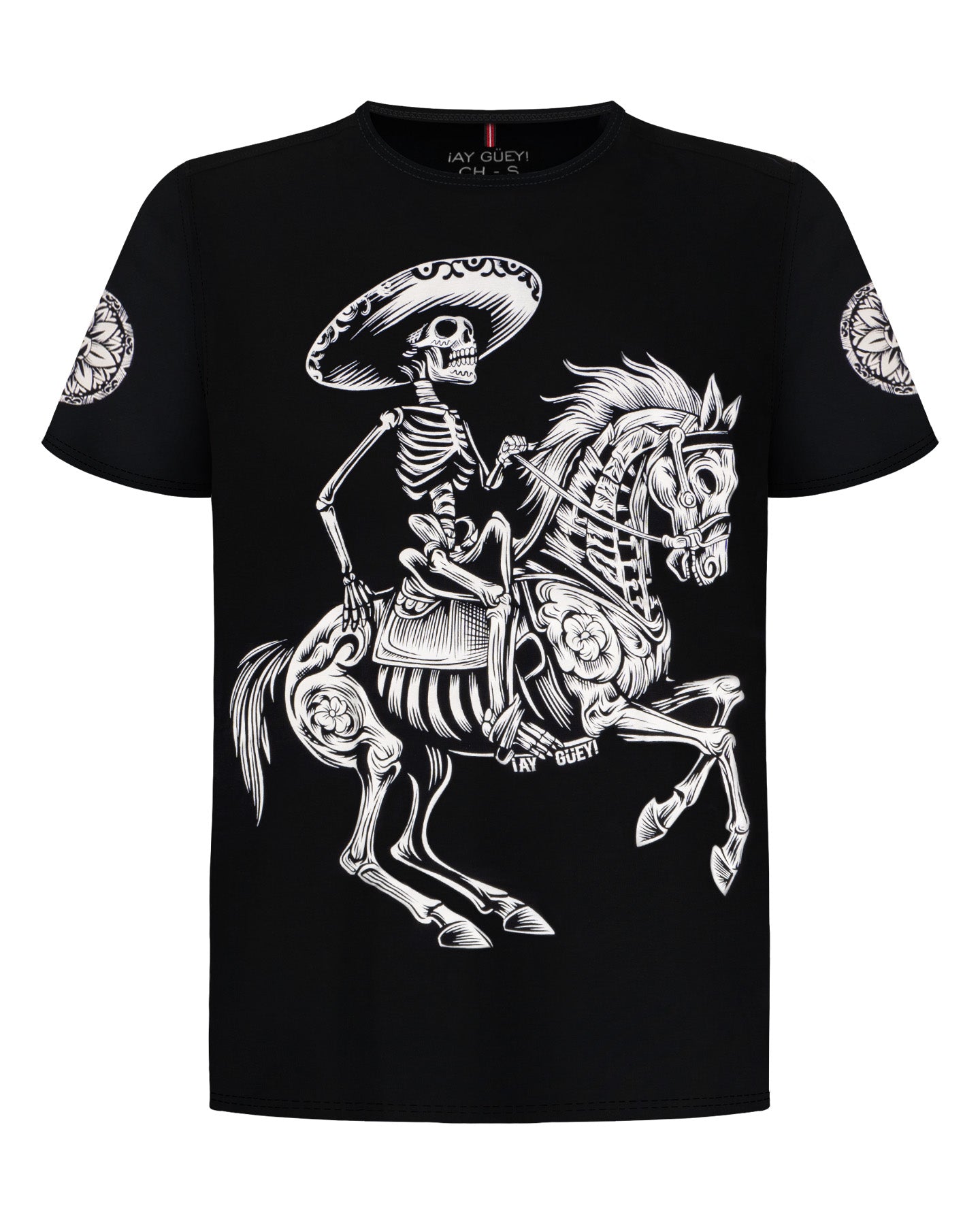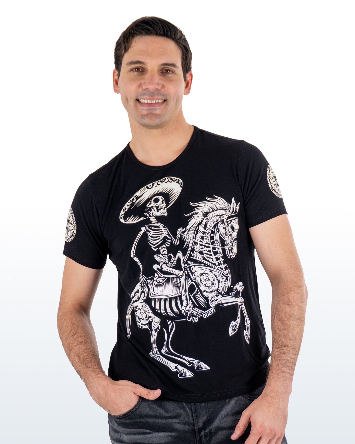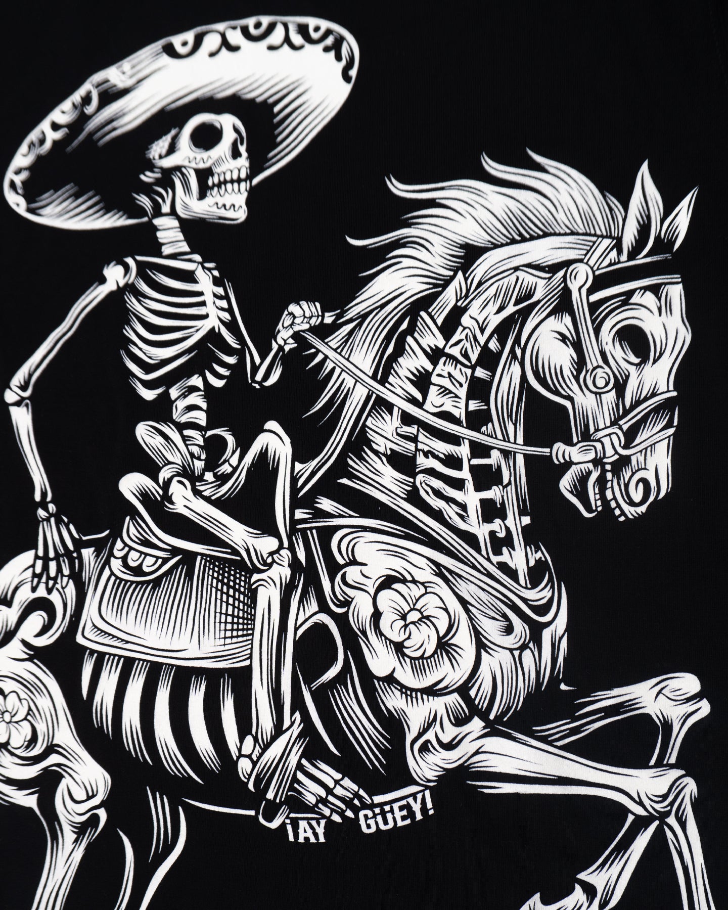 Este diseño nace del cruce entre la tradición mexicana del Día de Muertos y la iconografía heroica del charro revolucionario, reinterpretado con un estilo audaz y monocromático. La figura central es una calavera montando un caballo, símbolo del centauro del norte, un espíritu indomable que cabalga entre la vida y la muerte.