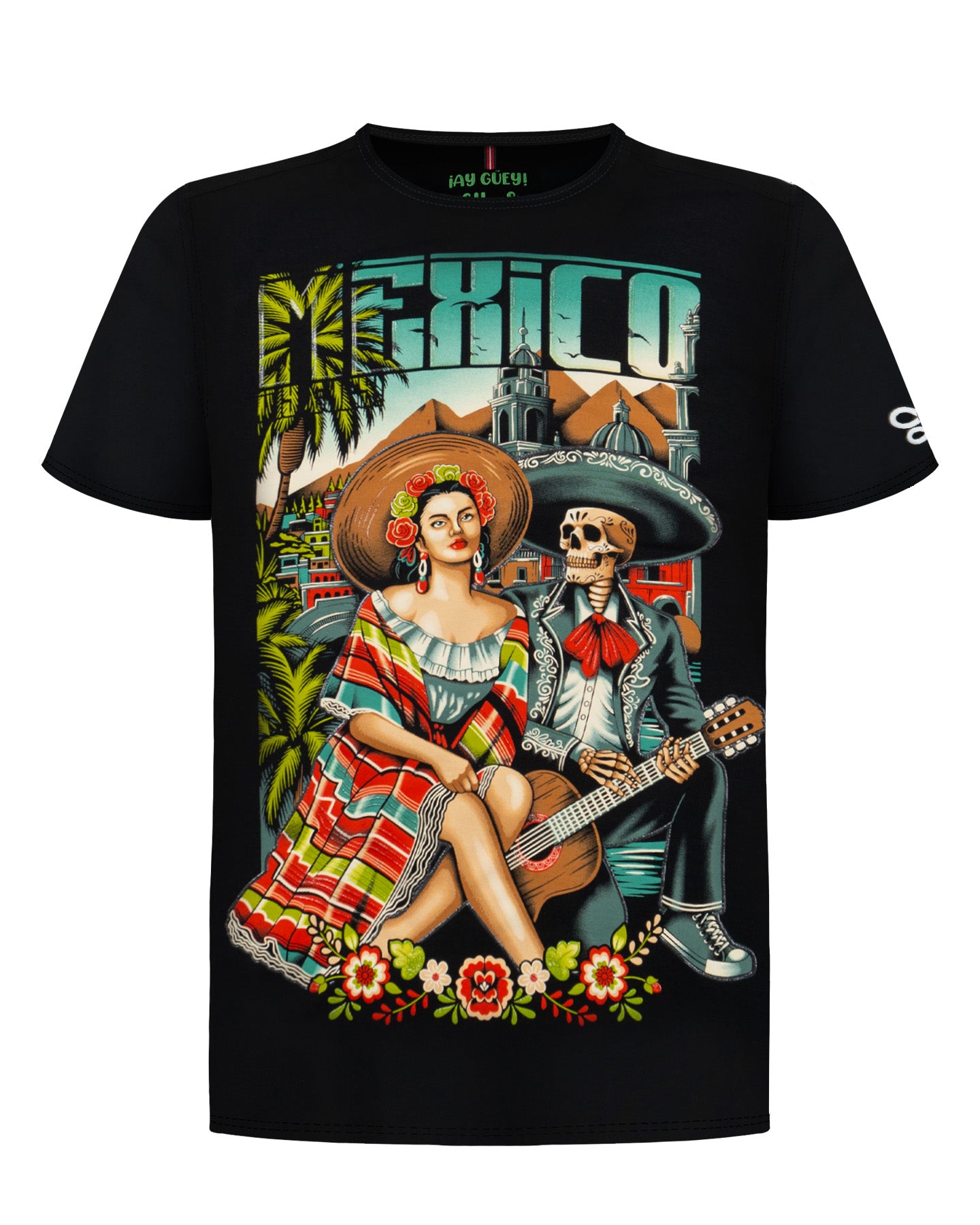 Inspirada en el mestizaje cultural, esta playera fusiona la vida y la muerte. Una mujer en atuendo folclórico y un esqueleto mariachi coexisten, simbolizando la riqueza de las tradiciones mexicanas, desde la celebración del Día de Muertos hasta la música popular. La obra evoca la herencia y el folclore del país.