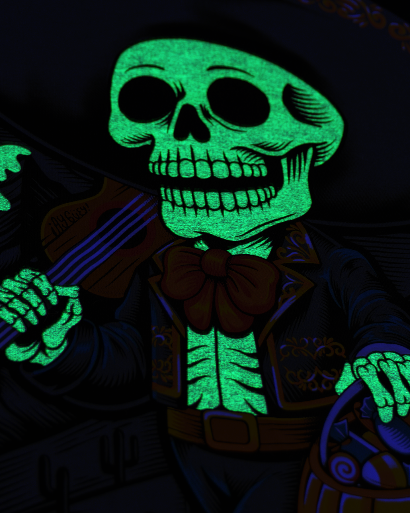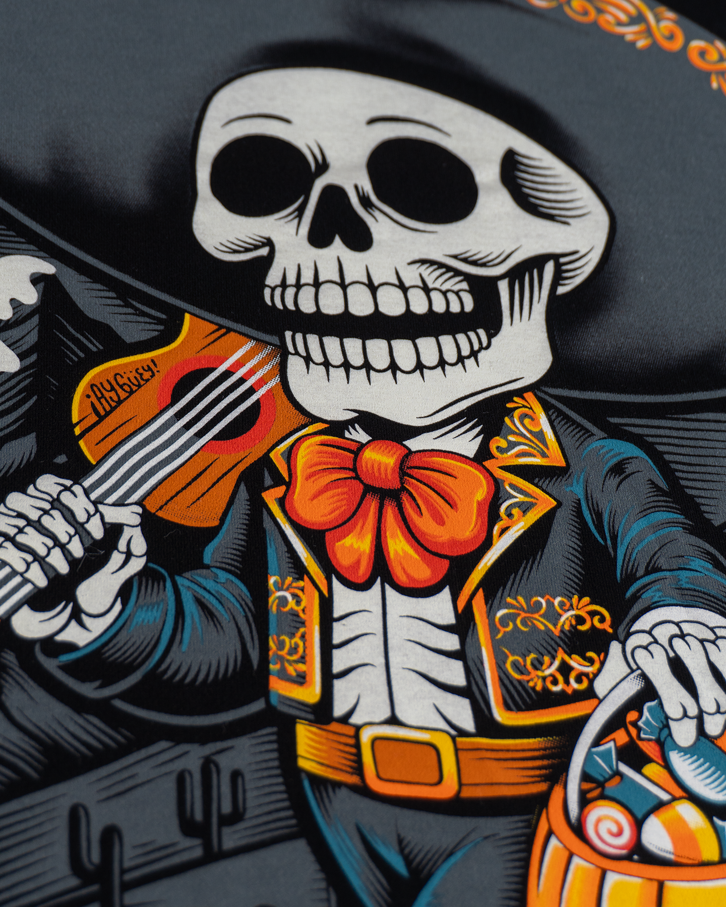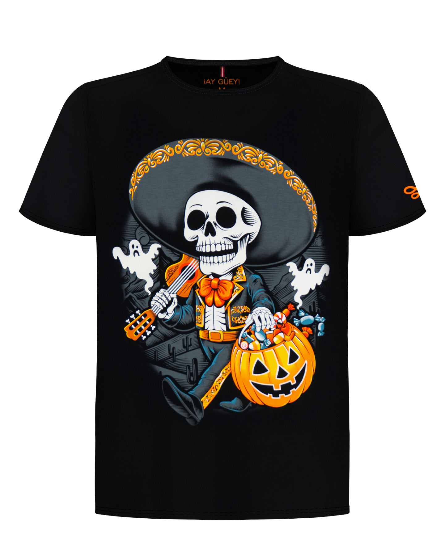 "Mi Calaverita" es más que una prenda; es una celebración de la inclusión cultural. Inspirada en la convivencia de tradiciones en un México globalizado, este diseño único representa a un mariachi que fomenta la empatía y la curiosidad.
