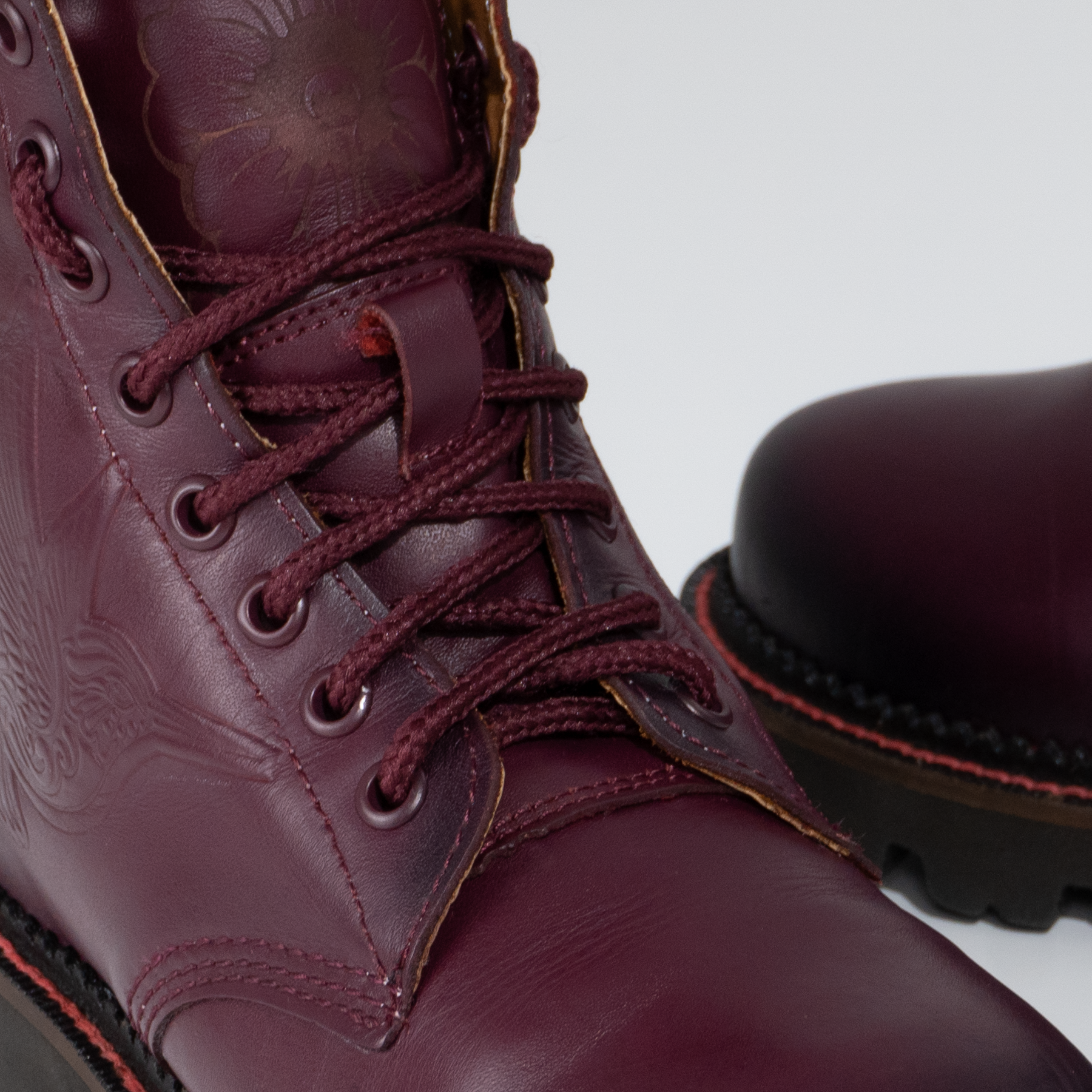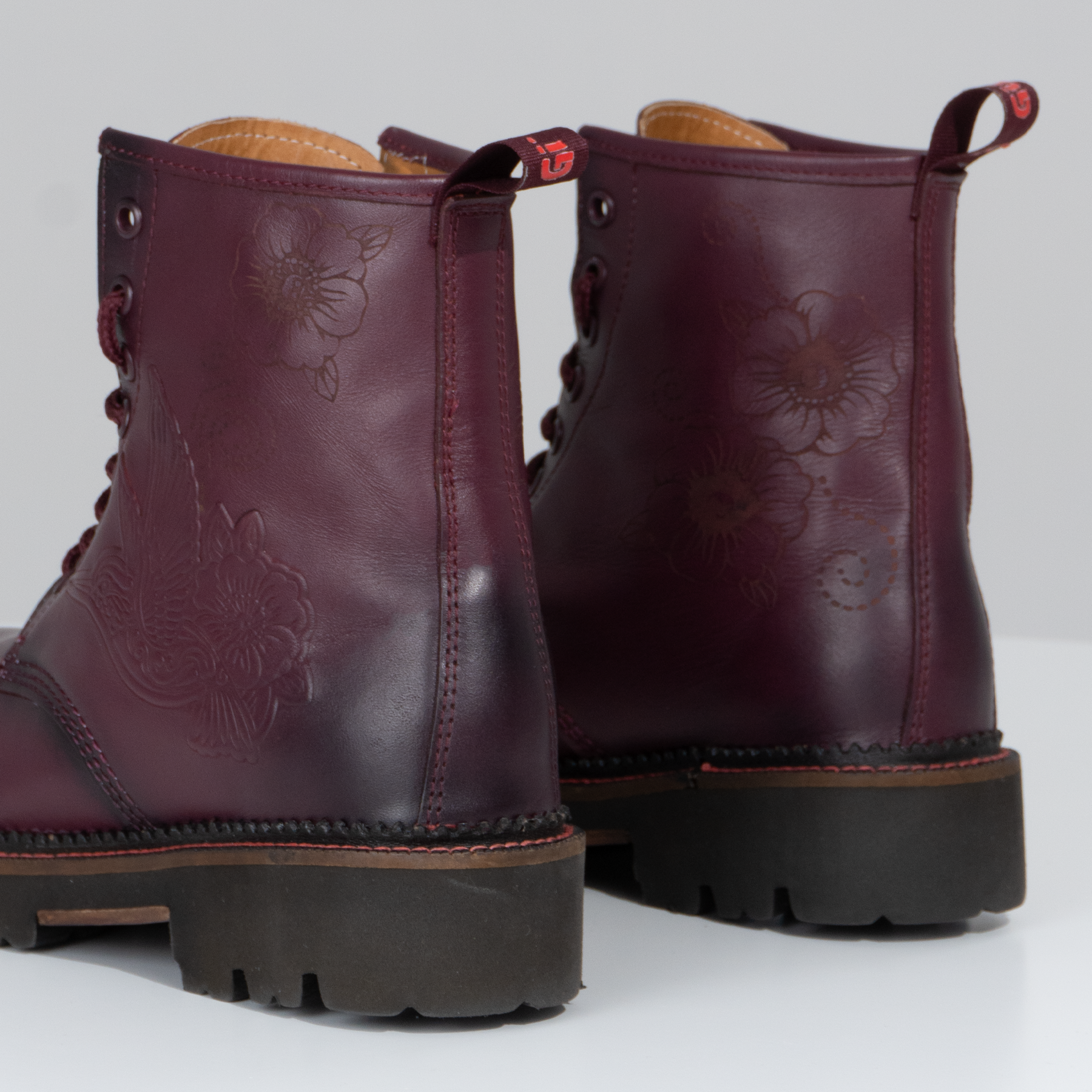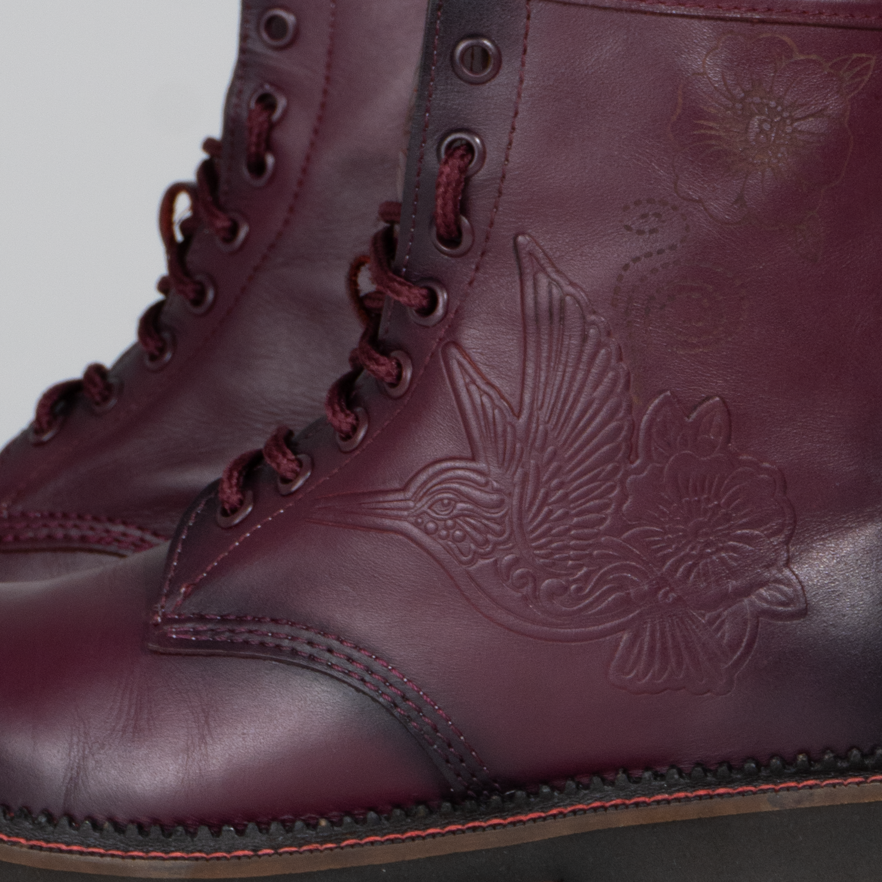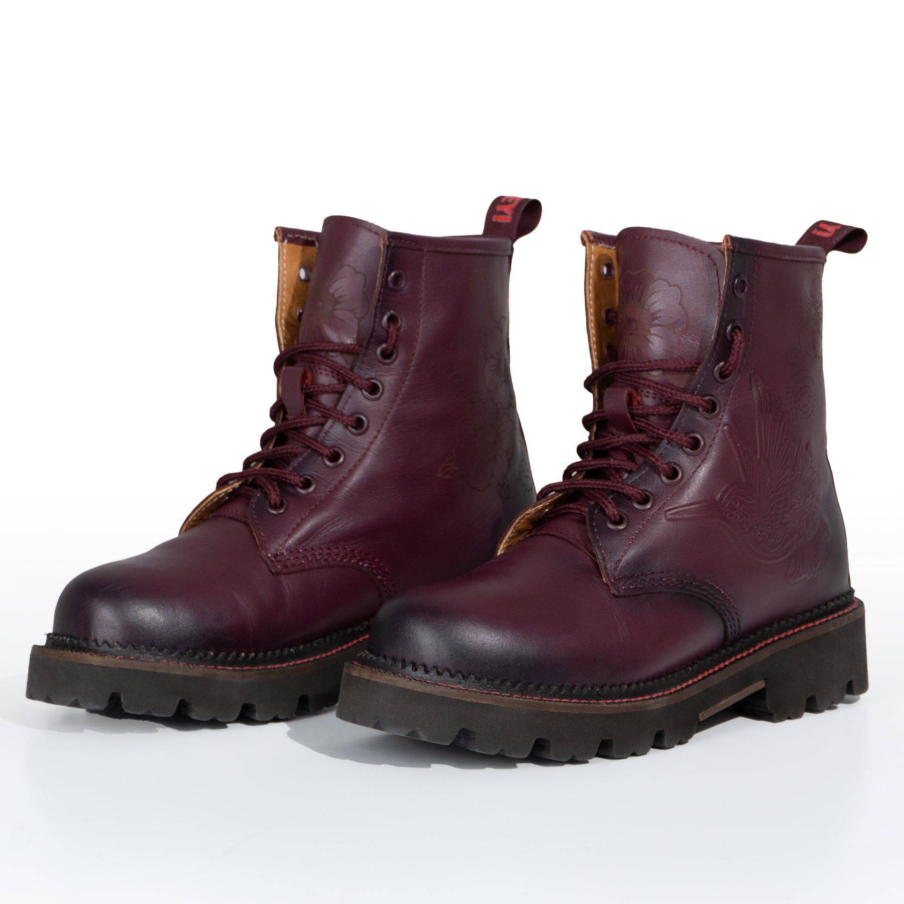 ¡Descubre la belleza de las botas "La Cardenal"! Hechas de piel de alta calidad en un hermoso color guinda y con un elegante grabado de colibrí en los laterales. Estas botas son cómodas y ligeras, perfectas para llevar en cualquier ocasión. ¡Recorre México con este hermoso par!
