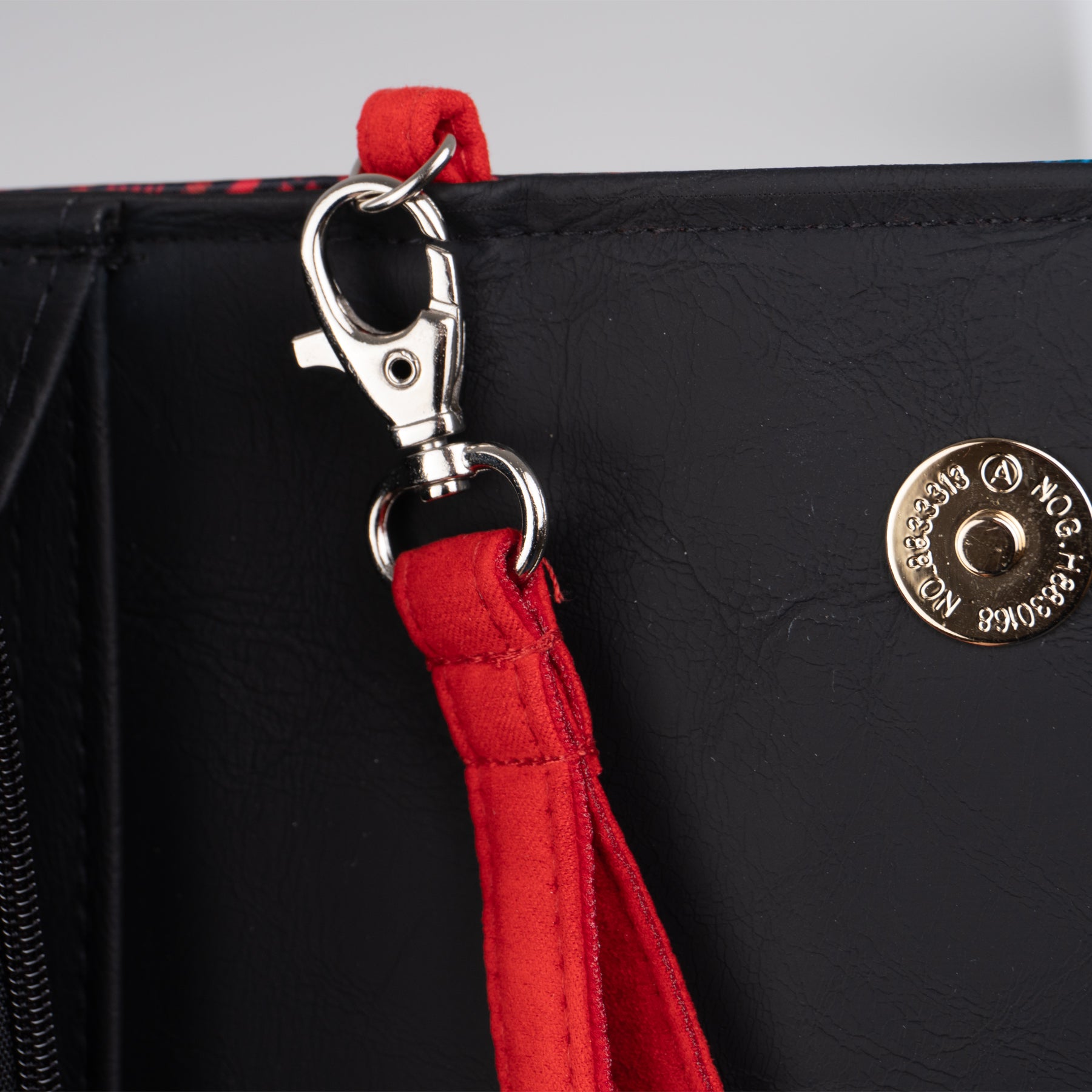 Cuenta con aplicaciones de vinil metalizadas y correa removible.