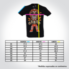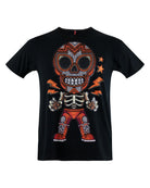 Playera negra de manga corta y cuello redondo, la inspiración de este diseño es la lucha libre mexicana, y los muñecos de cartonería mexicana, el diseño esta realizado con la técnica de bordado y huichol, buscando ser una mezcla de técnicas y conceptos, cuenta con aplicación de gel en las cuentas de guicos para resaltar los detalles.