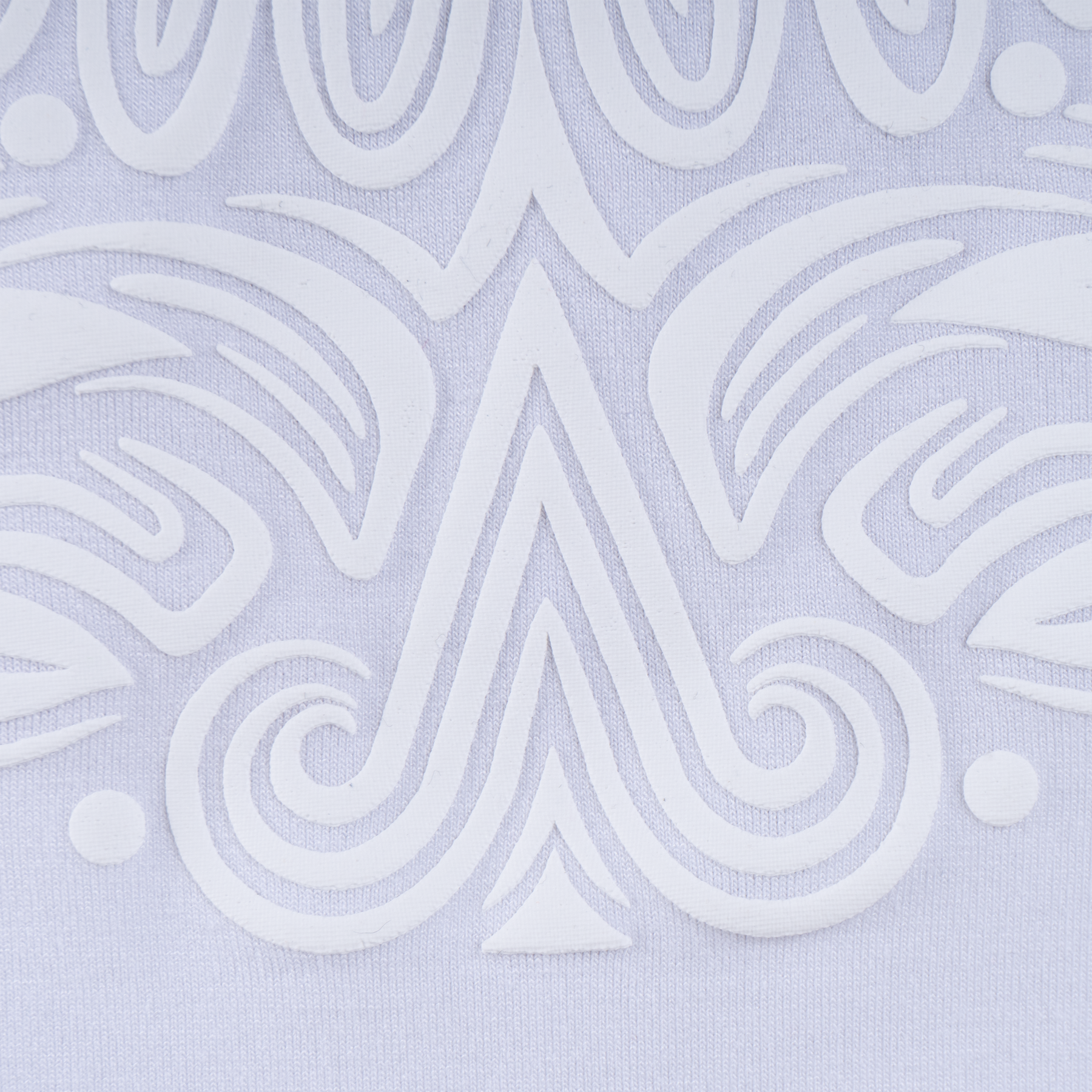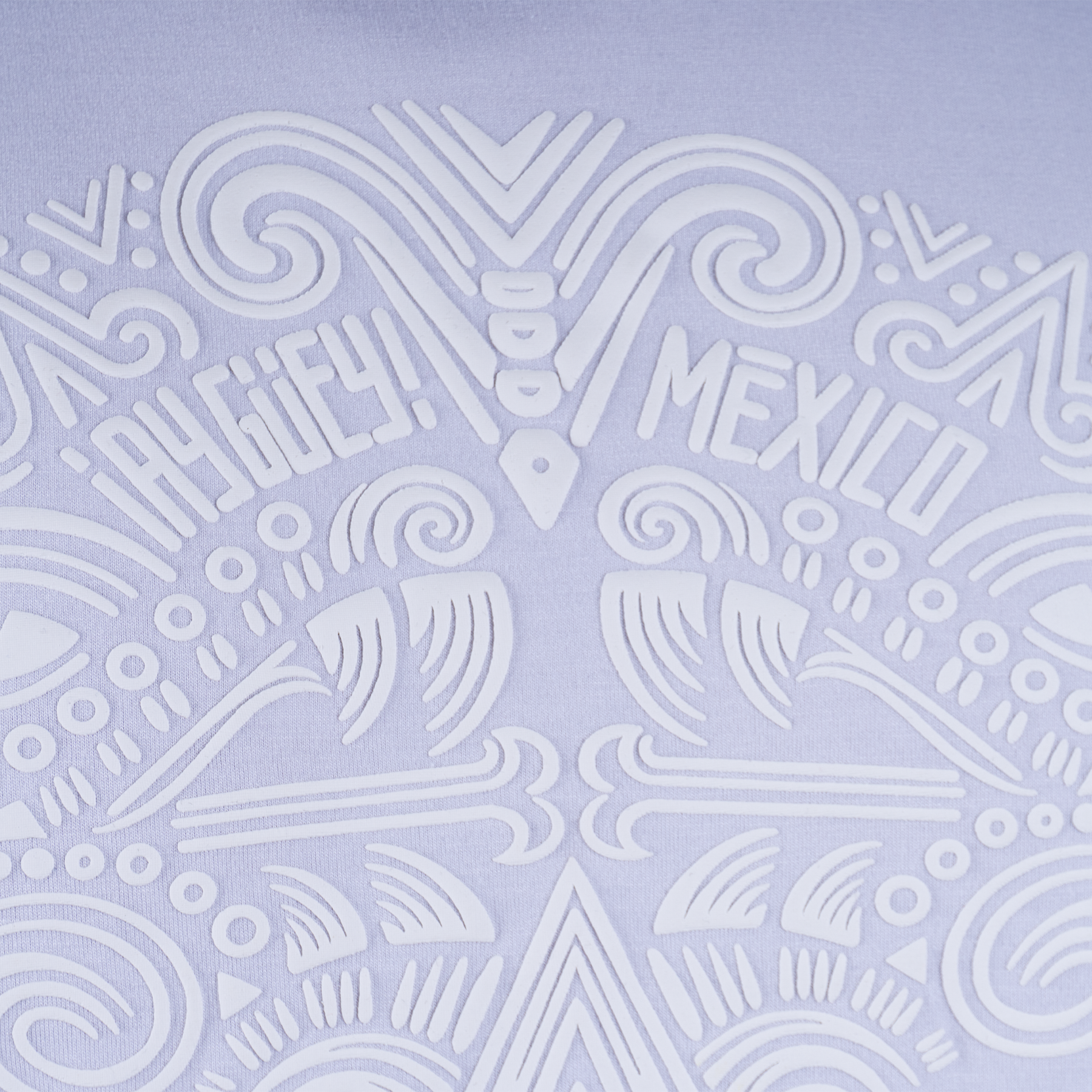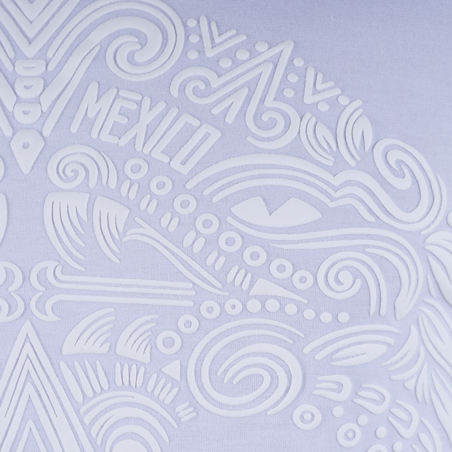 Es una playera blanca de manga corta con aplicación en PUFF blanco. Ideal lugares donde hace calor y su característica monocromática la hace muy combinable. Esta inspirada en el vuelo del dios Quetzalcóatl que subió al volcán de Orizaba y su cuerpo fue consumido por el fuego mientras que su alma adoptó la forma de quetzal. Después emprendió el vuelo como una estrella brillante.