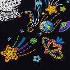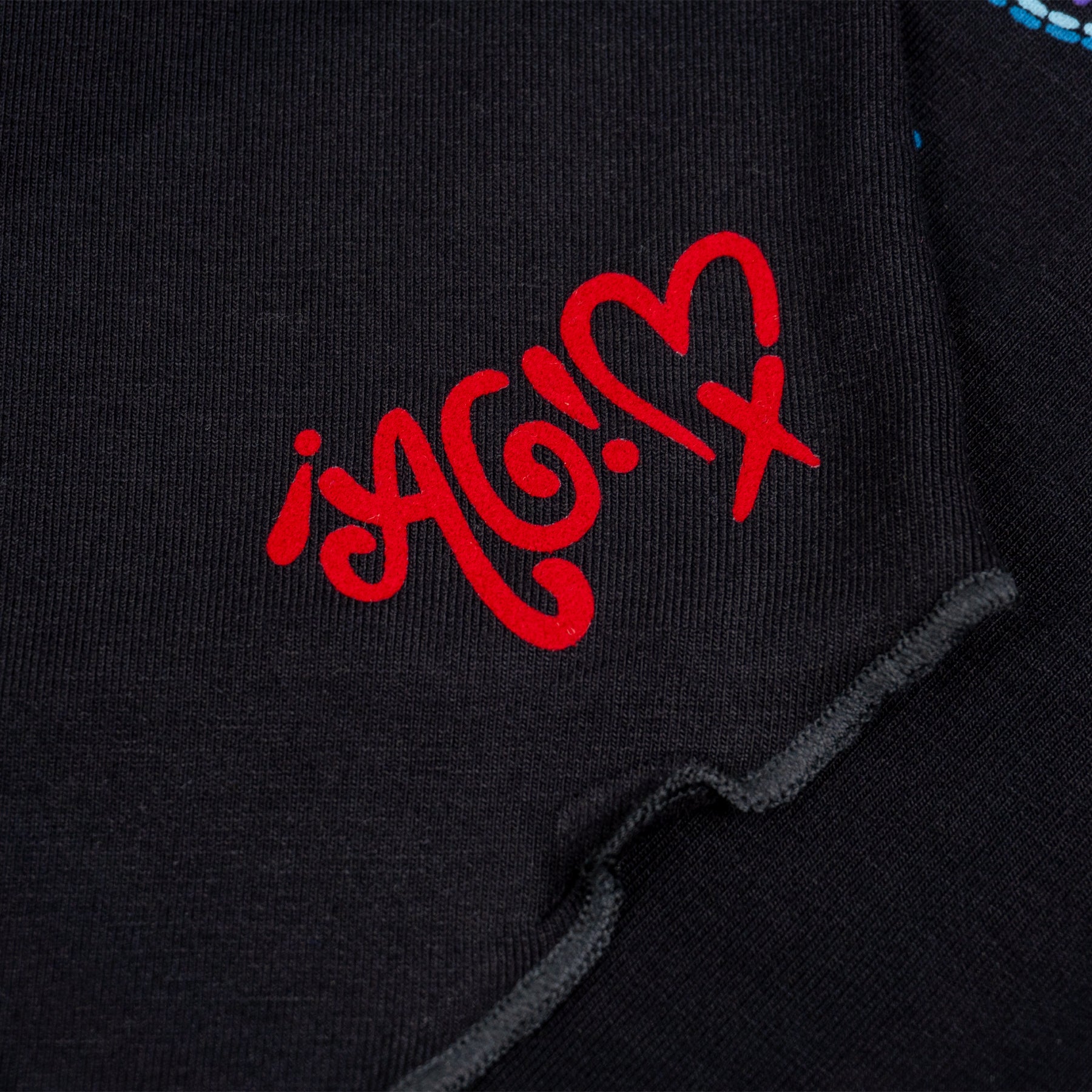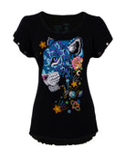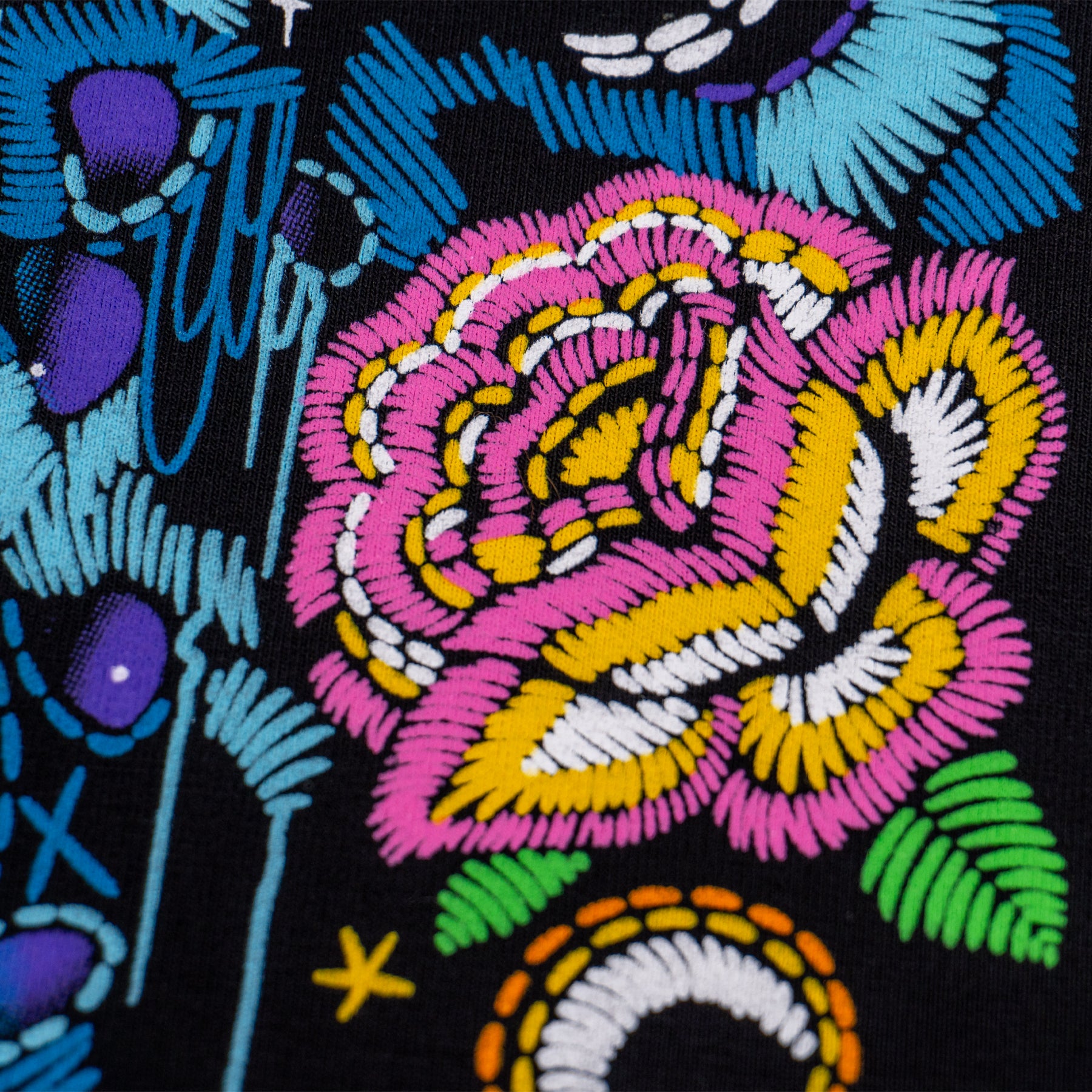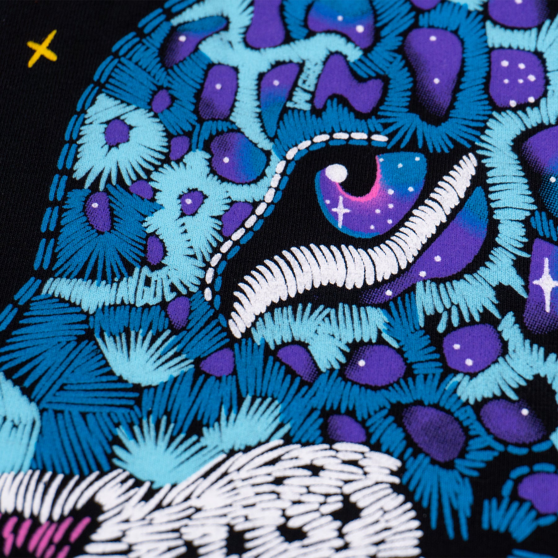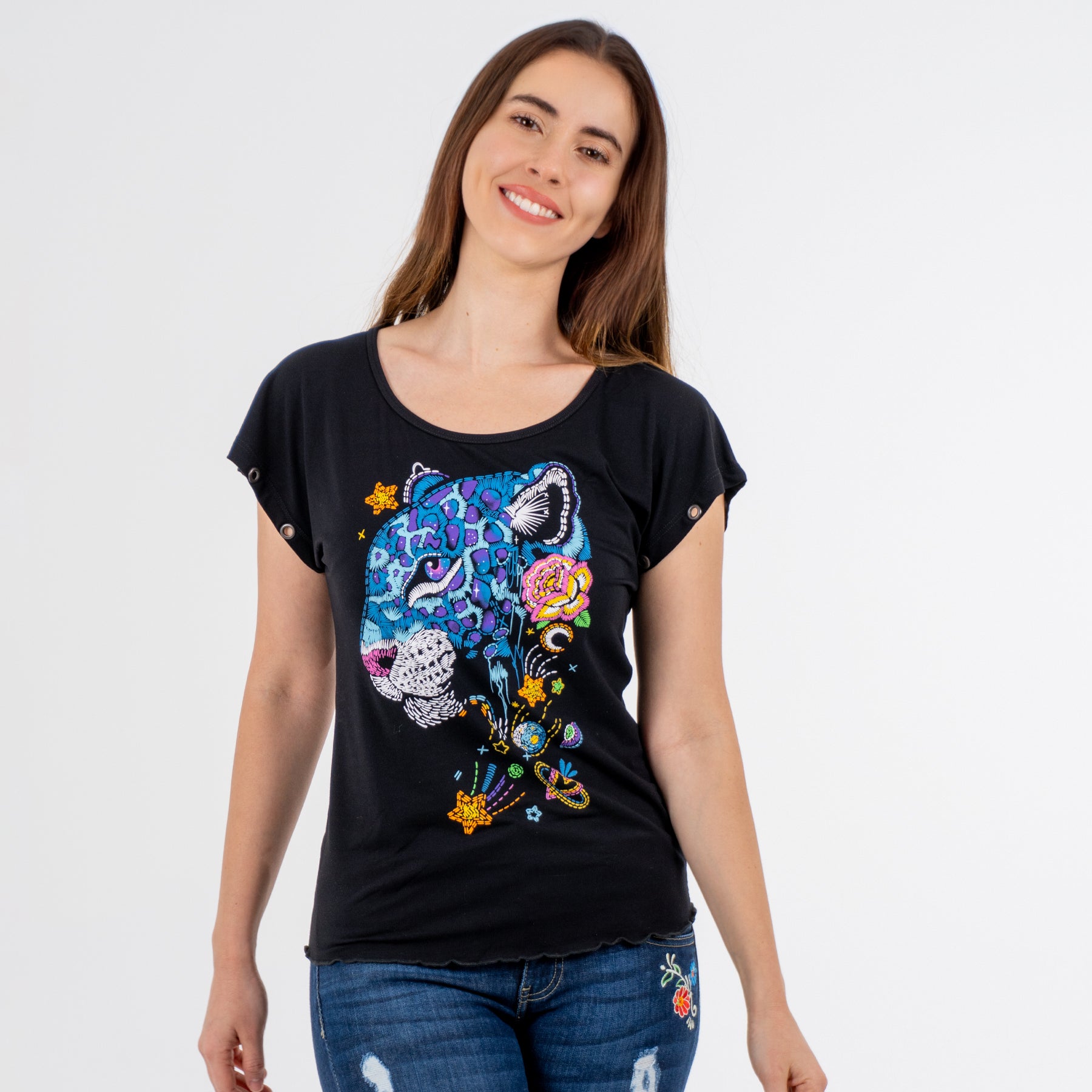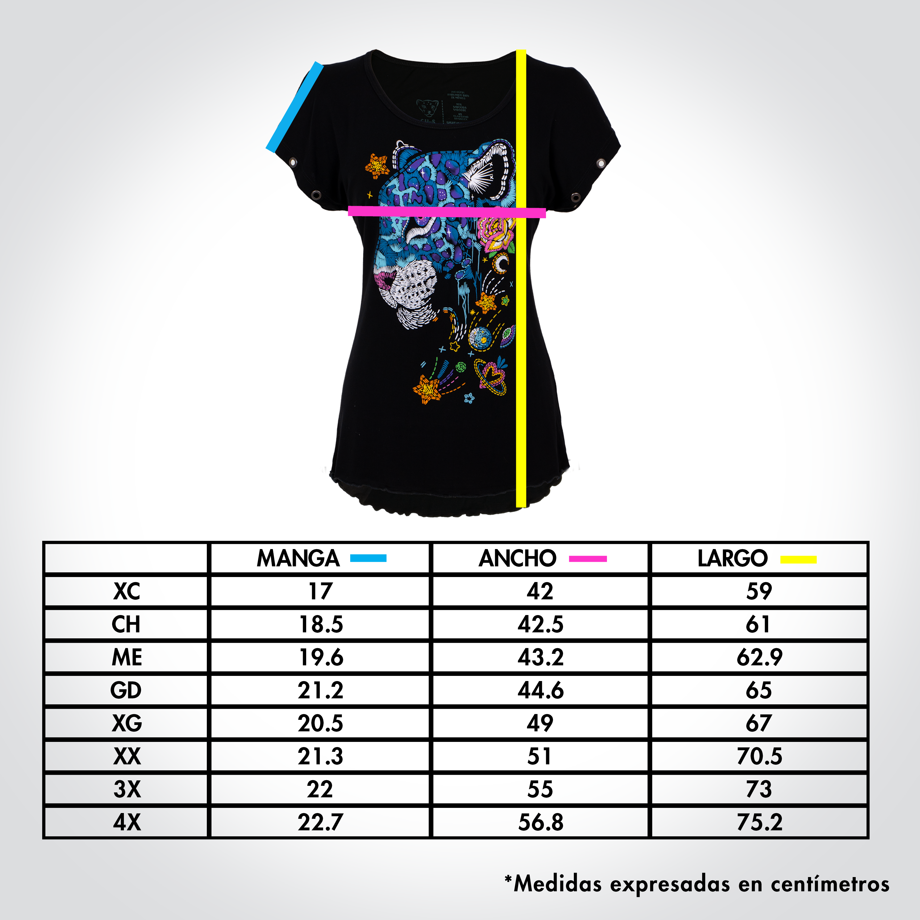Playera de manga corta y cuello redondo en color negro, este diseño esta inspirado en los bordados. Se basa en el jaguar, personaje omnipresente en la cosmogonía de los pueblos mesoamericanos, combinando diferentes estilos para darle un toque colorido y llamativo.