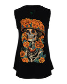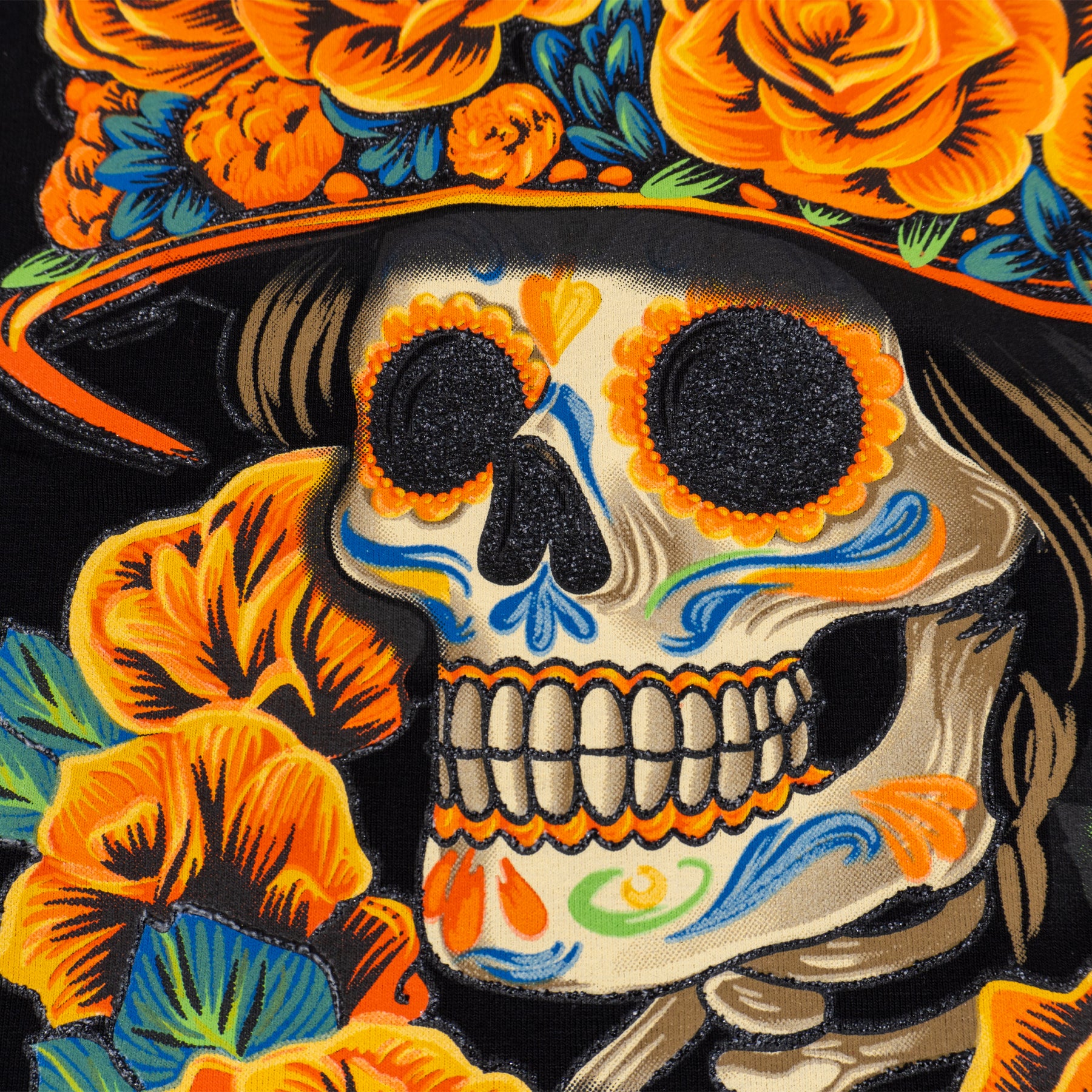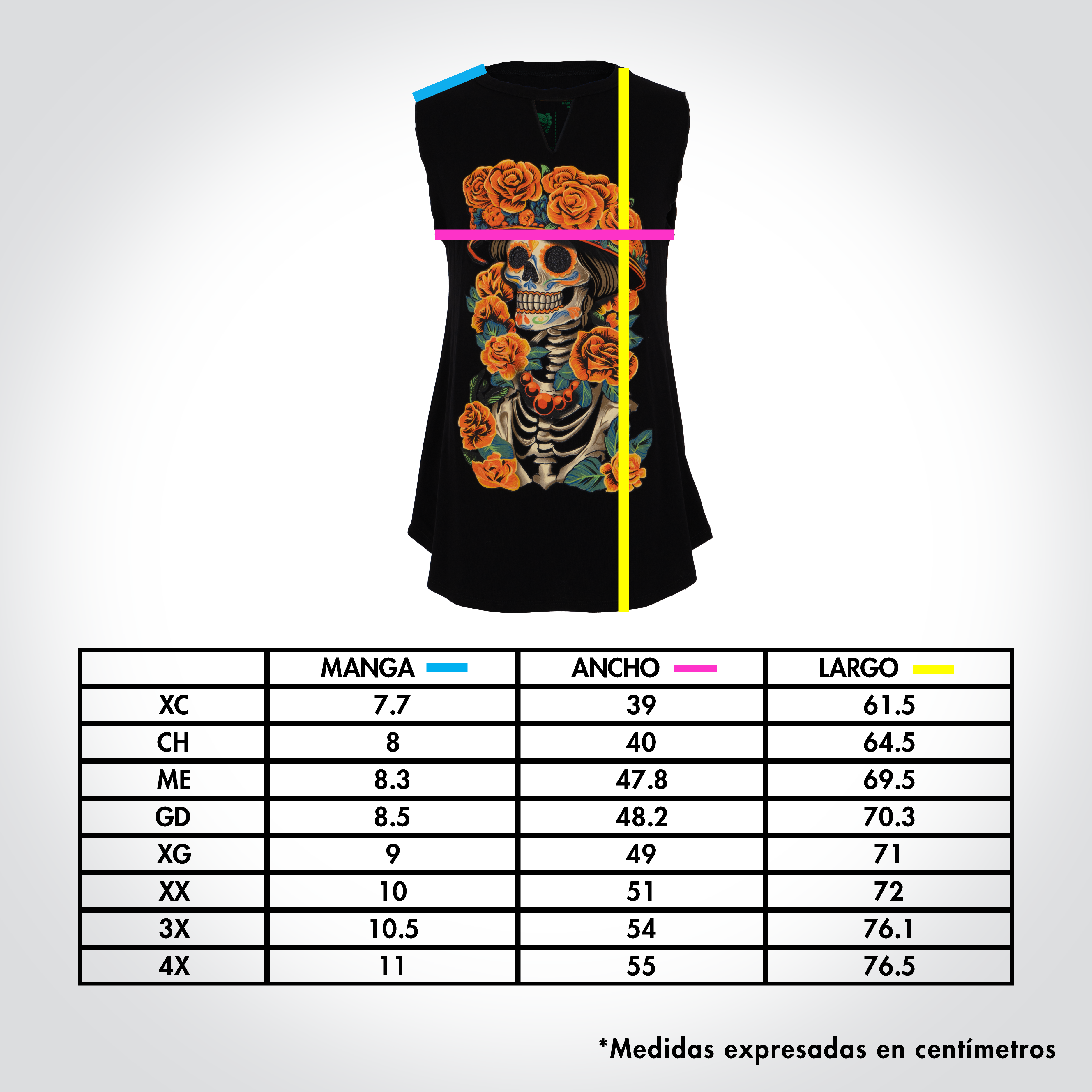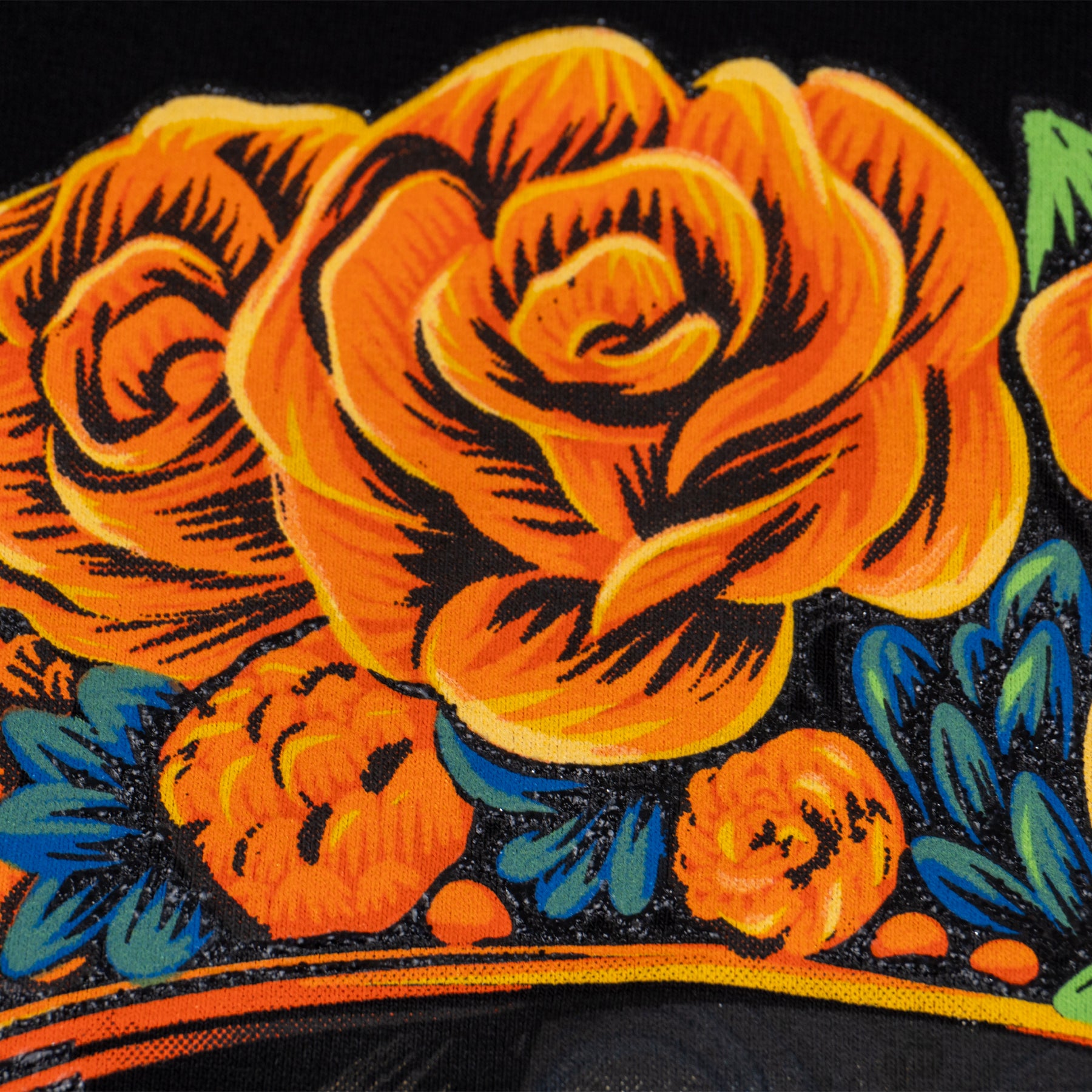 Playera de dama en color negro con manga corta, estampada al frente. En uno de los diseños predilectos para el Día de Muertos, nuestra querida Catrina esta rodedada de Cempasúchil y sus pétalos, en su textura y color, brillan casi como si estuvieran vivos, reflejando la luz de un sol que parece lejano, pero eterno.