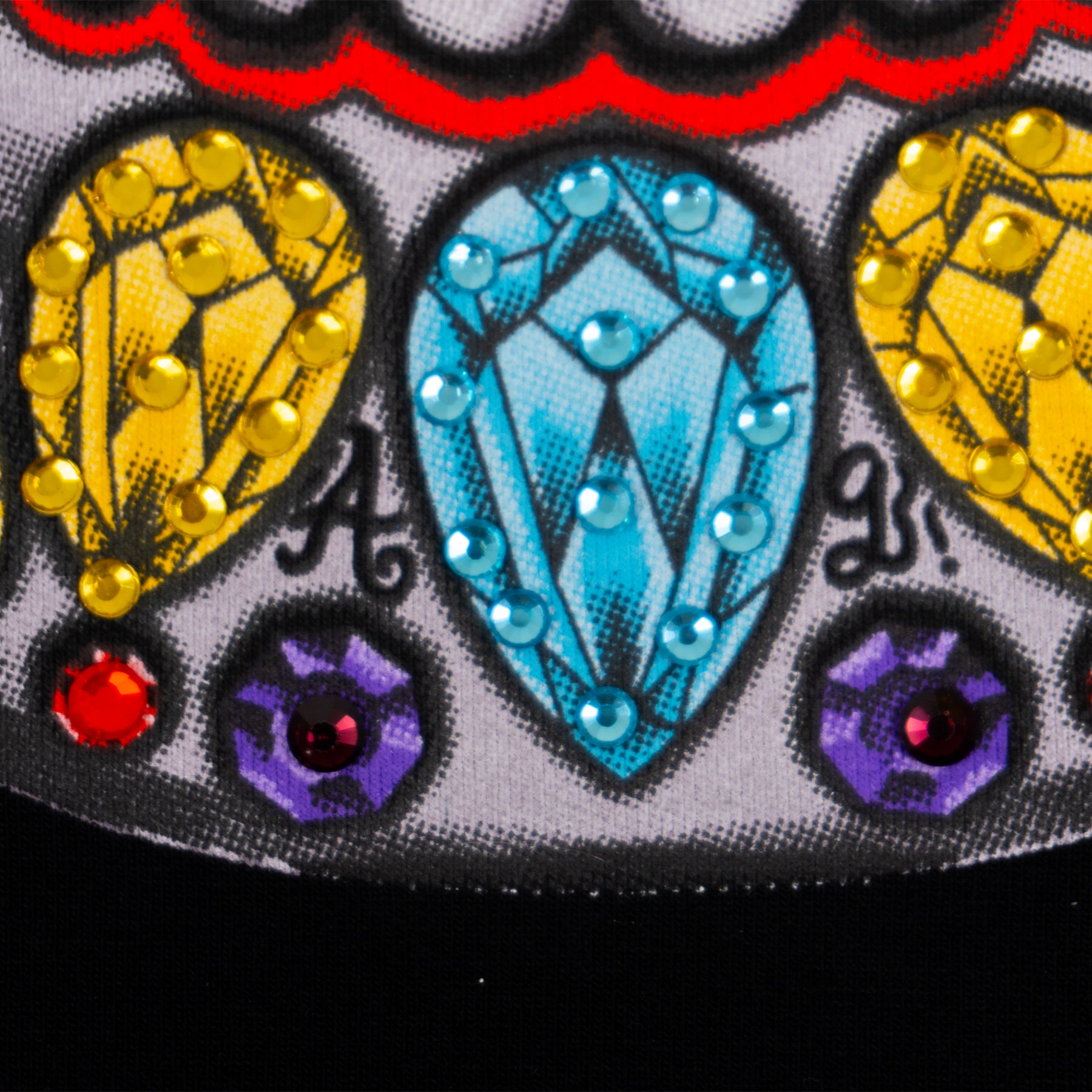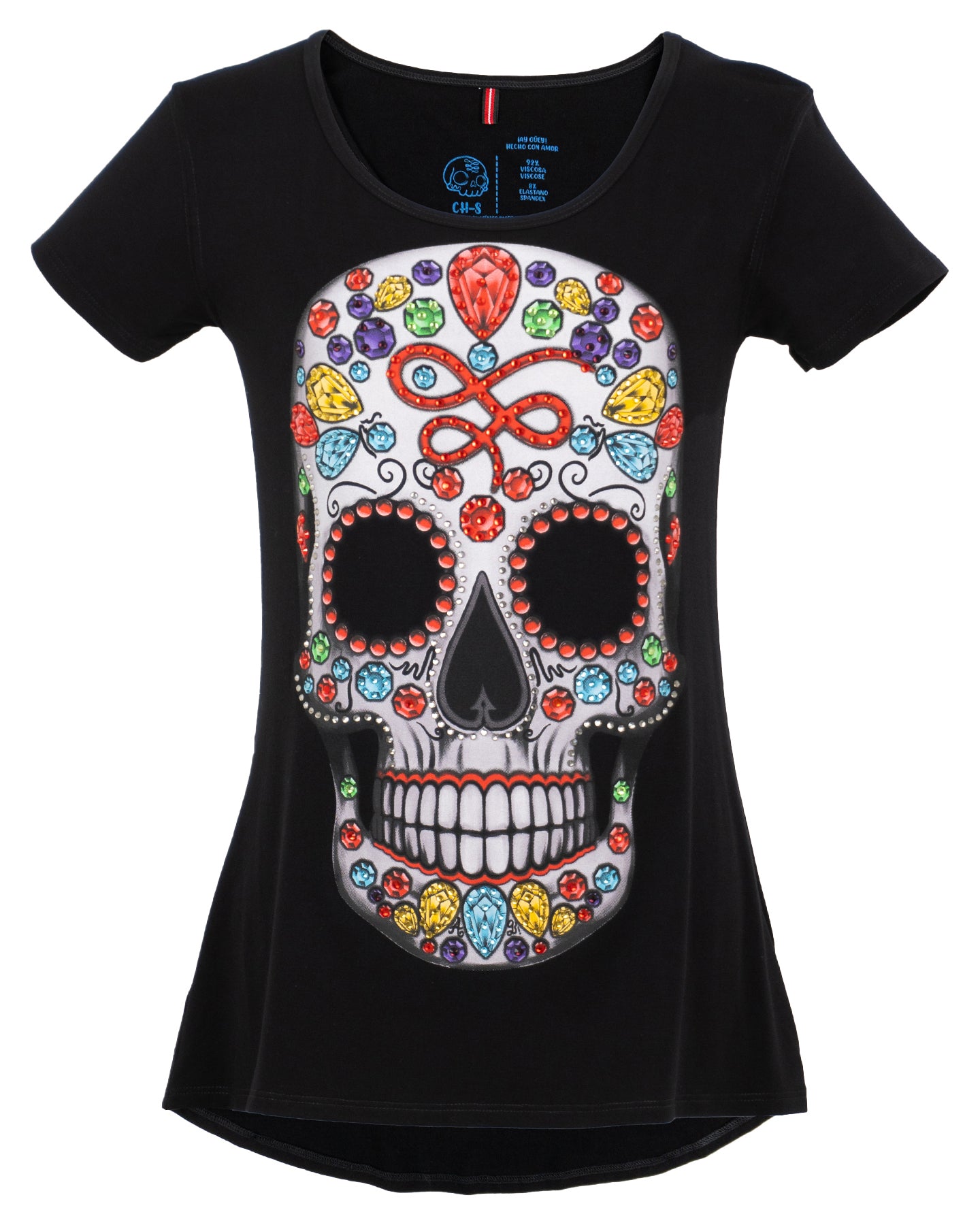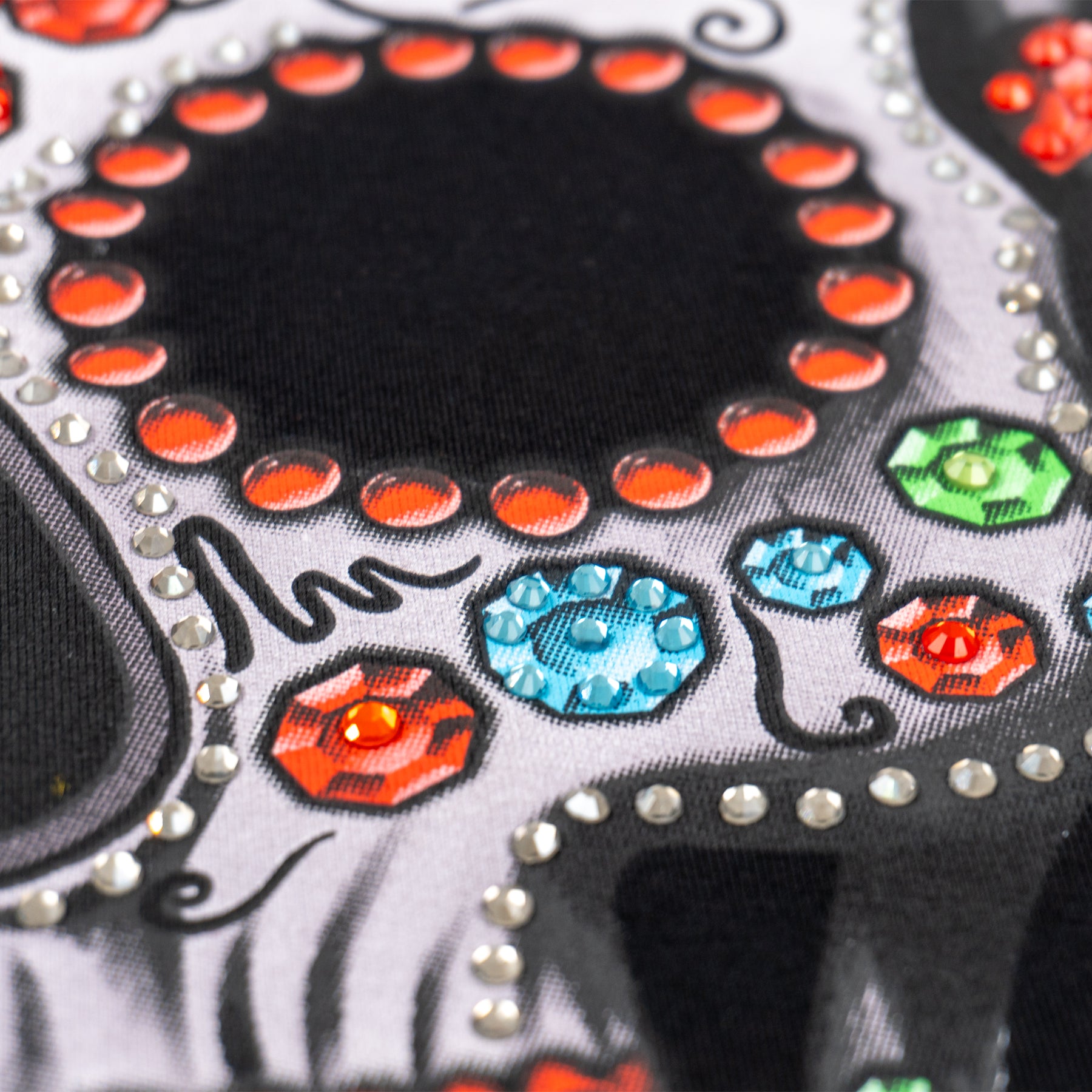 Convierte cada día en una celebración con esta vibrante playera. La calavera de azúcar, símbolo de la vida y la muerte, brilla con una intensidad que te hará el centro de atención.