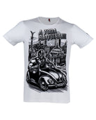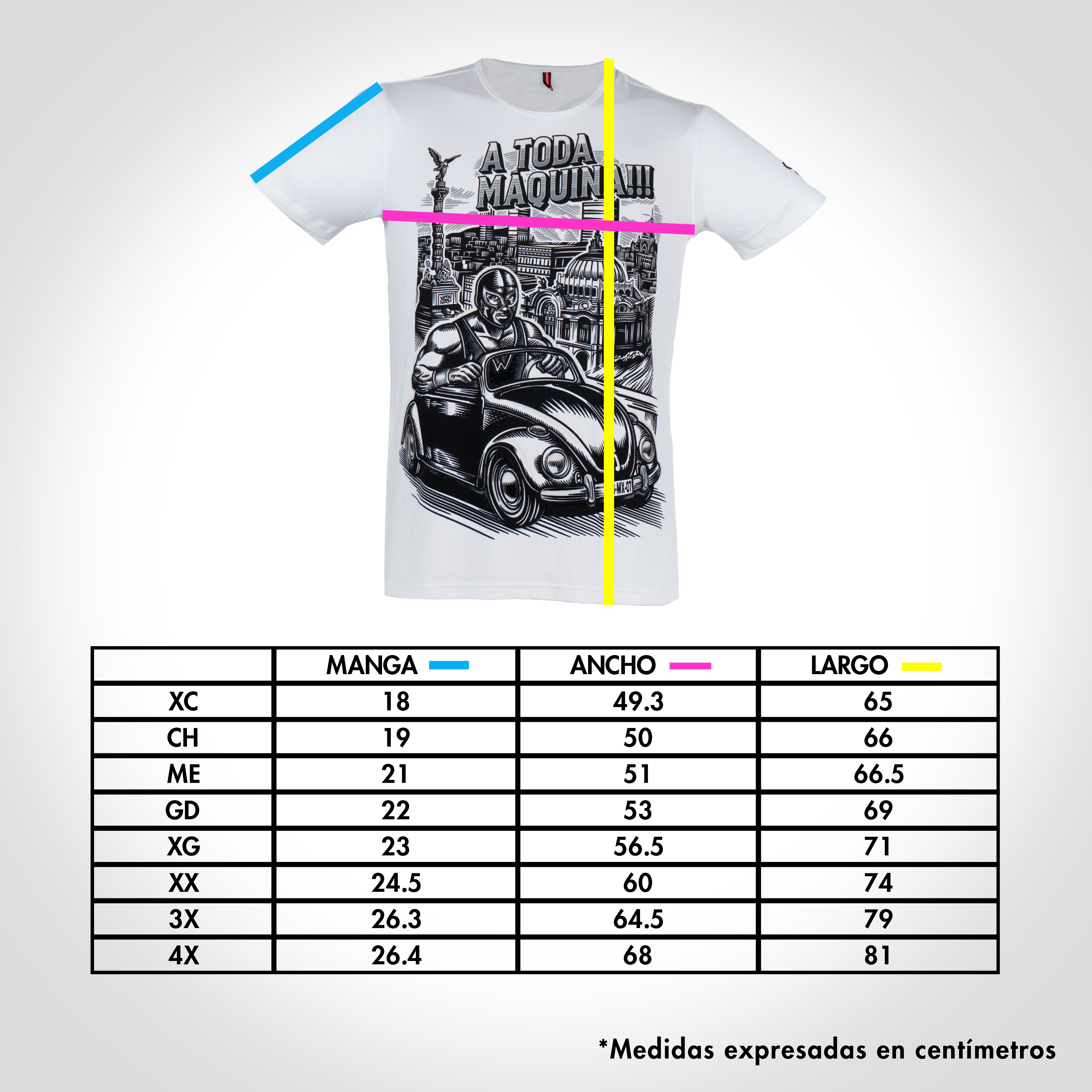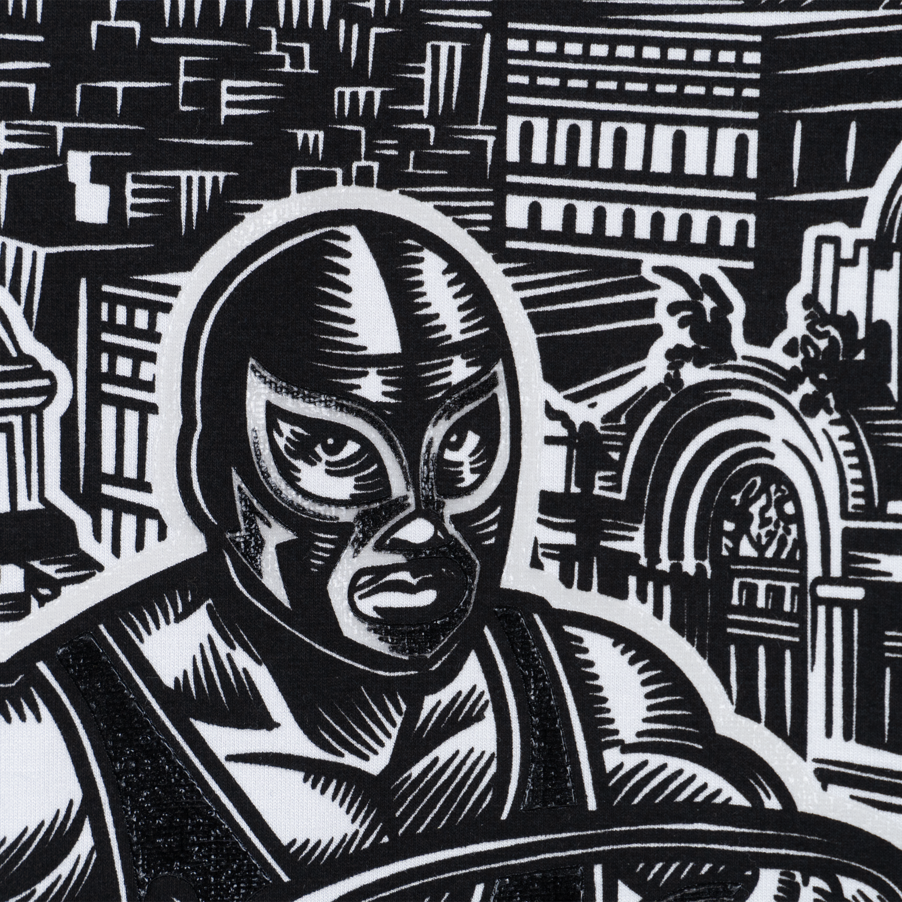 Diseño inspirado en el México de los 60's, donde la ciudad brillaba en todo su esplendor, como protagonista destaca un luchador que recorre los caminos vigilando el barrio. La técnica del dibujo asemeja los grabados sobre madera de la época.