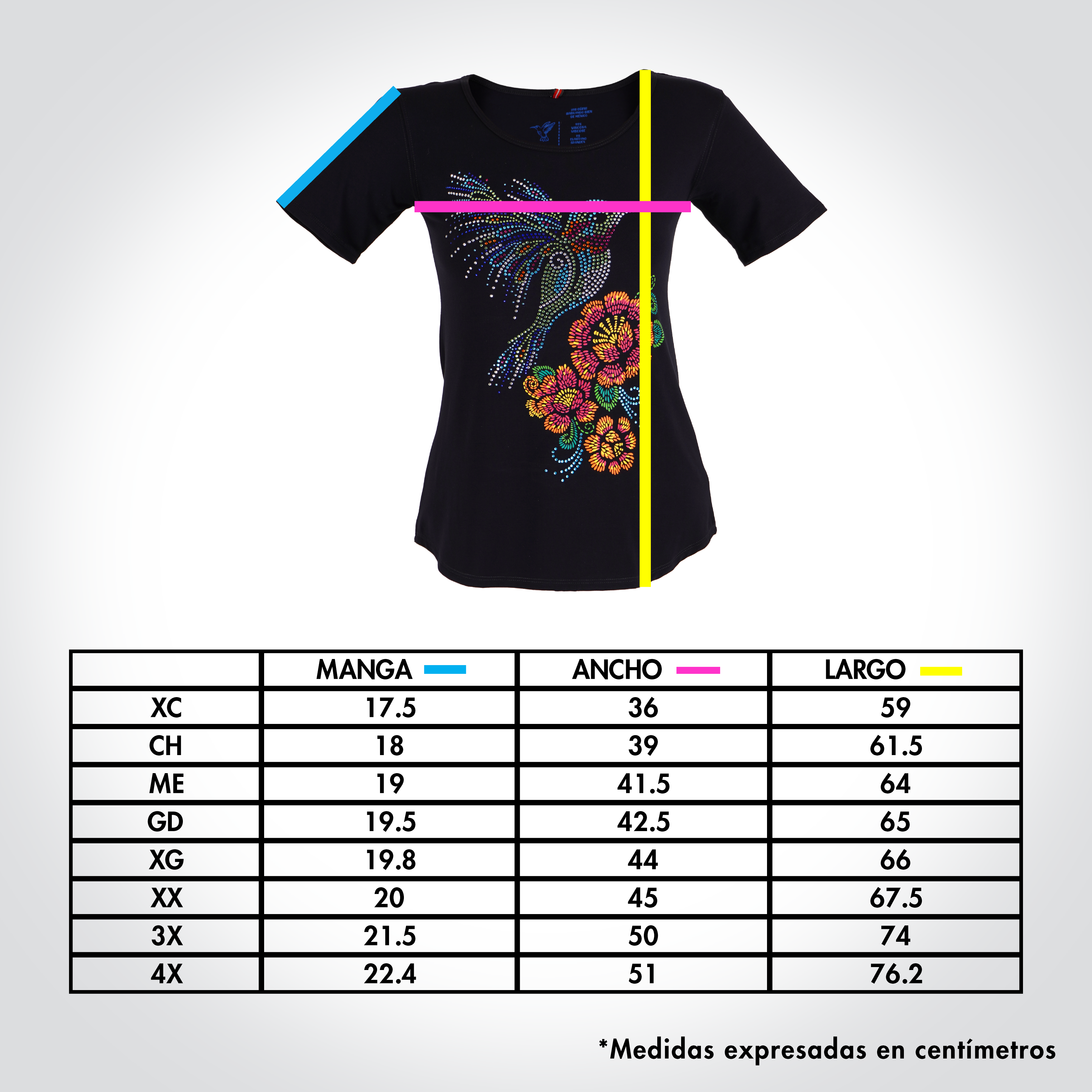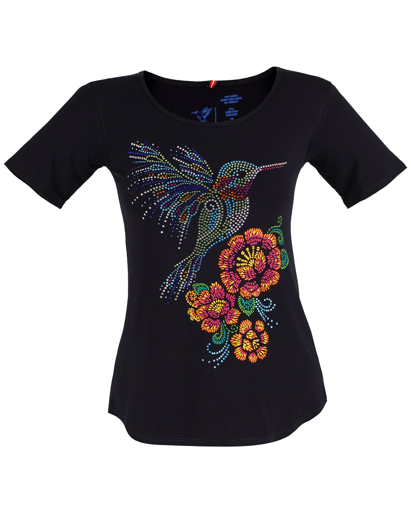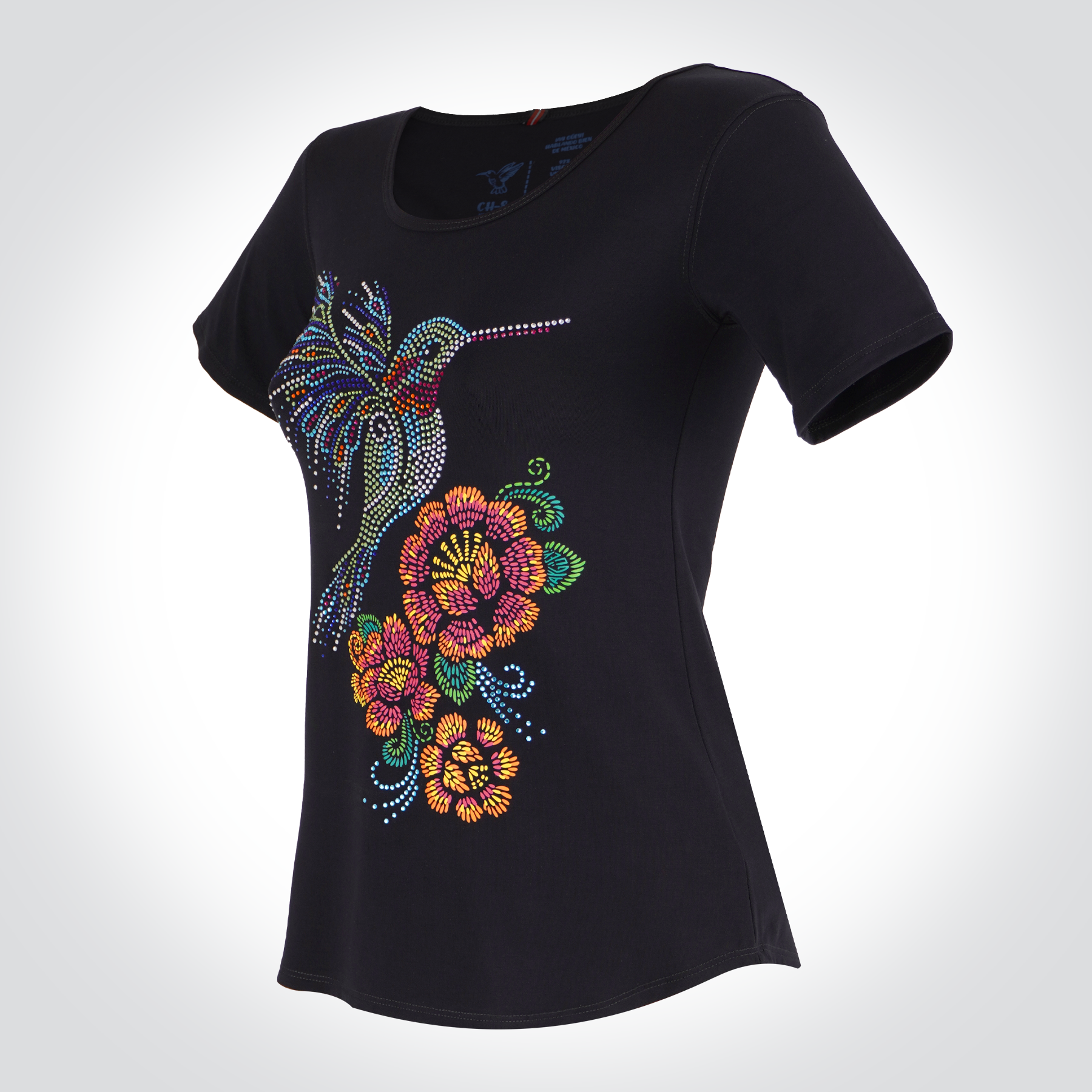 Playera básica de dama con cuello redondo. El estampado frontal tiene a un colibrí de pedrería con flores estampadas que emulan el bordado con hilo. Inspirada en el brillo del plumaje del colibrí, en la naturaleza y los bordados mexicanos.