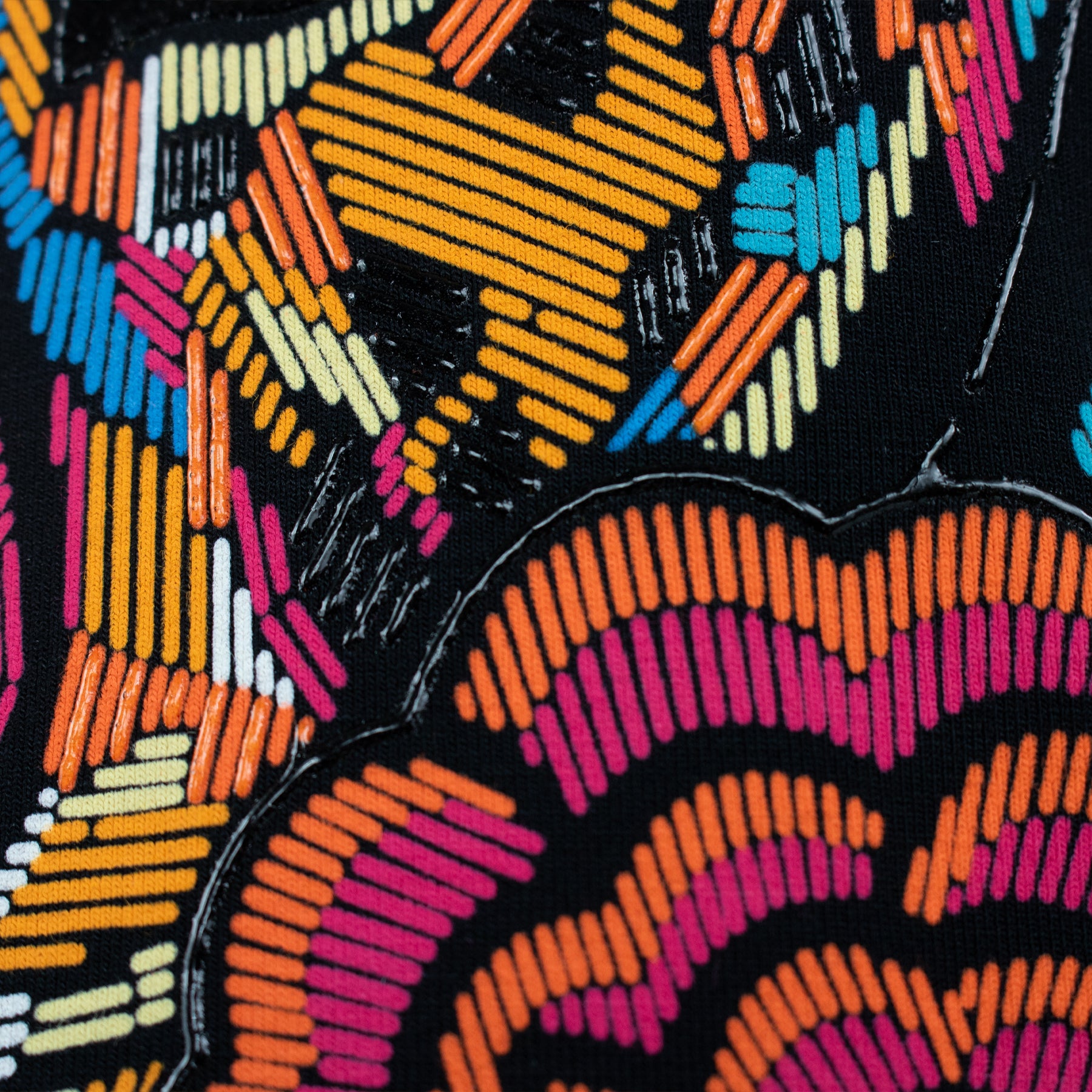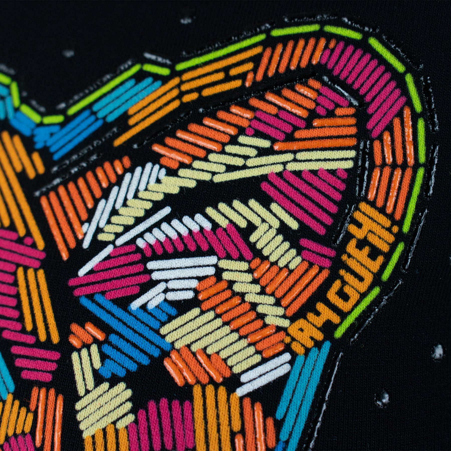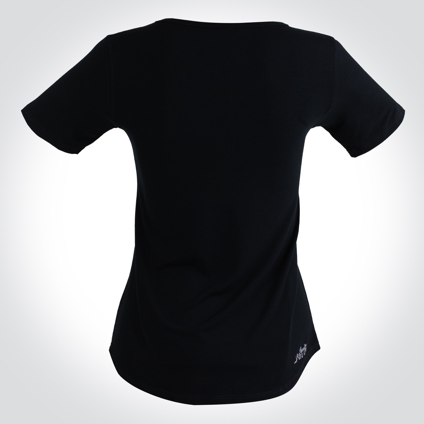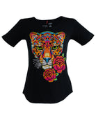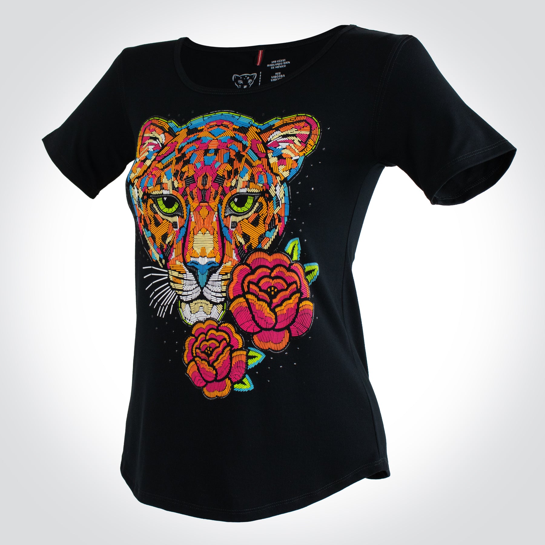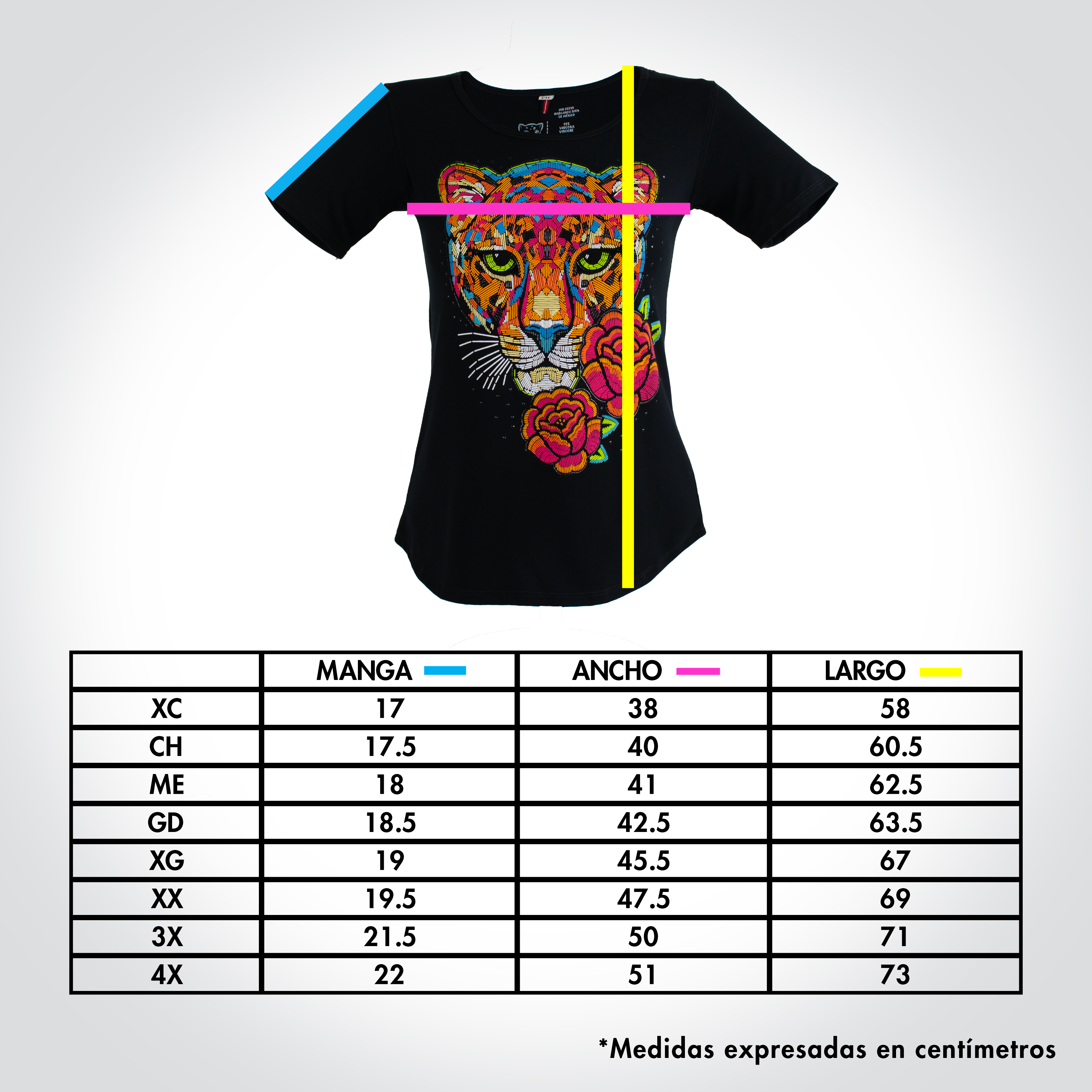 Playera de dama cuenta con aplicación en gel HD. La inspiración detrás de este diseño es el "Balam" mexicano y la técnica de popotillo, reconocido por el uso de fibras secas de zacate para representar imágenes compuestas.