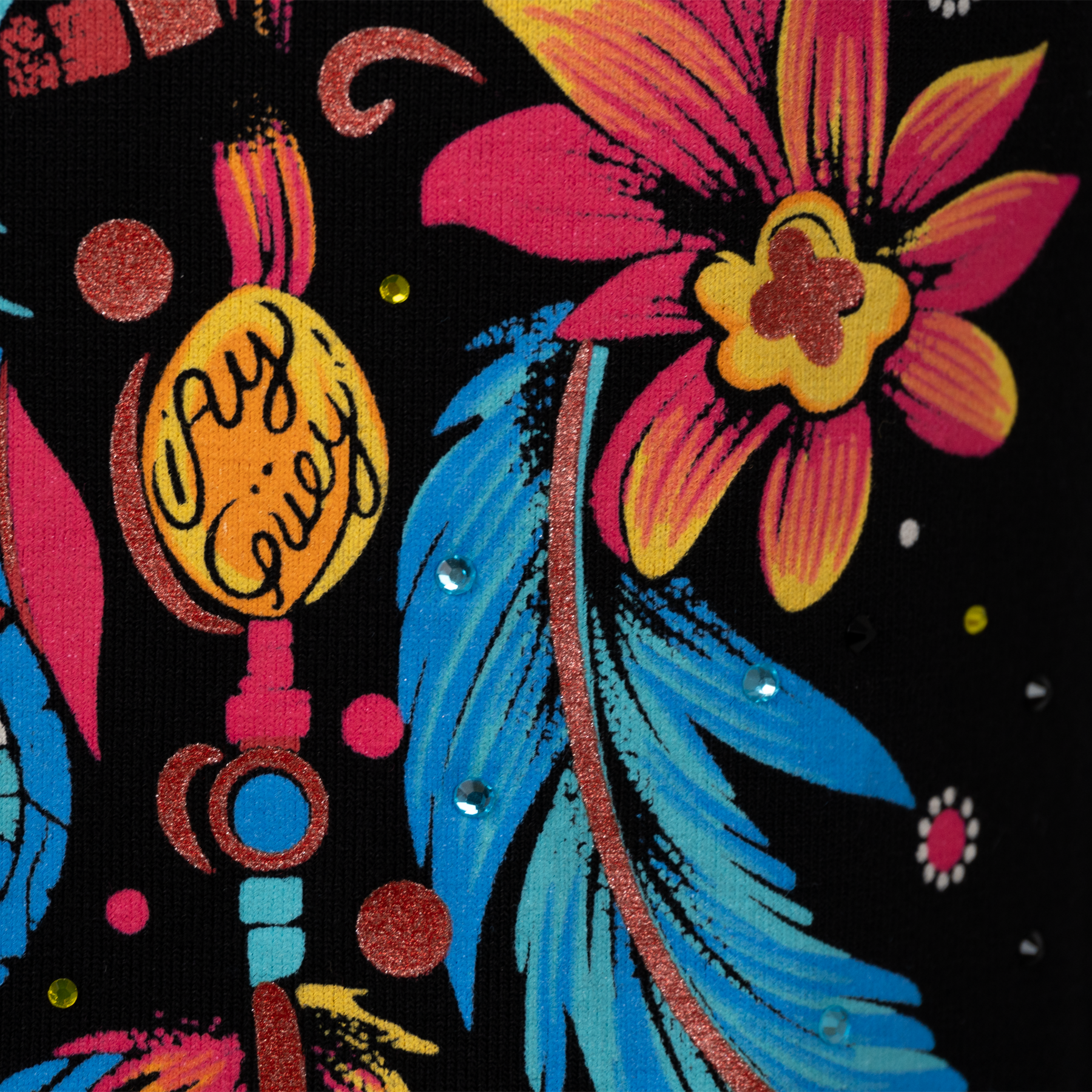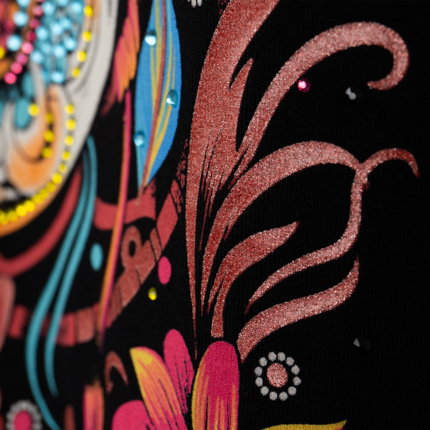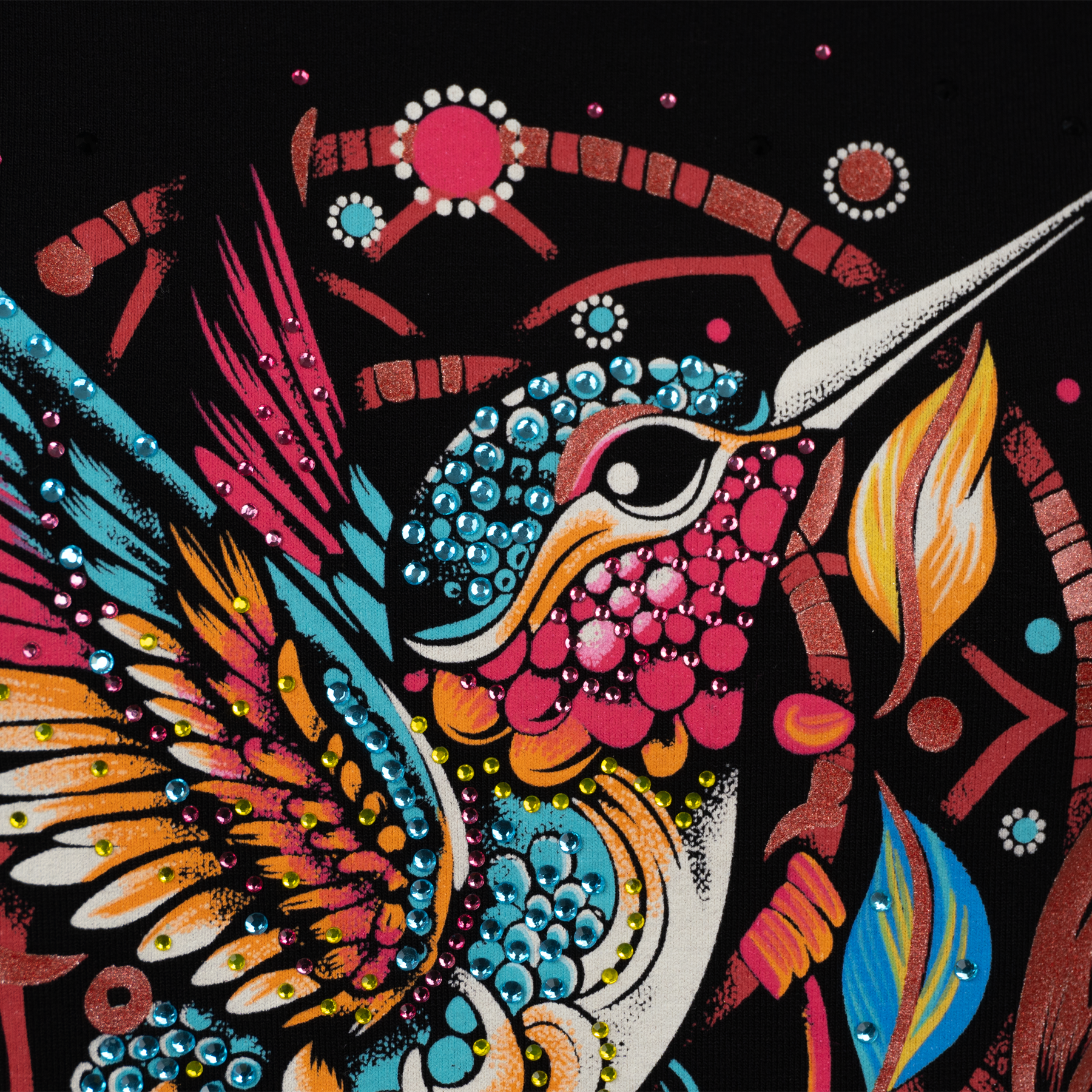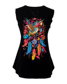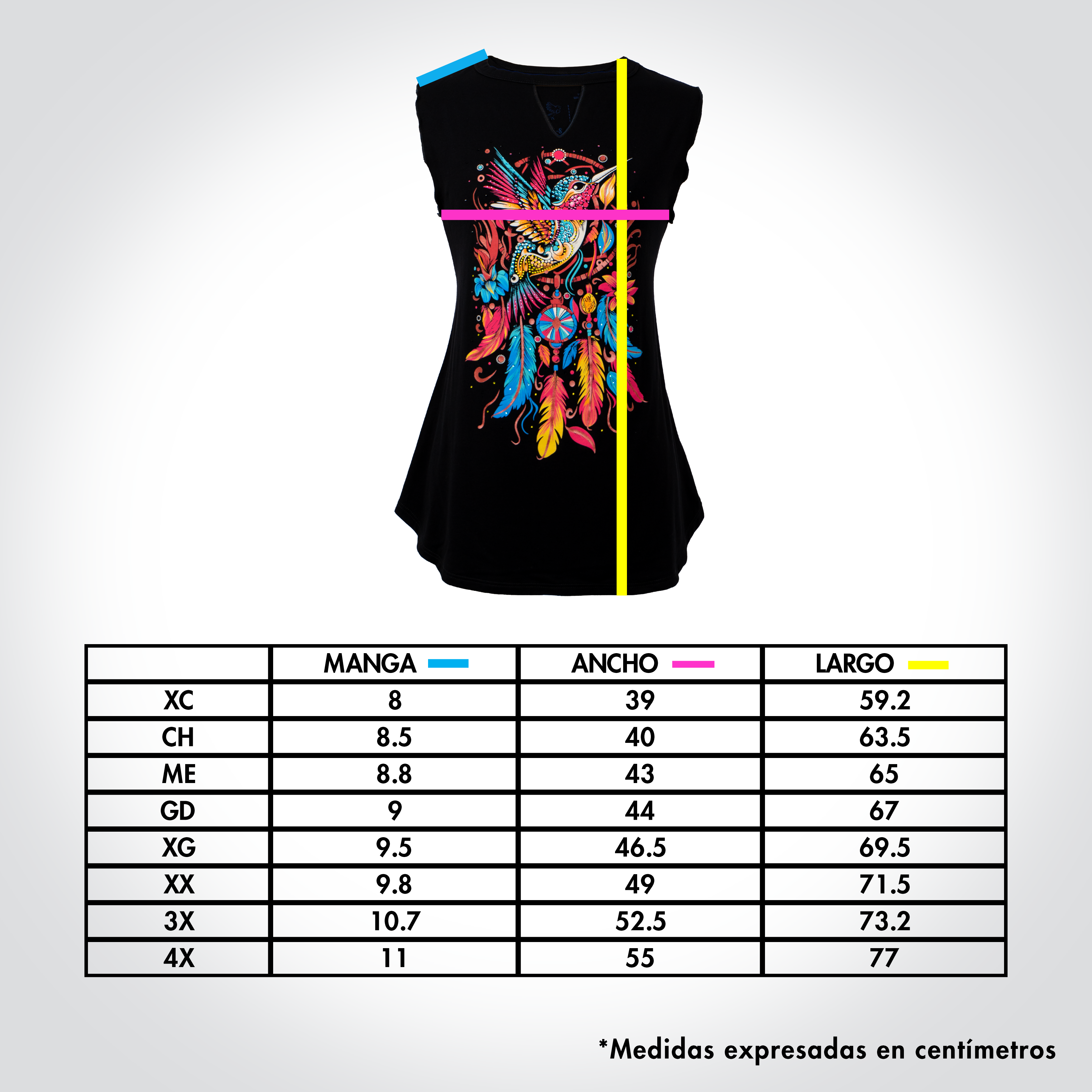 Blusón de dama, en color negro y corte sin mangas. Este diseño evoca un equilibrio entre ligereza y fortaleza, uniendo la naturaleza del colibrí con el simbolismo protector del atrapasueños en una composición rica y serena. En tonos de bronce envejecido, dándole un toque cálido, creando una armonía entre el diseño natural y el espiritual.