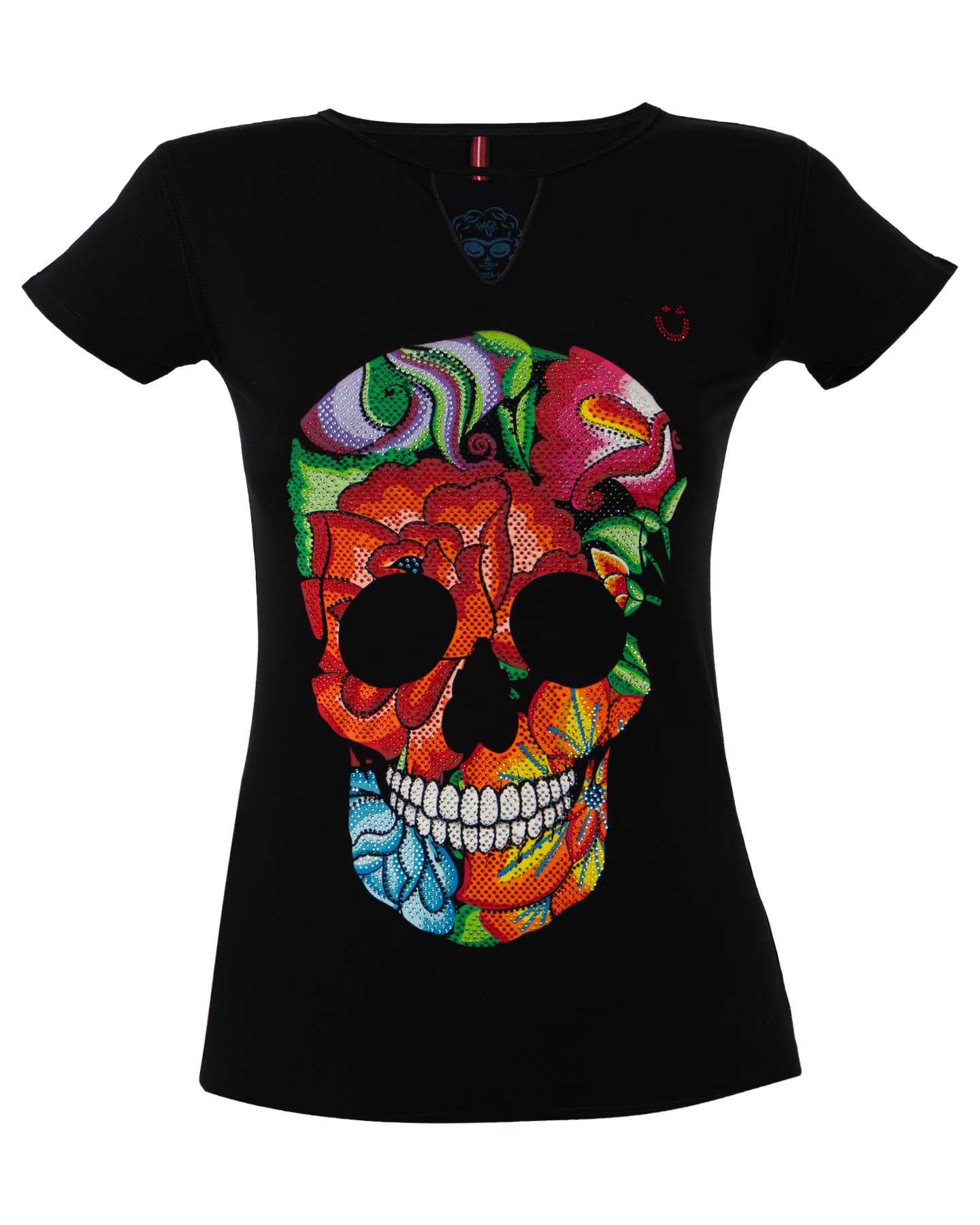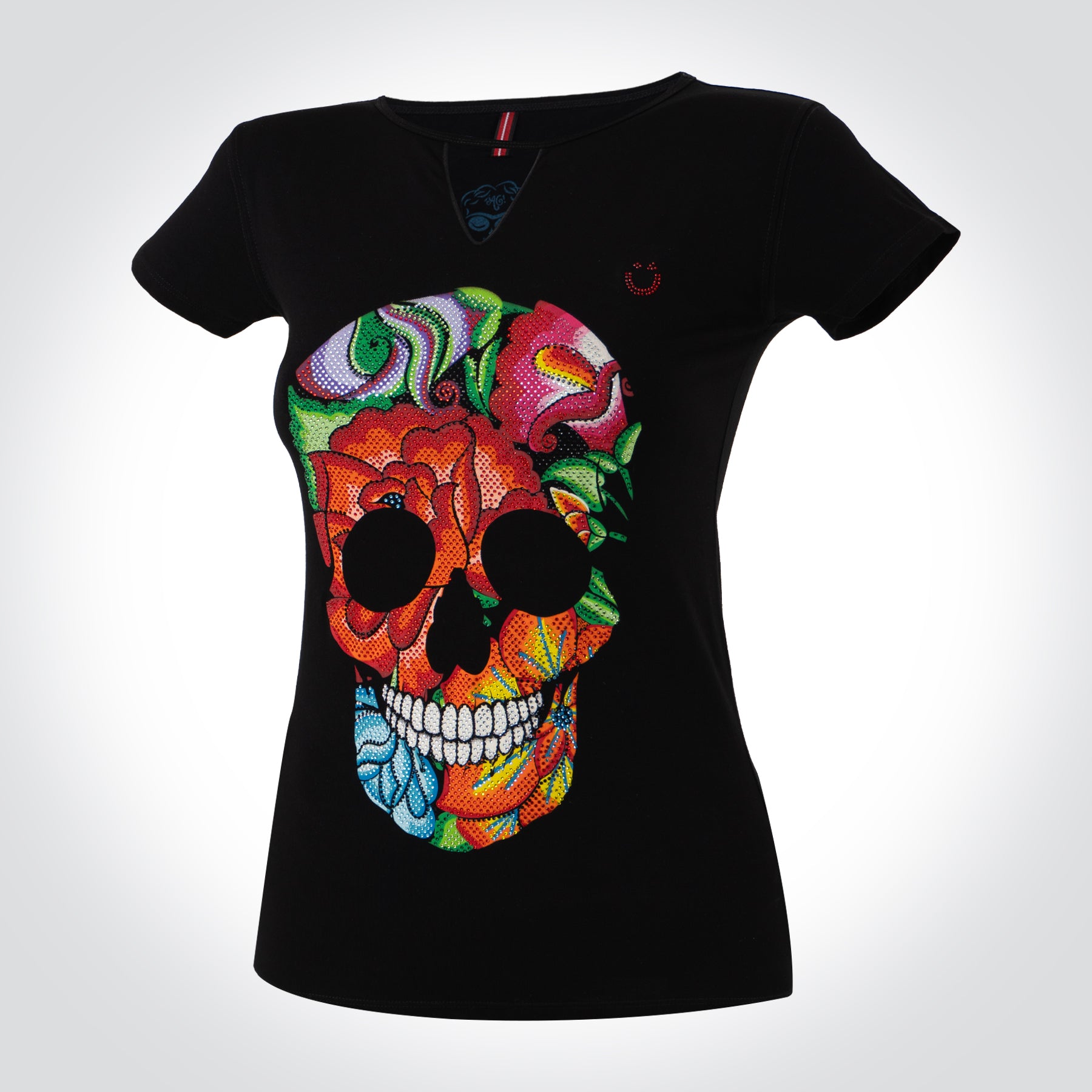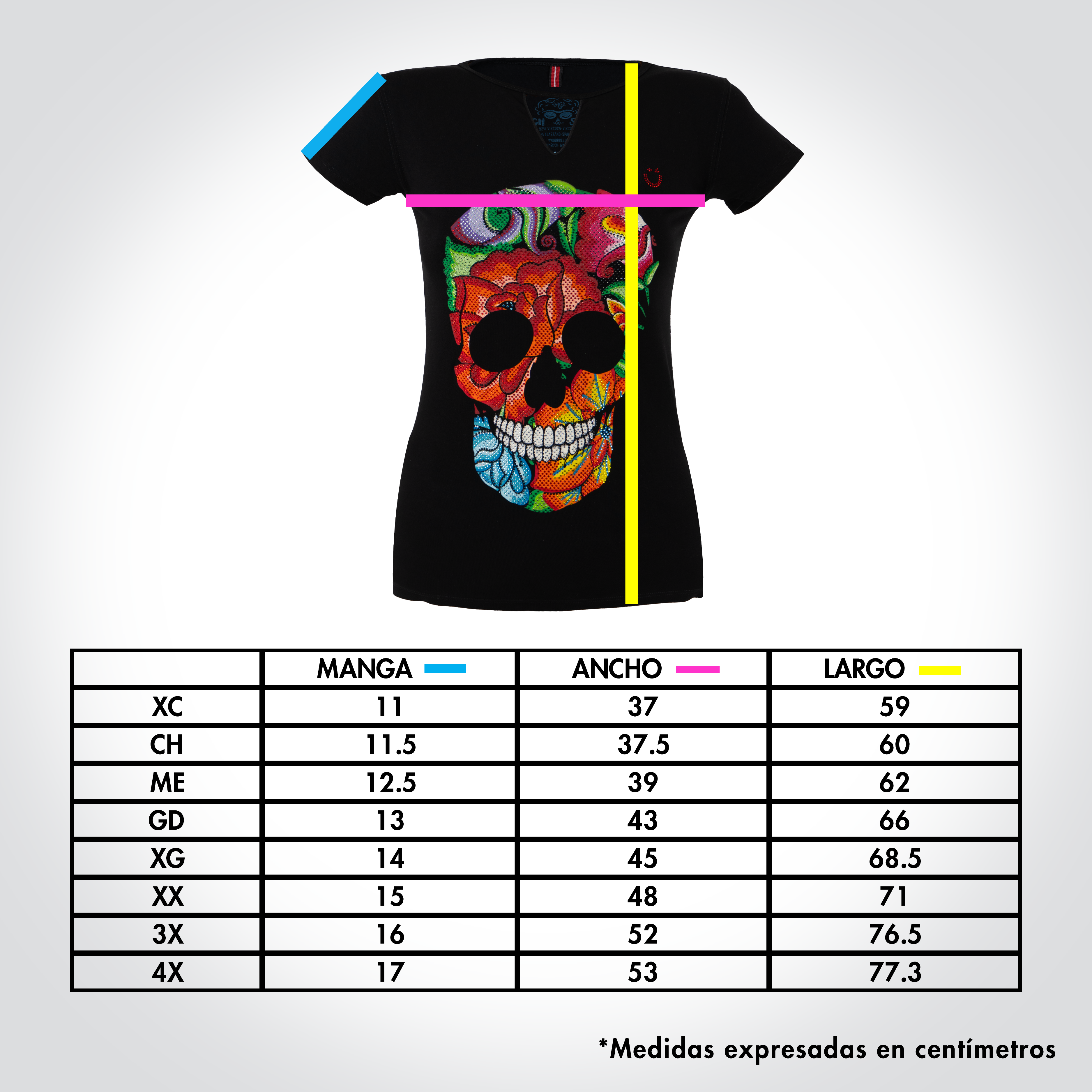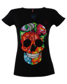 Inspirado en las flores bordadas típicas del bordado itsmeño. En este diseño se forma la calavera de azúcar con las flores y se complementó con el diseño de pedrería para llevar el gráfico al máximo nivel de detalle.