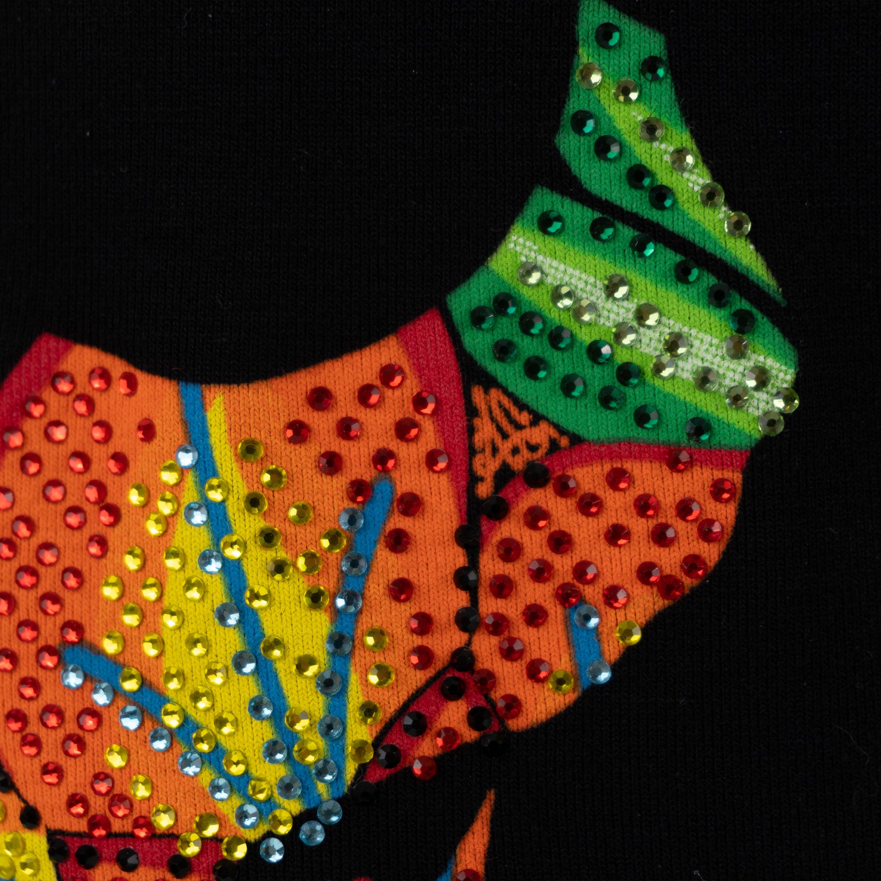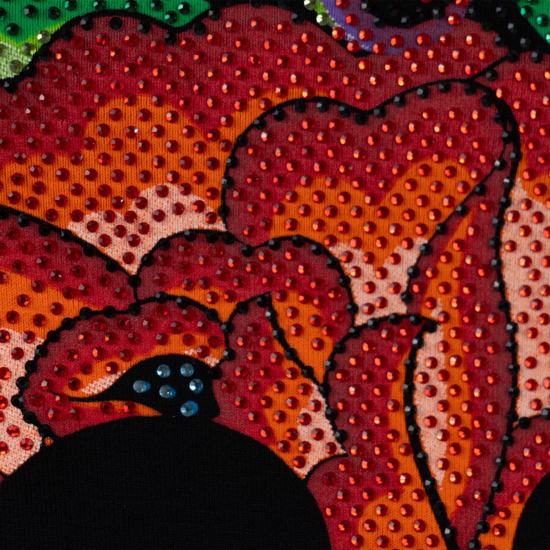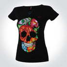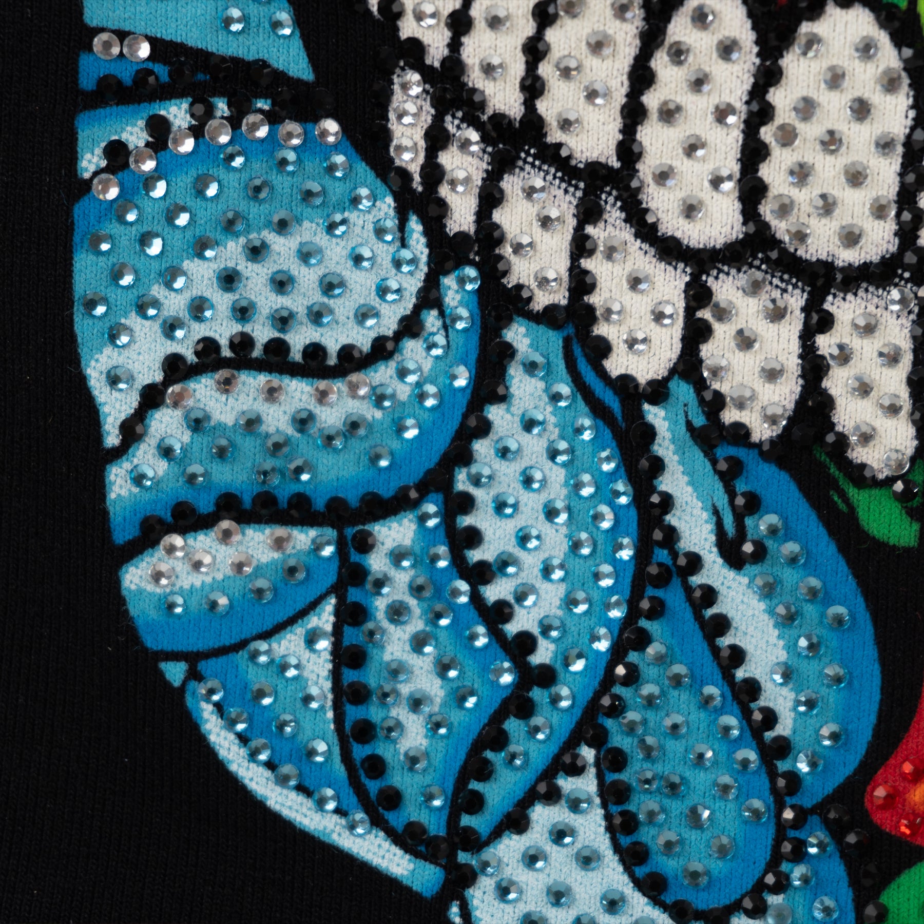 Inspirado en las flores bordadas típicas del bordado itsmeño. En este diseño se forma la calavera de azúcar con las flores y se complementó con el diseño de pedrería para llevar el gráfico al máximo nivel de detalle.