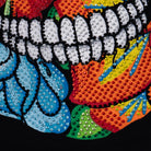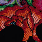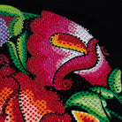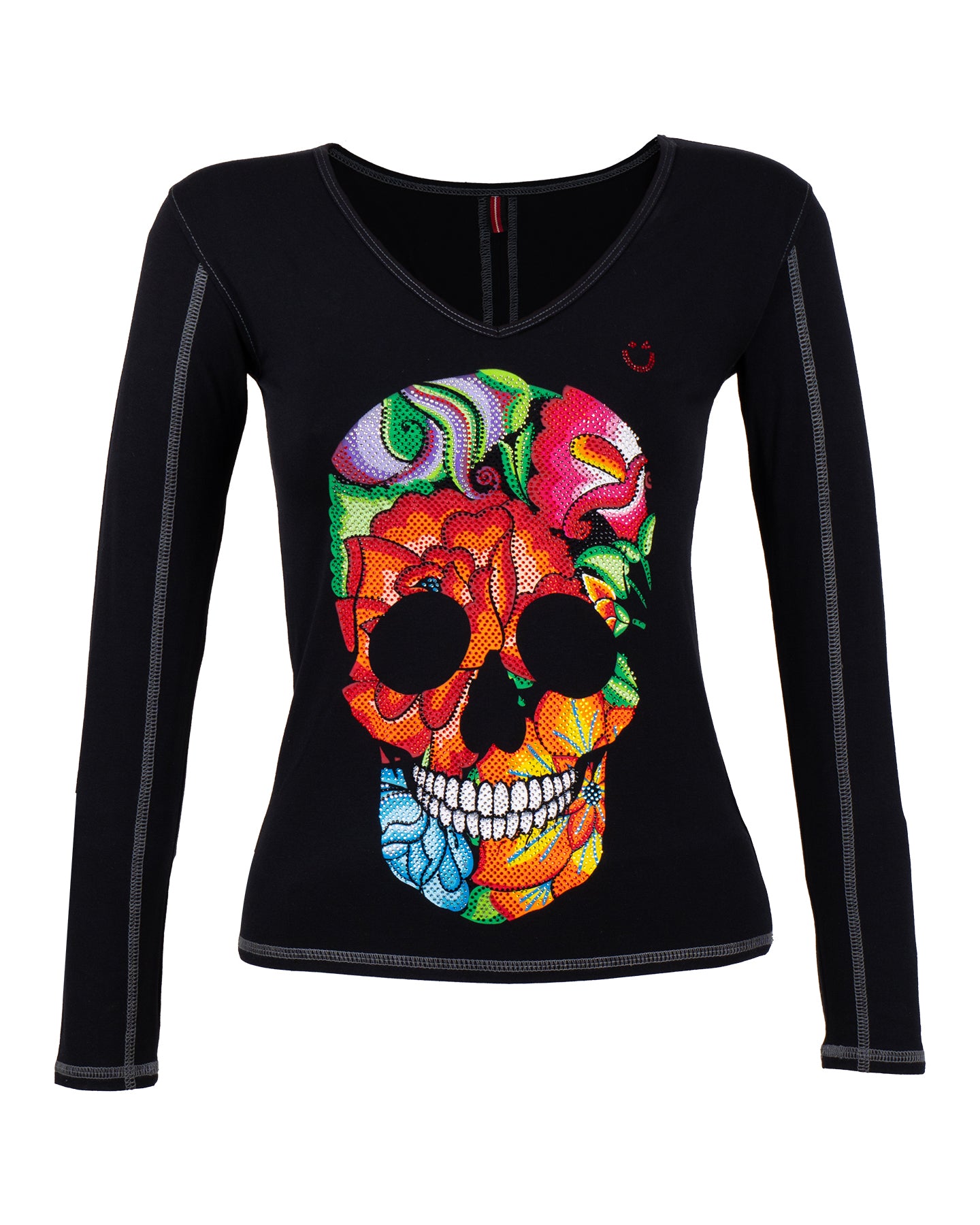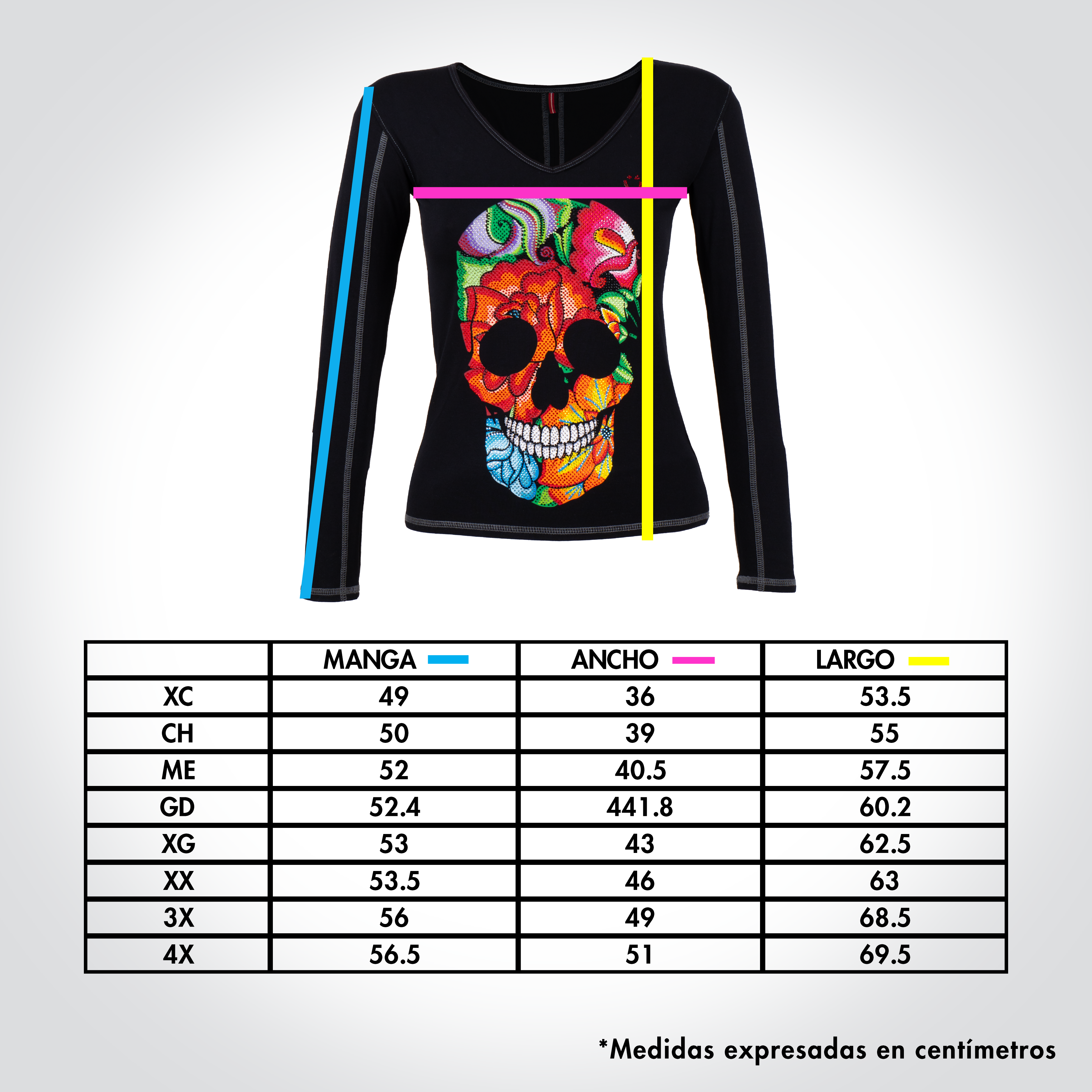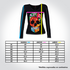 Playera de dama manga larga y cuello amplio. lnspirado en las flores bordadas picas del bordado lstmeño. En este diseño se forma la calavera de azúcar con las flores y se complementó con el diseño de pedrería para llevar el gráfico al máximo nivel de detalle.