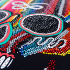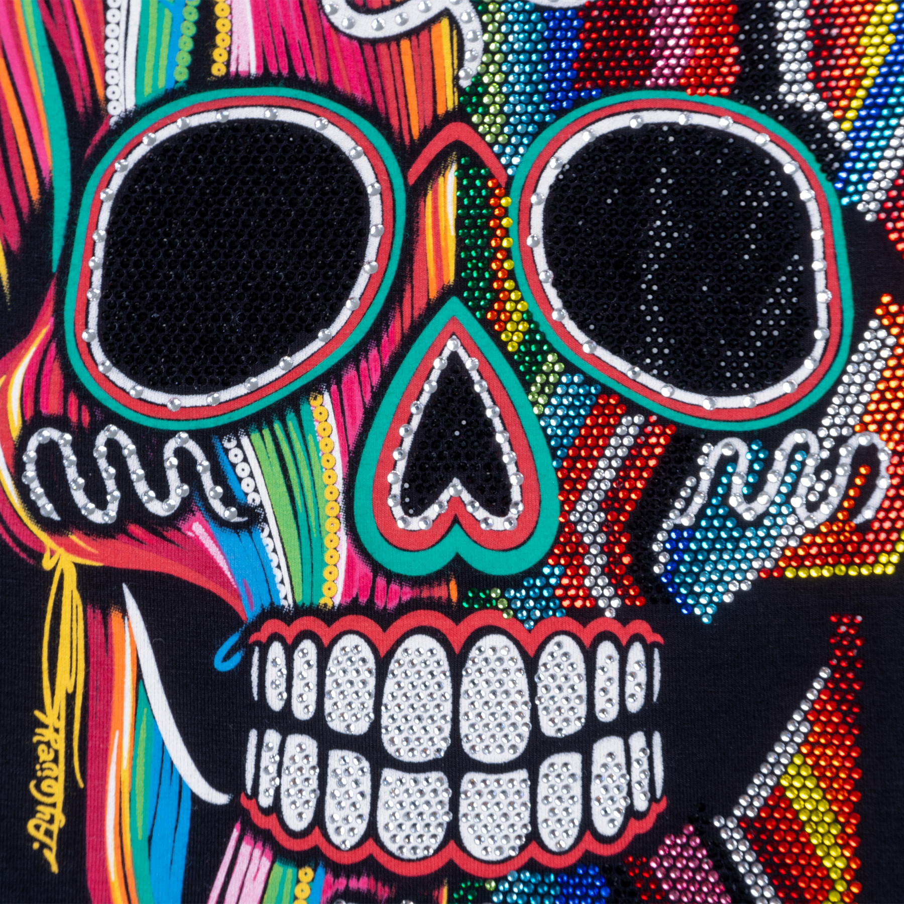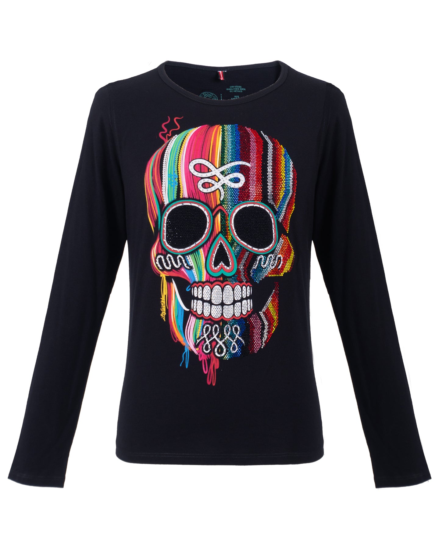 Playera de dama con manga larga, cuenta con un estampado es una calavera sonriente decorada con los vibrantes colores de un zarape mexicano. La mitad de su rostro esta adornada con brillantes piedras de colores y su nombre es en honor a La Barranca de Huentitán; también llamada Barranca de Oblatos, un área natural en el estado de Jalisco.