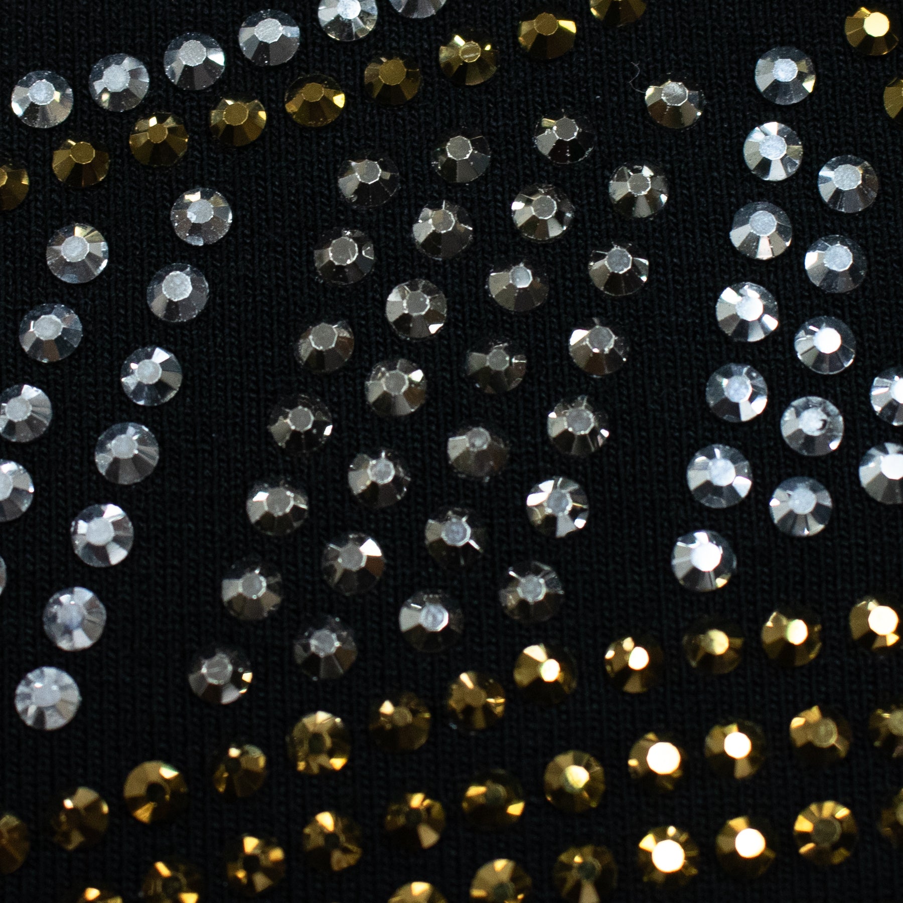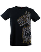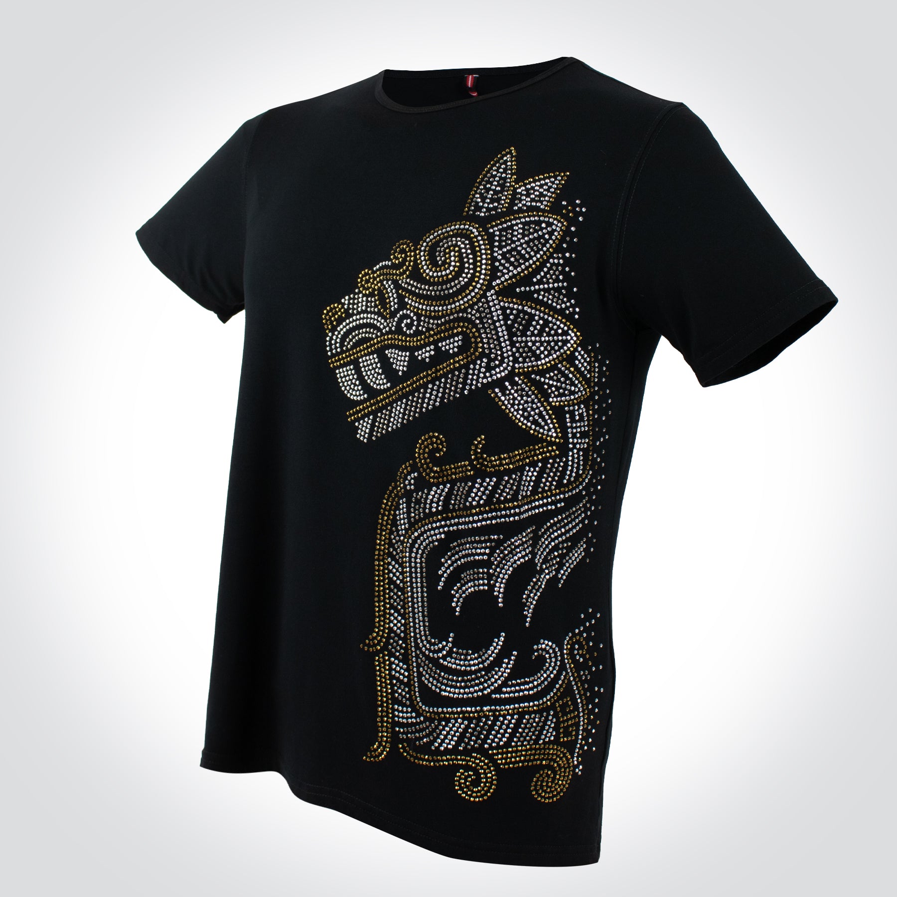 Playera negra de cuello redondo con aplicación en pedrería el diseño esta inspirando en el mítico Quetzalcóatl usa la pedrería como una metáfora de la luz y su relación con el sol.