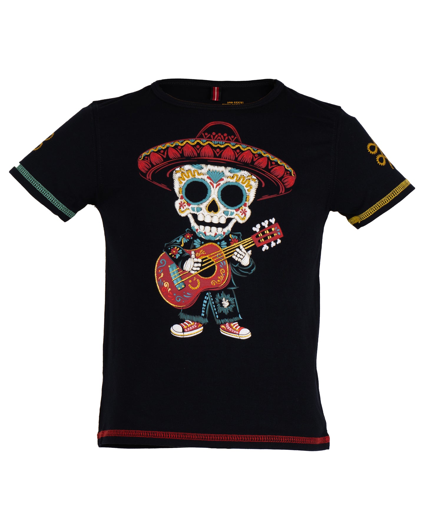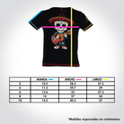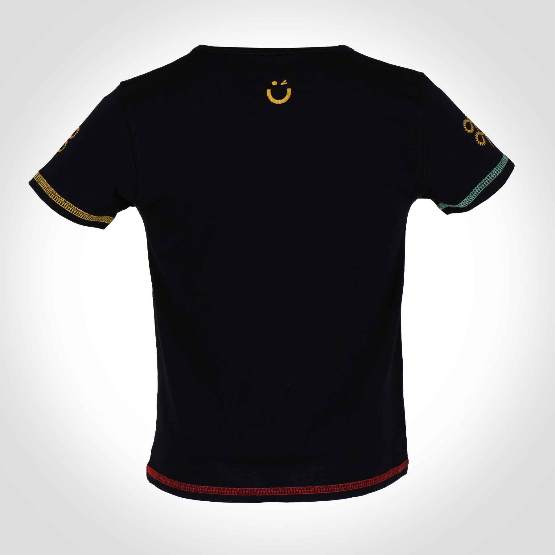 Playera de niño en color negro y detalles de costura en color con firma en flock en manga.