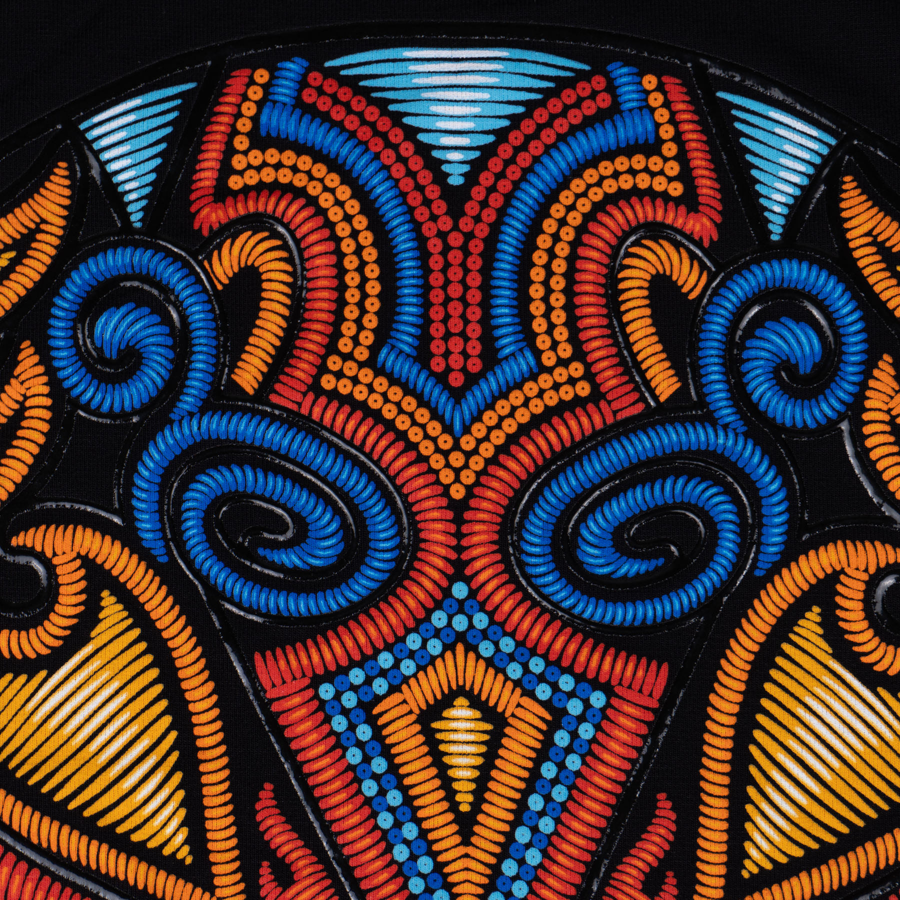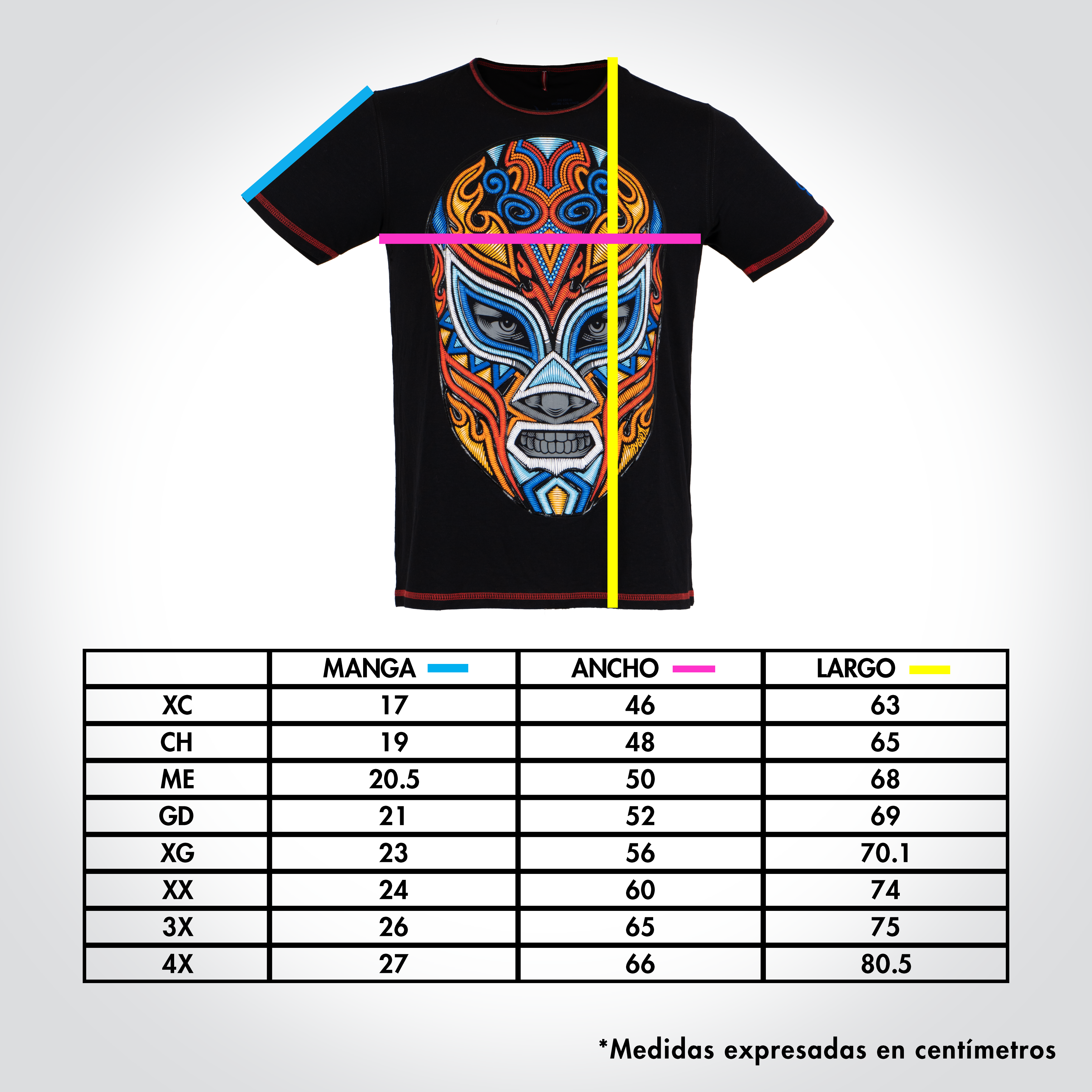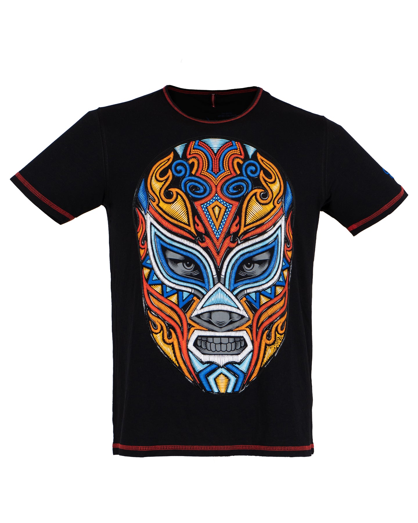 Playera de caballero en color negro inspirada en el pancracio mexicano combinado con los bordados mexicanos, ya que ambos representan la riqueza visual de México con sus colores y formas.