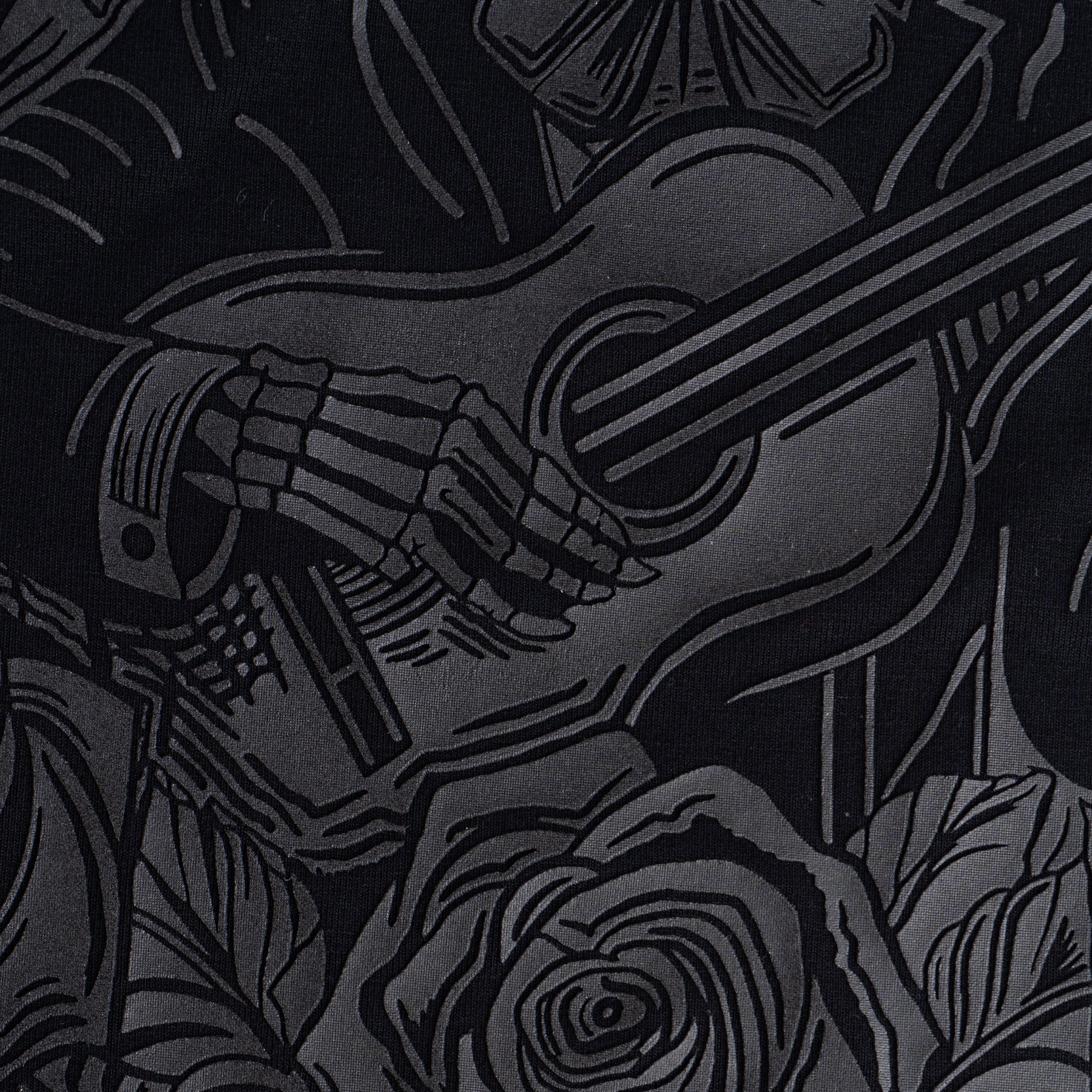 ¡Inspirada en los mariachis! Encarna la pasión y la cultura mexicana con Negra Noche. Playera de hombre, cuello redondo y diseño de charro calavera impreso en gel negro mate simulando la técnica de grabado en relieve. ¡Expresa tu amor por México con estilo y originalidad!