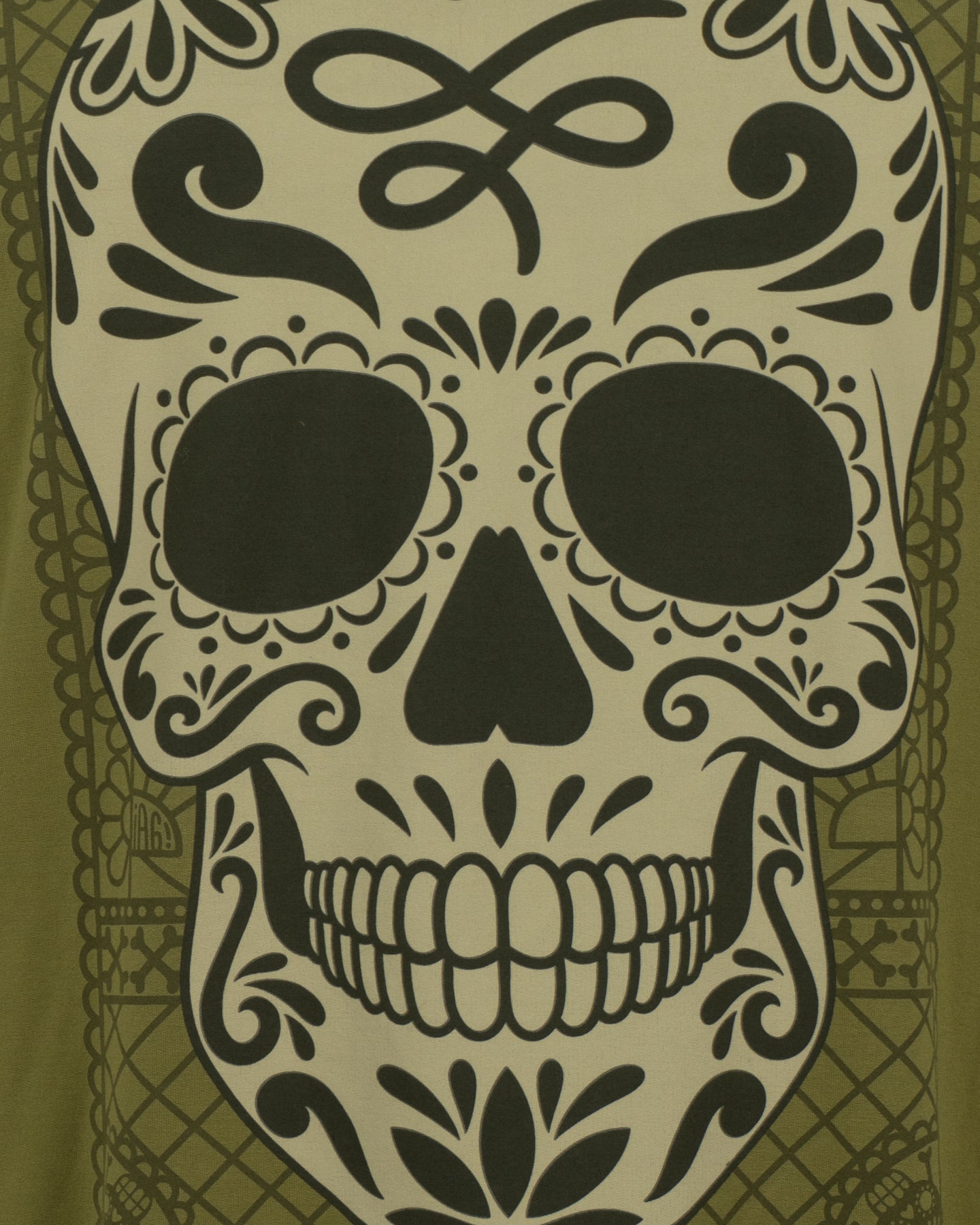 Espalda Emblemática: Una majestuosa calavera de azúcar (Catrina/Calavera Mexicana) domina la espalda, elaborada con intrincados detalles florales y filigranas, un ícono de la cultura mexicana.